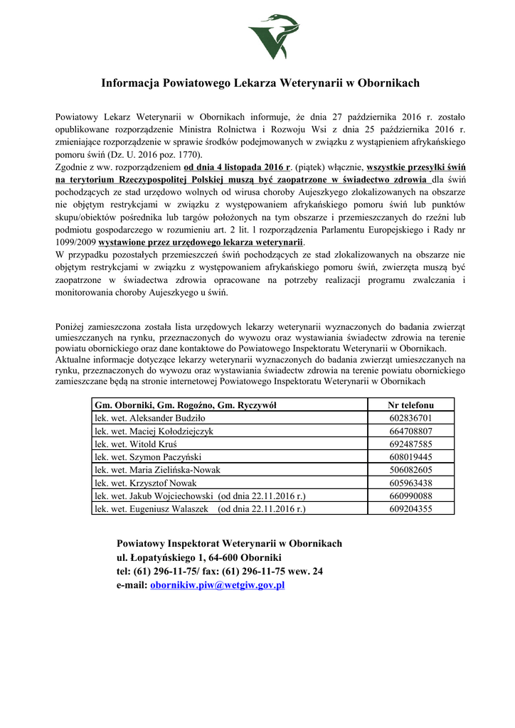 Informacja Powiatowego Lekarza Weterynarii w Obornikach Powiatowy Lekarz Weterynarii w Obornikach informuje, że dnia 27 października 2016 r. zostało opublikowane rozporządzenie Ministra Rolnictwa i Rozwoju Wsi z dnia 25 października 2016 r. zmieniające rozporządzenie w sprawie środków podejmowanych w związku z wystąpieniem afrykańskiego pomoru świń (Dz. U. 2016 poz. 1770). Zgodnie z ww. rozporządzeniem od dnia 4 listopada 2016 r. (piątek) włącznie, wszystkie przesyłki świń na terytorium Rzeczypospolitej Polskiej muszą być zaopatrzone w świadectwo zdrowia dla świń pochodzących ze stad urzędowo wolnych od wirusa choroby Aujeszkyego zlokalizowanych na obszarze nie objętym restrykcjami w związku z występowaniem afrykańskiego pomoru świń lub punktów skupu/obiektów pośrednika lub targów położonych na tym obszarze i przemieszczanych do rzeźni lub podmiotu gospodarczego w rozumieniu art. 2 lit. l rozporządzenia Parlamentu Europejskiego i Rady nr 1099/2009 wystawione przez urzędowego lekarza weterynarii. W przypadku pozostałych przemieszczeń świń pochodzących ze stad zlokalizowanych na obszarze nie objętym restrykcjami w związku z występowaniem afrykańskiego pomoru świń, zwierzęta muszą być zaopatrzone w świadectwa zdrowia opracowane na potrzeby realizacji programu zwalczania i monitorowania choroby Aujeszkyego u świń. Poniżej zamieszczona została lista urzędowych lekarzy weterynarii wyznaczonych do badania zwierząt umieszczanych na rynku, przeznaczonych do wywozu oraz wystawiania świadectw zdrowia na terenie powiatu obornickiego oraz dane kontaktowe do Powiatowego Inspektoratu Weterynarii w Obornikach. Aktualne informacje dotyczące lekarzy weterynarii wyznaczonych do badania zwierząt umieszczanych na rynku, przeznaczonych do wywozu oraz wystawiania świadectw zdrowia na terenie powiatu obornickiego zamieszczane będą na stronie internetowej Powiatowego Inspektoratu Weterynarii w Obornikach Gm. Oborniki, Gm. Rogoźno, Gm. Ryczywół lek. wet. Aleksander Budziło lek. wet. Maciej Kołodziejczyk lek. wet. Witold Kruś lek. wet. Szymon Paczyński lek. wet. Maria Zielińska-Nowak lek. wet. Krzysztof Nowak lek. wet. Jakub Wojciechowski (od dnia 22.11.2016 r.) lek. wet. Eugeniusz Walaszek (od dnia 22.11.2016 r.) Powiatowy Inspektorat Weterynarii w Obornikach ul. Łopatyńskiego 1, 64-600 Oborniki tel: (61) 296-11-75/ fax: (61) 296-11-75 wew. 24 e-mail: [email protected] Nr telefonu 602836701 664708807 692487585 608019445 506082605 605963438 660990088 609204355