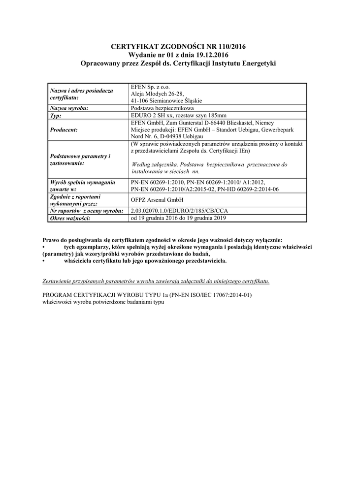CERTYFIKAT ZGODNOŚCI NR 110/2016 Wydanie nr 01 z dnia 19.12.2016 Opracowany przez Zespół ds. Certyfikacji Instytutu Energetyki Nazwa i adres posiadacza certyfikatu: Nazwa wyrobu: Typ: Producent: Podstawowe parametry i zastosowanie: Wyrób spełnia wymagania zawarte w: Zgodnie z raportami wykonanymi przez: Nr raportów z oceny wyrobu: Okres ważności: EFEN Sp. z o.o. Aleja Młodych 26-28, 41-106 Siemianowice Śląskie Podstawa bezpiecznikowa EDURO 2 SH xx, rozstaw szyn 185mm EFEN GmbH, Zum Gunterstal D-66440 Blieskastel, Niemcy Miejsce produkcji: EFEN GmbH – Standort Uebigau, Gewerbepark Nord Nr. 6, D-04938 Uebigau (W sprawie poświadczonych parametrów urządzenia prosimy o kontakt z przedstawicielami Zespołu ds. Certyfikacji IEn) Według załącznika. Podstawa bezpiecznikowa przeznaczona do instalowania w sieciach nn. PN-EN 60269-1:2010, PN-EN 60269-1:2010/ A1:2012, PN-EN 60269-1:2010/A2:2015-02, PN-HD 60269-2:2014-06 OFPZ Arsenal GmbH 2.03.02070.1.0/EDURO/2/185/CB/CCA od 19 grudnia 2016 do 19 grudnia 2019 Prawo do posługiwania się certyfikatem zgodności w okresie jego ważności dotyczy wyłącznie: • tych egzemplarzy, które spełniają wyżej określone wymagania i posiadają identyczne właściwości (parametry) jak wzory/próbki wyrobów przedstawione do badań, • właściciela certyfikatu lub jego upoważnionego przedstawiciela. Zestawienie przypisanych parametrów wyrobu zawierają załączniki do niniejszego certyfikatu. PROGRAM CERTYFIKACJI WYROBU TYPU 1a (PN-EN ISO/IEC 17067:2014-01) właściwości wyrobu potwierdzone badaniami typu