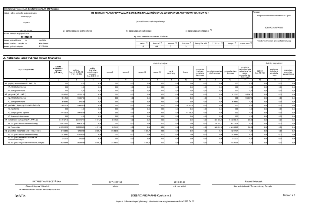 Ministerstwo Finansów, ul. Świętokrzyska 12, 00-916 Warszawa Adresat: Rb-N KWARTALNE SPRAWOZDANIE O STANIE NALEŻNOŚCI ORAZ WYBRANYCH AKTYWÓW FINANSOWYCH Nazwa i adres jednostki sprawozdawczej Regionalna Izba Obrachunkowa w Opolu jednostki samorządu terytorialnego 8DEBAD3AB2FA7999 a) sprawozdanie jednostkowe b) sprawozdanie zbiorcze c) sprawozdanie łączne Numer identyfikacyjny REGON wg stanu na koniec IV kwartału 2015 roku 531412993 Nazwa województwa opolskie Nazwa powiatu / związku kluczborski WOJ. POWIAT GMINA TYP GM. Nazwa gminy / związku BYCZYNA 16 04 01 3 Przed wypełnieniem przeczytać instrukcję ZWIĄZEK JST TYP ZW. Grupa część budż. ogółem (kol. 16+17) podmoty należące do strefy euro pozostałe podmioty zagraniczne 15 16 17 A. Należności oraz wybrane aktywa finansowe dłużnicy zagraniczni dłużnicy krajowi W yszczególnienie 1 kwota należności ogółem (kol.3+15) 2 ogółem (kol. 4+9+10+11 +12+13+14) sektor finansów publicznych ogólem (kol.5+6+7+8) grupa I grupa II grupa III grupa IV bank centralny banki pozostałe krajowe instytucje finansowe przedsiębiorstwa niefinansowe gospodarstwa domowe instytucje niekomercyjne działające na rzecz gospodarstw domowych 3 4 5 6 7 8 9 10 11 12 13 14 N1 papiery wartościowe (N1.1+N1.2) N1.1 krótkoterminowe N1.2 długoterminowe N2 pożyczki (N2.1+N2,2) N2.1 krótkoterminowe N2.2 długoterminowe N3 gotówka i depozyty (N3.1+N3.2+N3.3) N3.1 gotówka N3.2 depozyty na żądanie N3.3 depozyty terminowe N4 należności wymagalne (N4.1+N4.2) N4.1 z tytułu dostaw towarów i usług N4.2 pozostałe N5 pozostałe należności (N5.1+N5.2+N5.3) N5.1 z tytułu dostaw towarów i usług N5.2 z tytułu podatków i składek na ubezpieczenia społ. N5.3 z tytułu innych niż wymienione powyżej KATARZYNA WILCZYŃSKA Główny Księgowy */ Skarbnik BeSTia 077 4134150 2016-03-23 telefon rok m-c dzień 8DEBAD3AB2FA7999 Korekta nr 2 Kopia z dokumentu podpisanego elektronicznie wygenerowana dnia 2016.04.12 Robert Świerczek Kierownik jednostki / Przewodniczący Zarządu Strona 1 z 3 B. Należności z tytułu udzielonych poręczeń i gwarancji dłużnicy W y szczególnienie 1 kwota należności ogółem (kol. 3+8) podmioty sektora finansów publicznych (kol.4+5+6+7) 2 grupa I 3 grupa II 4 grupa III 5 pozostałe podmioty grupa IV 6 7 8 B1 należność główna z tytułu udzielonych gwarancji i poręczeń 0,00 0,00 0,00 0,00 0,00 0,00 0,00 B2 odsetki ustawowe od należności głównej z tytułu udzielonych gwarancji i poręczeń 0,00 0,00 0,00 0,00 0,00 0,00 0,00 B3 wartość spłat dokonanych w okresie sprawozdawczym za dłużników z tytułu udzielonych poręczeń i gwarancji (wydatki) 0,00 0,00 0,00 0,00 0,00 0,00 0,00 B4 kwota odzyskanych wierzytelności w okresie sprawozdawczym od dłużników z tytułu poręczeń lub gwarancji (dochody) 0,00 0,00 0,00 0,00 0,00 0,00 0,00 KATARZYNA WILCZYŃSKA Główny Księgowy */ Skarbnik 077 4134150 telefon 2016-03-23 rok m-c dzień Robert Świerczek Kierownik jednostki / Przewodniczący Zarządu 8DEBAD3AB2FA7999 Korekta nr 2 BeSTia Strona 2 z 3 Kopia z dokumentu podpisanego elektronicznie wygenerowana dnia 2016.04.12 KATARZYNA WILCZYŃSKA Główny Księgowy */ Skarbnik 077 4134150 telefon 2016-03-23 rok m-c dzień Robert Świerczek Kierownik jednostki / Przewodniczący Zarządu 8DEBAD3AB2FA7999 Korekta nr 2 Strona 3 z 3 BeSTia Kopia z dokumentu podpisanego elektronicznie wygenerowana dnia 2016.04.12