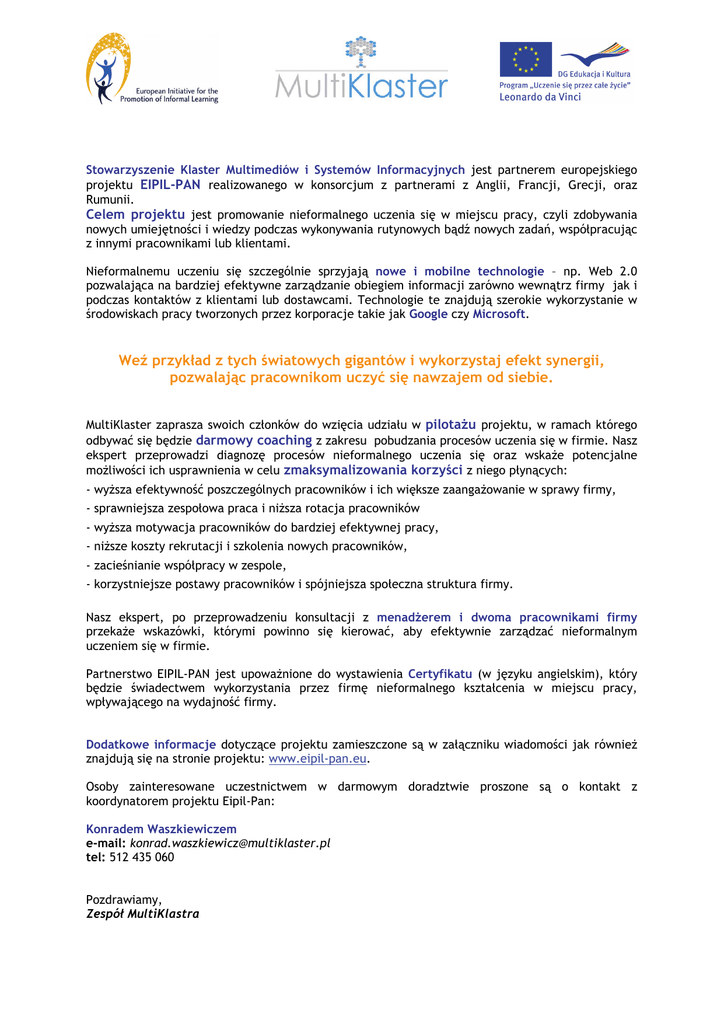 Stowarzyszenie Klaster Multimediów i Systemów Informacyjnych jest partnerem europejskiego projektu EIPIL-PAN realizowanego w konsorcjum z partnerami z Anglii, Francji, Grecji, oraz Rumunii. Celem projektu jest promowanie nieformalnego uczenia się w miejscu pracy, czyli zdobywania nowych umiejętności i wiedzy podczas wykonywania rutynowych bądź nowych zadań, współpracując z innymi pracownikami lub klientami. Nieformalnemu uczeniu się szczególnie sprzyjają nowe i mobilne technologie – np. Web 2.0 pozwalająca na bardziej efektywne zarządzanie obiegiem informacji zarówno wewnątrz firmy jak i podczas kontaktów z klientami lub dostawcami. Technologie te znajdują szerokie wykorzystanie w środowiskach pracy tworzonych przez korporacje takie jak Google czy Microsoft. Weź przykład z tych światowych gigantów i wykorzystaj efekt synergii, pozwalając pracownikom uczyć się nawzajem od siebie. MultiKlaster zaprasza swoich członków do wzięcia udziału w pilotażu projektu, w ramach którego odbywać się będzie darmowy coaching z zakresu pobudzania procesów uczenia się w firmie. Nasz ekspert przeprowadzi diagnozę procesów nieformalnego uczenia się oraz wskaże potencjalne możliwości ich usprawnienia w celu zmaksymalizowania korzyści z niego płynących: - wyższa efektywność poszczególnych pracowników i ich większe zaangażowanie w sprawy firmy, - sprawniejsza zespołowa praca i niższa rotacja pracowników - wyższa motywacja pracowników do bardziej efektywnej pracy, - niższe koszty rekrutacji i szkolenia nowych pracowników, - zacieśnianie współpracy w zespole, - korzystniejsze postawy pracowników i spójniejsza społeczna struktura firmy. Nasz ekspert, po przeprowadzeniu konsultacji z menadżerem i dwoma pracownikami firmy przekaże wskazówki, którymi powinno się kierować, aby efektywnie zarządzać nieformalnym uczeniem się w firmie. Partnerstwo EIPIL-PAN jest upoważnione do wystawienia Certyfikatu (w języku angielskim), który będzie świadectwem wykorzystania przez firmę nieformalnego kształcenia w miejscu pracy, wpływającego na wydajność firmy. Dodatkowe informacje dotyczące projektu zamieszczone są w załączniku wiadomości jak również znajdują się na stronie projektu: www.eipil-pan.eu. Osoby zainteresowane uczestnictwem w darmowym doradztwie proszone są o kontakt z koordynatorem projektu Eipil-Pan: Konradem Waszkiewiczem e-mail: [email protected] tel: 512 435 060 Pozdrawiamy, Zespół MultiKlastra