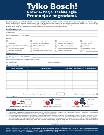 Dziękujemy za zakup produktów Bosch z serii dla profesjonalistów i udział w naszej promocji. Prosimy o uważne, pełne i czytelne wypełnienie niniejszego formularza - od tego zależy, jak szybko zostanie wysłana wybrana nagroda. Proszę pamiętać o dołączeniu kopii dowodu zakupu, swoich danych kontaktowych oraz podpisaniu deklaracji o przetwarzaniu danych osobowych. Nasza promocja nadal trwa - każdy kolejny zakup może być premiowany nagrodą. Zapraszamy! Profesjonaliści Profesjonalistom. Dane firmy uczestnika Nazwa firmy: Adres firmy (ulica z nr, kod, miasto): Branża: Dekarstwo/ciesielstwo Układanie podłóg - płytki Budownictwo naziemne Montaż innych pojazdów Stolarstwo Układanie podłóg - drewno Budownictwo podziemne Budowa maszyn Produkcja mebli/przemysł meblowy Instalacja elektryczna Pozostałe prace budowlane Ślusarstwo Pozostała obróbka drewna Hydraulika Sprzedaż/naprawa samochodów Obróbka stali i metalu Malarstwo/lakiernictwo Technika grzewcza i wentylacyjna Przemysł samochodowy Inne: Dane uczestnika Pan Pani Imię, nazwisko: Adres korespondencyjny (ulica z nr, kod, miasto): tel. kontaktowy: e-mail kontaktowy: Zgłoszenie zakupu narzędzi Bosch Numer katalogowy Nazwa narzędzia ilość sztuk Kod aktywacyjny karty gwarancyjnej * W przypadku zgłaszania większej ilości narzędzi prosimy o dołączenie stosownych informacji, jak w tabeli powyżej. Deklarowana łączna ilość punktów bonusowych Załączam kopię dowodu zakupu Wybór nagrody ilość sztuk Wiha zestaw narzędzi ręcznych ilość sztuk GSR 10,8-2-LI Professional ilość sztuk GAS 1200 L Professional Oświadczenia i deklaracje Oświadczam, że zapoznałem/am się i akceptuję Regulamin promocji „Tylko Bosch! Drewno. Pasja. Technologia. Promocja z nagrodami.”, którego pełna treść jest dostępna na stronie internetowej „www.bonus2011.real-bosch.com/pl”. Zgadzam się na przechowywanie, przetwarzanie i wykorzystywanie moich danych osobowych w celu dopełnienia procedur promocji „Tylko Bosch! Drewno. Pasja. Technologia. Promocja z nagrodami.” oraz informowania mnie o produktach i usługach w przyszłości. Mam prawo wglądu w informacje dotyczące mojej osoby, będące w posiadaniu Grupy Robert Bosch, Power Tools, 71518 Backnang, Niemcy. W każdej chwili mam możliwość wycofania zgody na dysponowanie moimi danymi przez Grupę Bosch, pod podanym wyżej adresem. Wyrażam zgodę na to, by również wybrani, lokalni dystrybutorzy Bosch informowali mnie o produktach i usługach, oraz na dalsze przekazywanie moich danych osobowych w tym celu. Data, podpis: Czytelnie wypełnione, kompletne zgłoszenie wraz z dowodem zakupu należy przesłać pocztą tradycyjną, faksem lub w postaci elektronicznej na adres Partnera Administrującego promocją: RITF advnet Polska Sp. z o.o., ul. Szkolna 164, 05-110 Jabłonna, faks: 22 4341 851, mail: [email protected] Aktualne informacje dot. promocji znajdują się na stronie internetowej www.bonus2011.real-bosch.com/pl. W każdym wypadku pomocy i informacji udziela także infolinia pod numerem telefonu 22 67 67 937 lub 515 433 459 w godz. od 8.30 – 17.30.