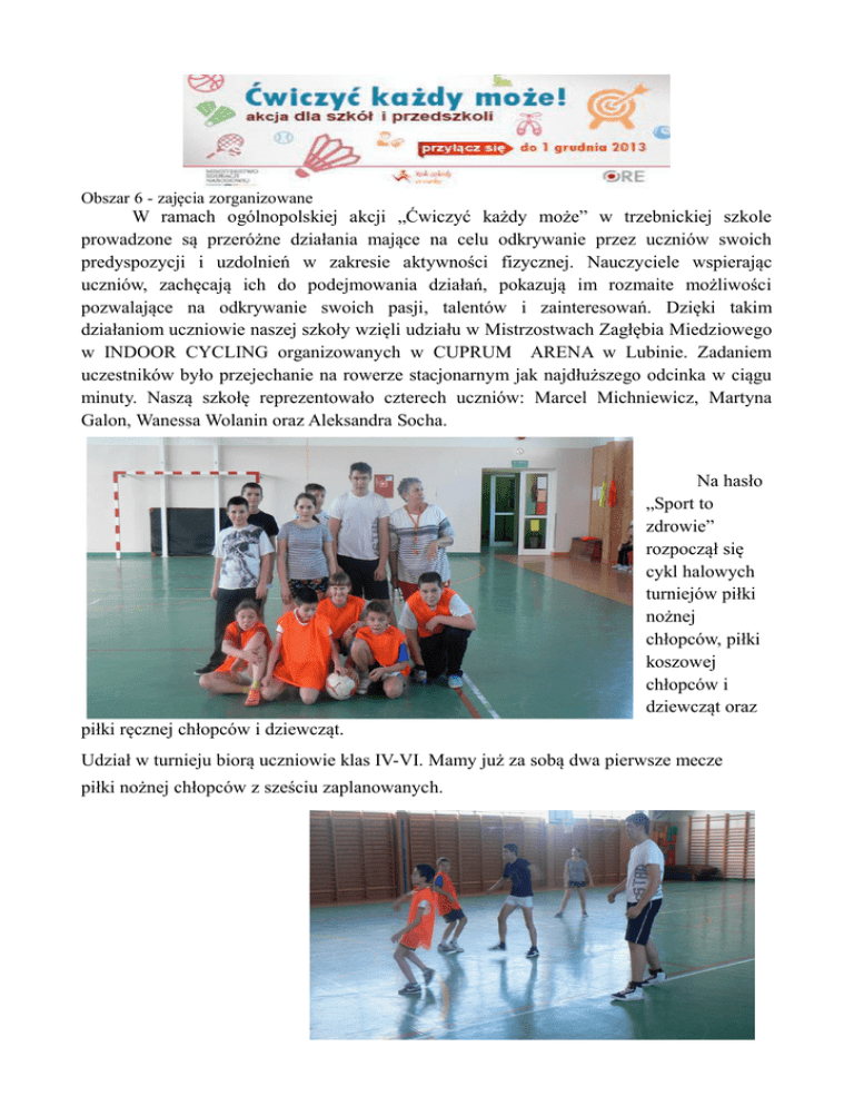 Obszar 6 - zajęcia zorganizowane W ramach ogólnopolskiej akcji „Ćwiczyć każdy może” w trzebnickiej szkole prowadzone są przeróżne działania mające na celu odkrywanie przez uczniów swoich predyspozycji i uzdolnień w zakresie aktywności fizycznej. Nauczyciele wspierając uczniów, zachęcają ich do podejmowania działań, pokazują im rozmaite możliwości pozwalające na odkrywanie swoich pasji, talentów i zainteresowań. Dzięki takim działaniom uczniowie naszej szkoły wzięli udziału w Mistrzostwach Zagłębia Miedziowego w INDOOR CYCLING organizowanych w CUPRUM ARENA w Lubinie. Zadaniem uczestników było przejechanie na rowerze stacjonarnym jak najdłuższego odcinka w ciągu minuty. Naszą szkołę reprezentowało czterech uczniów: Marcel Michniewicz, Martyna Galon, Wanessa Wolanin oraz Aleksandra Socha. Na hasło „Sport to zdrowie” rozpoczął się cykl halowych turniejów piłki nożnej chłopców, piłki koszowej chłopców i dziewcząt oraz piłki ręcznej chłopców i dziewcząt. Udział w turnieju biorą uczniowie klas IV-VI. Mamy już za sobą dwa pierwsze mecze piłki nożnej chłopców z sześciu zaplanowanych. Dla tych, którzy wolą sporty na świeżym powietrzu zorganizowano wyjazd na lodowisko do Ośrodka Sportu i Rekreacji w Lubinie. Wyjazd cieszył się wielkim zainteresowaniem, dlatego już teraz planujemy kolejne.