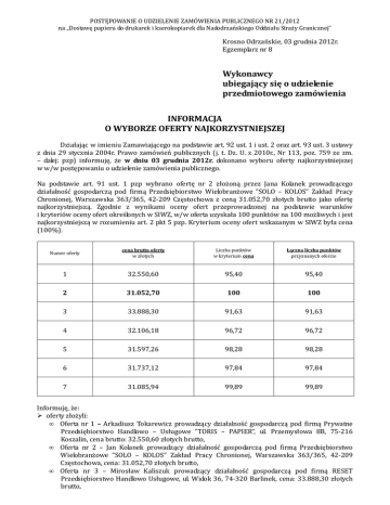 POSTĘPOWANIE O UDZIELENIE ZAMÓWIENIA PUBLICZNEGO NR 21/2012 na „Dostawę papieru do drukarek i kserokopiarek dla Nadodrzańskiego Oddziału Straży Granicznej” Krosno Odrzańskie, 03 grudnia 2012r. Egzemplarz nr 8 Wykonawcy ubiegający się o udzielenie przedmiotowego zamówienia INFORMACJA O WYBORZE OFERTY NAJKORZYSTNIEJSZEJ Działając w imieniu Zamawiającego na podstawie art. 92 ust. 1 i ust. 2 oraz art. 93 ust. 3 ustawy z dnia 29 stycznia 2004r. Prawo zamówień publicznych (j. t. Dz. U. z 2010r., Nr 113, poz. 759 ze zm. – dalej: pzp) informuję, że w dniu 03 grudnia 2012r. dokonano wyboru oferty najkorzystniejszej w w/w postępowaniu o udzielenie zamówienia publicznego. Na podstawie art. 91 ust. 1 pzp wybrano ofertę nr 2 złożoną przez Jana Kolanek prowadzącego działalność gospodarczą pod firmą Przedsiębiorstwo Wielobranżowe ”SOLO – KOLOS” Zakład Pracy Chronionej, Warszawska 363/365, 42-209 Częstochowa z ceną 31.052,70 złotych brutto jako ofertę najkorzystniejszą. Zgodnie z wynikami oceny ofert przeprowadzonej na podstawie warunków i kryteriów oceny ofert określonych w SIWZ, w/w oferta uzyskała 100 punktów na 100 możliwych i jest najkorzystniejszą w rozumieniu art. 2 pkt 5 pzp. Kryterium oceny ofert wskazanym w SIWZ była cena (100%). Numer oferty cena brutto oferty w złotych Liczba punktów w kryterium cena Łączna liczba punktów przyznanych ofercie 1 32.550,60 95,40 95,40 2 31.052,70 100 100 3 33.888,30 91,63 91,63 4 32.106,18 96,72 96,72 5 31.597,26 98,28 98,28 6 31.737,12 97,84 97,84 7 31.085,94 99,89 99,89 Informuję, że: oferty złożyli: • Oferta nr 1 – Arkadiusz Tokarewicz prowadzący działalność gospodarczą pod firmą Prywatne Przedsiębiorstwo Handlowo – Usługowe ”TORIS – PAPIER”, ul. Przemysłowa 8B, 75-216 Koszalin, cena brutto: 32.550,60 złotych brutto, • Oferta nr 2 – Jan Kolanek prowadzący działalność gospodarczą pod firmą Przedsiębiorstwo Wielobranżowe ”SOLO – KOLOS” Zakład Pracy Chronionej, Warszawska 363/365, 42-209 Częstochowa, cena: 31.052,70 złotych brutto, • Oferta nr 3 – Mirosław Kaliszuk prowadzący działalność gospodarczą pod firmą RESET Przedsiębiorstwo Handlowo Usługowe, ul. Widok 36, 74-320 Barlinek, cena: 33.888,30 złotych brutto, POSTĘPOWANIE O UDZIELENIE ZAMÓWIENIA PUBLICZNEGO NR 21/2012 na „Dostawę papieru do drukarek i kserokopiarek dla Nadodrzańskiego Oddziału Straży Granicznej” • Oferta nr 4 – Zbigniew Semeniuk prowadzący dzielność gospodarczą pod firmą PROZUT OMNIUM, ul. Borowej Góry 9/32, 01-354 Warszawa, cena: 32.106,18 złotych brutto, • Oferta nr 5 – Przedsiębiorstwo Handlowo – Usługowo – Produkcyjne ”ZEMAR” Sp. z o.o., ul. Poznańska 106, 66-300 Międzyrzecz, cena: 31.597,26 złotych brutto, • Oferta nr 6 – ”BIURO PLUS B. KRĘPA, W. KRĘPA” Spółka jawna, ul. Piaskowa 4, 65-209 Zielona Góra, cena: 31.737,12 złotych brutto, • Oferta nr 7 – Centrum Techniki Biurowej Sp. z o.o., ul. Zamkowa 5E, 65-086 Zielona Góra, cena: 31.085,94 złotych. nie wykluczono żadnego Wykonawcy, nie odrzucono żadnej oferty, zawarcie umowy w przedmiotowym postępowaniu może nastąpić zgodnie z dyspozycją art. 94 ust. 1 pkt 2 pzp w zw. z ust. 2 pkt 1 lit. a pzp, tj. w terminie krótszym niż 5 dni od dnia przesłania faksem niniejszego zawiadomienia o wyborze najkorzystniejszej oferty, na w/w rozstrzygnięcia w postępowaniu przysługują środki ochrony prawnej przewidziane w Dziale VI pzp. Otrzymują / zamieszczono: • Arkadiusz Tokarewicz prowadzący działalność gospodarczą pod firmą Prywatne Przedsiębiorstwo Handlowo – Usługowe ”TORIS – PAPIER”, ul. Przemysłowa 8B, 75-216 Koszalin, faks: (94) 341-69-23, • Jan Kolanek prowadzący działalność gospodarczą pod firmą Przedsiębiorstwo Wielobranżowe ”SOLO – KOLOS” Zakład Pracy Chronionej, Warszawska 363/365, 42-209 Częstochowa, faks: (34) 366-51-55, • Mirosław Kaliszuk prowadzący działalność gospodarczą pod firmą RESET Przedsiębiorstwo Handlowo Usługowe, ul. Widok 36, 74-320 Barlinek, faks: (95) 746-00-11, • Zbigniew Semeniuk prowadzący dzielność gospodarczą pod firmą PROZUT OMNIUM, ul. Borowej Góry 9/32, 01-354 Warszawa, faks: (22) 305-02-83, • Przedsiębiorstwo Handlowo – Usługowo – Produkcyjne ”ZEMAR” Sp. z o.o., ul. Poznańska 106, 66-300 Międzyrzecz, faks: (95) 741-2239, • ”BIURO PLUS B. KRĘPA, W. KRĘPA” Spółka jawna, ul. Piaskowa 4, 65-209 Zielona Góra, faks: (68) 325-00-72, • Centrum Techniki Biurowej Sp. z o.o., ul. Zamkowa 5E, 65-086 Zielona Góra, faks: ( 68) 327-08-03, • Zamawiający – strona internetowa/tablica ogłoszeń. Wykonana KP w 8 egzemplarzach Egz. Nr 1 – 7 – Wykonawcy wymienieni w w/w rozdzielniku, Egz. Nr 8 – Zamawiający. Dokument podpisał: Zastępca Komendanta NoOSG płk SG Wiesław Rokicki