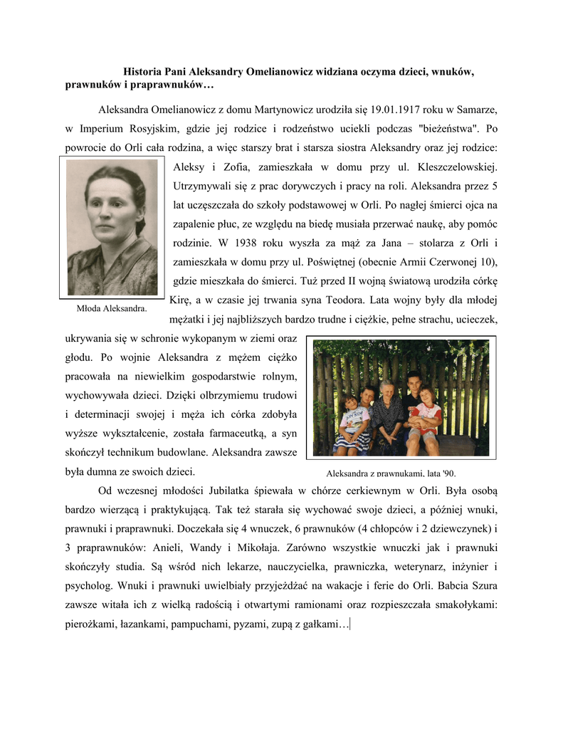 Historia Pani Aleksandry Omelianowicz widziana oczyma dzieci, wnuków, prawnuków i praprawnuków… Aleksandra Omelianowicz z domu Martynowicz urodziła się 19.01.1917 roku w Samarze, w Imperium Rosyjskim, gdzie jej rodzice i rodzeństwo uciekli podczas "bieżeństwa". Po powrocie do Orli cała rodzina, a więc starszy brat i starsza siostra Aleksandry oraz jej rodzice: Aleksy i Zofia, zamieszkała w domu przy ul. Kleszczelowskiej. Utrzymywali się z prac dorywczych i pracy na roli. Aleksandra przez 5 lat uczęszczała do szkoły podstawowej w Orli. Po nagłej śmierci ojca na zapalenie płuc, ze względu na biedę musiała przerwać naukę, aby pomóc rodzinie. W 1938 roku wyszła za mąż za Jana – stolarza z Orli i zamieszkała w domu przy ul. Poświętnej (obecnie Armii Czerwonej 10), gdzie mieszkała do śmierci. Tuż przed II wojną światową urodziła córkę Młoda Aleksandra. Kirę, a w czasie jej trwania syna Teodora. Lata wojny były dla młodej mężatki i jej najbliższych bardzo trudne i ciężkie, pełne strachu, ucieczek, ukrywania się w schronie wykopanym w ziemi oraz głodu. Po wojnie Aleksandra z mężem ciężko pracowała na niewielkim gospodarstwie rolnym, wychowywała dzieci. Dzięki olbrzymiemu trudowi i determinacji swojej i męża ich córka zdobyła wyższe wykształcenie, została farmaceutką, a syn skończył technikum budowlane. Aleksandra zawsze była dumna ze swoich dzieci. Aleksandra z prawnukami, lata '90. Od wczesnej młodości Jubilatka śpiewała w chórze cerkiewnym w Orli. Była osobą bardzo wierzącą i praktykującą. Tak też starała się wychować swoje dzieci, a później wnuki, prawnuki i praprawnuki. Doczekała się 4 wnuczek, 6 prawnuków (4 chłopców i 2 dziewczynek) i 3 praprawnuków: Anieli, Wandy i Mikołaja. Zarówno wszystkie wnuczki jak i prawnuki skończyły studia. Są wśród nich lekarze, nauczycielka, prawniczka, weterynarz, inżynier i psycholog. Wnuki i prawnuki uwielbiały przyjeżdżać na wakacje i ferie do Orli. Babcia Szura zawsze witała ich z wielką radością i otwartymi ramionami oraz rozpieszczała smakołykami: pierożkami, łazankami, pampuchami, pyzami, zupą z gałkami… Życie Aleksandry Omelianowicz upływało na bardzo ciężkiej pracy, nie tylko dla siebie. Chętnie pomagała też innym w miarę swoich możliwości. Cechowała ją wielka pracowitość, życzliwość, otwartość, empatia, ciekawość świata i ludzi. Na jej twarzy często uśmiech. Mimo stu gościł pogodny przeżytych lat dzięki troskliwej opiece jaką otaczała ją córka i syn Aleksandra podczas modlitwy w dniu setnych urodzin. Aleksandra była dość samodzielna i często można ją było spotkać na nabożeństwach w orlańskiej cerkwi. Rodzinne świętowanie setnych urodzin Mamy, Babci, Prababci, Praprababci.