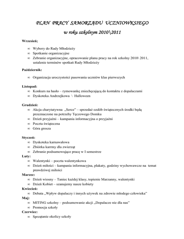 PLAN PRACY SAMORZĄDU SAMORZĄDU SAMORZĄDU