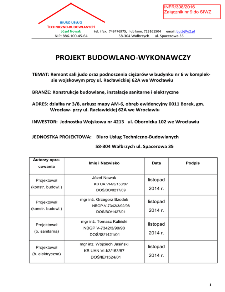 INFR/308/2016 Załącznik nr 9 do SIWZ BIURO USŁUG TECHNICZNO-BUDOWLANYCH tel. i fax. 748476975, lub kom. 723161504 Józef Nowak NIP: 886-100-45-64 58-304 Wałbrzych email: [email protected] ul. Spacerowa 35 PROJEKT BUDOWLANO-WYKONAWCZY TEMAT: Remont sali judo oraz podnoszenia ciężarów w budynku nr 6 w kompleksie wojskowym przy ul. Racławickiej 62A we Wrocławiu BRANŻE: Konstrukcje budowlane, instalacje sanitarne i elektryczne ADRES: działka nr 3/8, arkusz mapy AM-6, obręb ewidencyjny 0011 Borek, gm. Wrocław- przy ul. Racławickiej 62A we Wrocławiu INWESTOR: Jednostka Wojskowa nr 4213 ul. Obornicka 102 we Wrocławiu JEDNOSTKA PROJEKTOWA: Biuro Usług Techniczno-Budowlanych 58-304 Wałbrzych ul. Spacerowa 35 Autorzy opracowania Projektował (konstr. budowl.) Projektował (konstr. budowl.) Projektował (b. sanitarna) Projektował (b. elektryczna) Imię i Nazwisko Data Józef Nowak listopad Podpis KB UA.VI-f/3/153/87 DOŚ/BO/0217/09 mgr inż. Grzegorz Bzodek 2014 r. listopad NBGP.V-7342/3/92/98 DOŚ/BO/1427/01 mgr inż. Tomasz Kuliński 2014 r. listopad NBGP V-7342/3/90/98 DOŚ/IS/1421/01 mgr inż. Wojciech Jasiński 2014 r. listopad KB UAN.VI-f/3/153/87 DOŚ/IE/1524/01 2014 r. 1 SPIS TREŚCI: Strona tytułowa- str. 1 Spis treści- str. 2 1. Informacje ogólne- str. 3- 4 1. 1. Przedmiot opracowania- str .3 1.2. Podstawa formalna wykonania projektu- str. 3 1.3. Podstawy techniczne wykonania projektu- str. 3 1.4. Zagospodarowanie działki- str. 4 1.5. Dane informacyjne- str. 4 2. Charakterystyka budynku- dane ogólne- str. 4- 5 3. Układ funkcjonalny- str. 5 4. Ocena stanu technicznego- str. 6- 8 - Wykończenie ścian- str. 6 - Wykończenie stropów- str. 6 - Wykończenie podłóg- str. 6-7 - Stolarka okienna- str. 7 - Stolarka drzwiowa- str. 7 - Instalacja c.o.- str. 7 - Instalacja elektryczna- str. 7- 8 - Wentylacja mechaniczna- str. 8 5. Cześć projektowa z opisem- str. 85.1. Roboty ogólnobudowlane- str. 8- 15 - Wykończenie ścian- str. 8- 10 - Wykończenie stropów- str. 10- 11 - Wykończenie podłóg- str. 11- 14 - Stolarka drzwiowa- str. 14- 15 5.2. Instalacja centralnego ogrzewania i wodna- str. 15- 16 5.3. Wentylacja mechaniczna- str. 16- 18 5.4. Instalacja elektryczna- str. 19- 20 6. Plan BIOZ- str. 20- 23 - Oświadczenie projektantów- str. 24 - Część rysunkowa: Rys. 1 Sytuacja Rys. 2 Inwentaryzacja- rzut parteru Rys. 3 Inwentaryzacja- rzut piętra Rys. 4 Inwentaryzacja- przekroje pionowe Rys. 5 Rzut parteru z projektowanym rozmieszczeniem podestów dla ciężarowców Rys. 6 Remont salki Judo na 1 piętrze Rys. 7 Konstrukcja podłóg na parterze- przekrój pionowy poprzeczny- rys. wykonawczy Rys. 8 Konstrukcja podłóg na parterze- przekrój pionowy podłużny- rys. wykonawczy Rys. 9 Konstrukcja podłóg na parterze- rzut poziomy- rys. wykonawczy Rys. 10 Konstrukcja podłóg na parterze- podest treningowy- rys. wykonawczy Rys. 11 Konstrukcja podłóg na parterze- platforma dla ciężarowców- rys. wykonawczy Rys. 12 Konstrukcja podłogi piętra na sali Judo na parterze- przekrój pionowy- rys. wykonawczy Rys. 13 Przekroje pionowe przez sufit podwieszony- rys. wykonawczy Rys. 14C Remont instalacji c.o.- aksonometria- rys. wykonawczy Rys. 15W Remont instalacji wentylacyjnej- aksonometria- rys. wykonawczy Rys. 16W Remont instalacji wentyl. - rzut poziomy- rys. wykonawczy Rys. 17E Remont instalacji elektrycznej parteru- rys. wykonawczy Rys. 18E Remont instalacji elektrycznej piętra- salki Judo- rys. wykonawczy - Uprawnienia - Dokumenty od producentów 2 1. Informacje ogólne 1.1. Przedmiot opracowania Przedmiotem opracowania jest projekt budowlano-wykonawczy, remontu sal sportowych w budynku nr 6, położonego w kompleksie wojskowym przy ul. Racławickiej 62A we Wrocławiu. Opracowanie obejmuje remont podłóg, sufitów, ścian, instalacji elektrycznej, instalacji centralnego ogrzewania i instalacji wentylacji mechanicznej. Projektowane roboty, nie naruszą konstrukcyjnych elementów nośnych budynku i wszystkie będą wykonane w jego wnętrzu. 1.2. Podstawa formalna wykonania projektu Podstawą formalną wykonania projektu jest umowa pomiędzy Inwestorem, a Wykonawcą na wykonanie opracowania. 1.3. Podstawy techniczne wykonania projektu Przy opracowywaniu wykorzystano: - inwentaryzację budynku (prawego skrzydła, w którym znajdują się sale sportowe, przeznaczone do remontu) - wizję lokalną w obiekcie, oraz uzgodnienia z Inwestorem, - ustawę Prawo Budowlane - Rozporządzenie Ministra Infrastruktury z 12.04.2002 w sprawie warunków technicznych jakim powinny odpowiadać budynki i ich usytuowanie (Dz.U. Nr 75, poz. 690, z późniejszymi zmianami) - Europejska norma EN 14904:2009P (obejmująca wymagania dotyczące nawierzchni wyposażenia hal do uprawiania wielu dyscyplin sportowych) - Aprobaty ITB dotyczące wybranych systemów - Materiały pomocnicze, instrukcje i karty produktów producentów 3 1.4. Zagospodarowanie działki Budynek z salami sportowymi, przewidzianymi do remontu, zlokalizowany jest we Wrocławiu przy ul. Racławickiej 62a (działka nr 026401_1.0011.AR-6.3/8, Obręb Borek, gm. Wrocław). Cała działka jest kompleksem wojskowym, jest ogrodzona i całodobowo chroniona. Dojazd do działki od ul. Racławickiej, przez istniejący zjazd publiczny. Na terenie działki znajdują się: powyższy budynek, boiska sportowe, korty tenisowe, tereny zielone, komunikacja, parkingi. Zagospodarowanie terenu nie ulegnie zmianie, ze względu na prace remontowe, ograniczone do wnętrza budynku. 1.5. Dane informacyjne Przedmiotowa działka i budynek nie są wpisane do rejestru zabytków i nie podlegają ochronie konserwatorskiej na podstawie odrębnych przepisów, jest kompleksem wojskowym. Planowany remont nie spowoduje szczególnych zagrożeń, pod warunkiem przestrzegania przepisów BHP określonych prawnie na budowie. 2. Charakterystyka budynku – dane ogólne Jest to obiekt dwuskrzydłowy, wybudowany w latach 60-tych XX wieku. Składa się z jednej (mniejsza cz