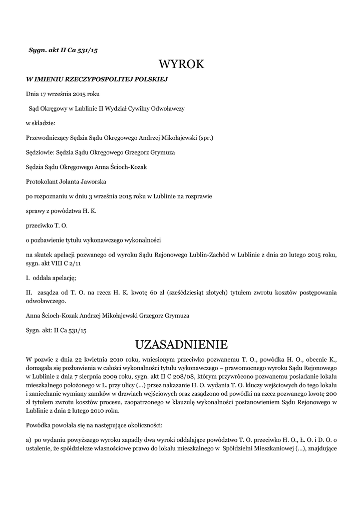 Sygn. akt II Ca 531/15 WYROK W IMIENIU RZECZYPOSPOLITEJ POLSKIEJ Dnia 17 września 2015 roku Sąd Okręgowy w Lublinie II Wydział Cywilny Odwoławczy w składzie: Przewodniczący Sędzia Sądu Okręgowego Andrzej Mikołajewski (spr.) Sędziowie: Sędzia Sądu Okręgowego Grzegorz Grymuza Sędzia Sądu Okręgowego Anna Ścioch-Kozak Protokolant Jolanta Jaworska po rozpoznaniu w dniu 3 września 2015 roku w Lublinie na rozprawie sprawy z powództwa H. K. przeciwko T. O. o pozbawienie tytułu wykonawczego wykonalności na skutek apelacji pozwanego od wyroku Sądu Rejonowego Lublin-Zachód w Lublinie z dnia 20 lutego 2015 roku, sygn. akt VIII C 2/11 I. oddala apelację; II. zasądza od T. O. na rzecz H. K. kwotę 60 zł (sześćdziesiąt złotych) tytułem zwrotu kosztów postępowania odwoławczego. Anna Ścioch-Kozak Andrzej Mikołajewski Grzegorz Grymuza Sygn. akt: II Ca 531/15 UZASADNIENIE W pozwie z dnia 22 kwietnia 2010 roku, wniesionym przeciwko pozwanemu T. O., powódka H. O., obecnie K., domagała się pozbawienia w całości wykonalności tytułu wykonawczego – prawomocnego wyroku Sądu Rejonowego w Lublinie z dnia 7 sierpnia 2009 roku, sygn. akt II C 208/08, którym przywrócono pozwanemu posiadanie lokalu mieszkalnego położonego w L. przy ulicy (...) przez nakazanie H. O. wydania T. O. kluczy wejściowych do tego lokalu i zaniechanie wymiany zamków w drzwiach wejściowych oraz zasądzono od powódki na rzecz pozwanego kwotę 200 zł tytułem zwrotu kosztów procesu, zaopatrzonego w klauzulę wykonalności postanowieniem Sądu Rejonowego w Lublinie z dnia 2 lutego 2010 roku. Powódka powołała się na następujące okoliczności: a) po wydaniu powyższego wyroku zapadły dwa wyroki oddalające powództwo T. O. przeciwko H. O., Ł. O. i D. O. o ustalenie, że spółdzielcze własnościowe prawo do lokalu mieszkalnego w Spółdzielni Mieszkaniowej (...), znajdujące się w budynku przy ulicy (...) nr (...)weszło do majątku dorobkowego małżonków T. i H. O., wobec czego właścicielami są D. O. i Ł. O., którzy nie wyrazili zgody na zamieszkiwanie w tym lokalu przez pozwanego; b) w dniu 5 grudnia 2010 roku zapadł nieprawomocny wyrok rozwiązujący małżeństwo H. i T. O. przez rozwód; c) wymiana zamków w lokalu celem niedopuszczenia powoda do lokalu nastąpiła wskutek stosowania przez pozwanego przemocy wobec domowników, a ponadto w toku procesu powódka podniosła również, że wymeldowała się z lokalu nr (...) przy ulicy (...) i wynajęła lokal u osoby trzeciej. * Wyrokiem z dnia 20 lutego 2015 roku Sąd Rejonowy Lublin-Zachód w Lublinie: I. pozbawił wykonalności tytuł wykonawczy w postaci wyroku Sądu Rejonowego w Lublinie z dnia 7 sierpnia 2009 roku w sprawie II C 208/08, zaopatrzony w klauzulę wykonalności dnia 2 lutego 2010 roku, co do pkt I i II; II. zasądził od T. O. na rzecz H. K. kwotę 167 zł tytułem zwrotu kosztów procesu. Sąd Rejonowy ustalił następujący stan faktyczny: W dniu 10 stycznia 2007 roku powódka na podstawie umowy darowizny sporządzonej w formie aktu notarialnego przeniosła na synów D. O. i Ł. O. na współwłasność po ½ części prawo do własnościowego prawa do lokalu mieszkalnego położonego w L. przy ulicy (...). W dniu 7 sierpnia 2009 roku zapadł wyrok Sądu Rejonowego w Lublinie, sygn. akt II C 208/08, w którego sentencji w punkcie I przywrócono pozwanemu posiadanie lokalu mieszkalnego położonego w L. przy ulicy (...) przez nakazanie H. O. wydania T. O. kluczy wejściowych do tego lokalu i zaniechanie wymiany zamków w drzwiach wejściowych , a w punkcie II zasądzono od powódki na rzecz pozwanego kwotę 200 zł tytułem zwrotu kosztów procesu. Wyrok ten dopuszcza pozwanego do współposiadania całości mieszkania. Wyrok ten zaopatrzono w klauzulę wykonalności postanowieniem Sądu Rejonowego w Lublinie z dnia 2 lutego 2010 roku. Powódka nie wykonała wyroku dobrowolnie. W dniu 30 września 2009 roku zapadł wyrok Sądu Okręgowego w Lublinie, sygn. akt I C 395/08, którym oddalono powództwo pozwanego przeciwko powódce oraz Ł. i D. O. o ustalenie, że spółdzielcze własnościowe prawo do lokalu mieszkalnego położonego w L. przy ulicy (...) weszło do majątku dorobkowego powódki i pozwanego. Wyrok ten uprawomocnił się w dniu 14 stycznia 2010 roku. Małżeństwo H. K. i T. O. ustało z dniem 6 marca 2013 roku, to jest w dniu uprawomocnienia się wyroku rozwodowego Sądu Okręgowego w Lublinie z dnia 29 lutego 2012 roku, sygn. akt III C 1684/08, na mocy wyroku Sądu Apelacyjnego w Lublinie z dnia 6 marca 2013 roku. Rozwód orzeczono z winy pozwanego. Od dnia 15 listopada 2014 roku powódka wyprowadziła się czasowo z mieszkania przy ulicy (...) i wynajęła pokój u koleżanki A. K. przy ulicy (...). Uczyniła to po to, aby nie wydać pozwanemu kluczy do lokalu mieszkalnego przy ulicy (...). Pomimo wymeldowania i wyprowadzenia się z lokalu powódka nadal okresowo przebywa w tym lokalu. Między stronami, byłymi małżonkami, istnieje niezwykle zaogniony konflikt emocjonalny. Konflikt ten obejmuje także relacje pozwanego z pozostałymi domownikami: synami Ł. O. i D. O.. Pozwany podchodzi do relacji z powódką w sposób niezwykle emocjonalny, nie potrafi panować nad swoimi zachowaniami, emocjami, wypowiedziami, w trakcie trwania czynności urzędowych w toku niniejszego procesu uniemożliwiając podejmowanie czynności urzędowych Sądu. Sąd Rejonowy wskazał, na podstawie jakich dowodów poczynił powyższe ustalenia faktyczne i dodał, że tylko ustalone wyżej okoliczności należało uznać za istotne w zakresie przedmiotu procesu. Sąd Rejonowy obdarzył wiarą zarówno dowody z dokumentów jak i zeznania świadków Ł. O., D. O., Z. S., A. K. i P. K.. W przeważającej części Sąd Rejonowy obdarzył wiarą również zeznania powódki, nie dając jej natomiast wiary co do tego, że „nie miała woli posiadania kluczy” do przedmiotowego lokalu w okresie, w jakim wynajmowała 