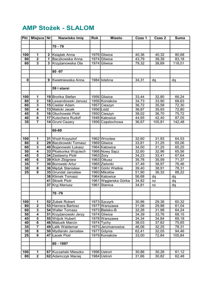 AMP Stożek - SLALOM Pkt Miejsce Nr Nazwisko Imię Rok Miasto Czas 1 Czas 2 Suma 1976 Gliwice 1974 Gliwice 1974 Gliwice 40,36 43,79 79,32 40,32 39,39 38,69 1984 Istebna 34,31 1956 1956 1957 1956 1950 1946 1956 Gliwice Koniaków Cieszyn Łódź Cieszyn Katowice Częstochowa 33,44 34,73 36,72 36,87 39,02 44,65 36,67 32,80 33,90 35,58 35,93 36,70 42,40 105,81 66,24 68,63 72,30 72,80 75,72 87,05 142,48 1962 1969 1964 1966 1963 1963 1965 1961 1960 1964 1961 1961 Wrocław Gliwice Katowice Nowy Sącz Żory Olkusz Zielonki Górki Wielkie Mikołów Katowice Węgierska Górka Stanica 32,60 33,81 34,00 32,60 34,23 35,78 37,49 39,40 51,90 56,68 34,82 34,81 31,93 31,25 31,25 32,96 33,41 35,59 38,97 38,91 36,32 dq nz nz 64,53 65,06 65,25 65,56 67,64 71,37 76,46 78,31 88,22 dq dq dq 1973 1977 1973 1974 1978 1974 1973 1977 1979 Szczyrk Warszawa Bielsko-B Gliwice Warszawa Tychy Jerzmanowice Gdynia Koniaków 30,96 31,06 32,26 34,39 34,34 38,03 46,06 62,41 33,00 29,36 29,98 31,98 33,76 34,84 37,62 32,25 32,05 72,84 60,32 61,04 64,24 68,15 69,18 75,65 78,31 94,46 105,84 30,86 31,66 30,26 30,82 61,12 62,48 70 - 79 100 80 60 1 2 3 2 Książek Anna 1 Baczkowska Anna 3 Krzyżanowska Ola 80,68 83,18 118,01 80 -97 0 9 Kwietniewska Anna dq dq 59 i starsi 100 80 60 50 45 40 35 1 2 3 4 5 6 7 19 18 15 13 16 17 14 Brońka Stefan Lewandowski Janusz Cieślar Adam Malicki Jacek Głuchowski Piotr Kutschera Rudolf Grunt Cezary 60-69 100 80 60 50 45 40 35 30 25 1 2 3 4 5 6 7 8 9 31 29 40 33 34 39 30 36 35 38 41 37 Wsół Krzysztof Baczkowski Tomasz Bojanowski Łukasz Płoskonka Wojciech Zastawny Piotr Klich Zbigniew Borowski Artur Mężyk Stanisław Grundal Jarosław Klimek Tomasz Słowik Piotr Kryj Mariusz 70 -79 100 80 60 50 45 40 35 30 25 1 2 3 4 5 6 7 8 9 52 53 54 51 55 46 49 50 47 Zubek Robert Hamera Bartosz Waller Tomasz Krzyżanowski Jerzy Wójcik Hubert Matusik Marcin Lalik Waldemar Mydlarski Jarosław Łacek Piotr 80 - 1997 100 80 1 2 67 Kuczański Mieszko 62 Adamczyk Maciej 1996 Ustroń 1984 Ustroń 60 50 45 40 3 4 5 6 71 69 68 64 63 Madejczyk Borys Ochman Ryszard Pękala Michał Cieślar Tomasz Waśniowski Tomasz 1992 1989 1988 1989 1984 Wisła Łaziska Grn Warszawa Cieszyn Rytro 33,18 34,39 40,02 58,85 32,50 31,47 34,31 39,36 32,34 dq 64,65 68,70 79,38 91,19 dq