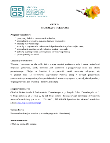 OFERTA WARSZTATY KULINARNE Program warsztatów: przyprawy i zioła – zastosowanie w kuchni; sporządzanie wywarów, zup, zup kremów oraz sosów; sposoby luzowania mięs; sposoby przygotowania, dekorowania i podawania różnych rodzajów mięs; sporządzanie podstawowych rodzajów sałatek i surówek; potrawy kuchni polskiej (sporządzanie wybranych potraw); proste przepisy na obiad. Uczestnicy warsztatów: Warsztaty kierowane są dla osób, które pragną uzyskać praktyczne rady i cenne wskazówki dotyczące gotowania, każdy uczestnik jest kucharzem i przygotowuje dania pod okiem prowadzącego. Dbając o komfort i przyjemność nauki warsztaty odbywają się w grupach max. 12 osobowych. Zapewniamy Państwu pracę w nowych pracowniach gastronomicznych wyposażonych w profesjonalny i nowoczesny sprzęt, wysokiej jakości produkty do przygotowania dań oraz miłą i domową atmosferę. Miejsce warsztatów: Ośrodek Dokształcania i Doskonalenia Zawodowego przy Zespole Szkół Zawodowych Nr 2 w Niepołomicach, ul. 3 Maja 2, 32-005 Niepołomice. Szczegółowych informacji dotyczących warsztatów udzielamy pod nr tel. 12 281-00-21, 513 018 074. Pytania można kierować również na adres: [email protected] Termin kursu: Kurs uruchamiany jest w miarę powstania grupy min. 10 osobowej. Koszt warsztatów: 500 zł. od osoby. (30 godzin)