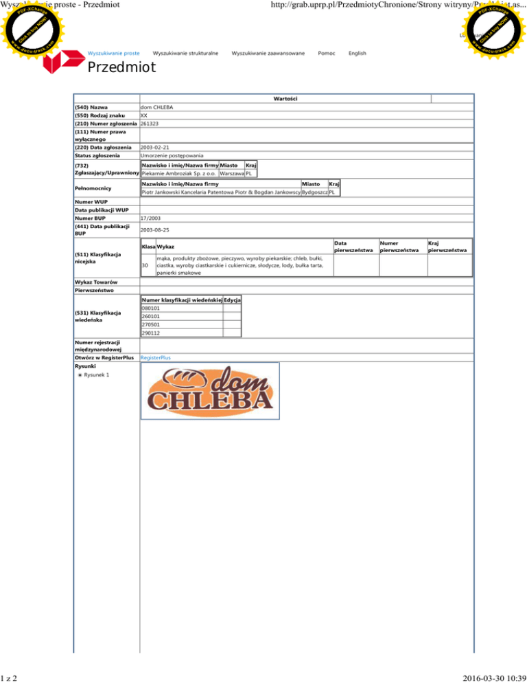 Wyszukiwanie proste - Przedmiot -X C h a n F http://grab.uprp.pl/PrzedmiotyChronione/Strony witryny/Przedmiot.as... -X C h a n ge F ge N y bu k lic .c Wyszukiwanie proste Wyszukiwanie strukturalne Wyszukiwanie zaawansowane Pomoc English .d o m o o c u -tr a c k C w w w 1z2 .d o m C lic k to Logowanie w w w to bu y N O W ! PD O W ! PD c u -tr a c k .c Przedmiot Warto ci (540) Nazwa dom CHLEBA (550) Rodzaj znaku XX (210) Numer zg oszenia 261323 (111) Numer prawa wy cznego (220) Data zg oszenia 2003-02-21 Status zg oszenia Umorzenie post powania Nazwisko i imi /Nazwa firmy Miasto Kraj (732) Zg aszaj cy/Uprawniony Piekarnie Ambroziak Sp. z o.o. Warszawa PL Pe nomocnicy Nazwisko i imi /Nazwa firmy Miasto Kraj Piotr Jankowski Kancelaria Patentowa Piotr & Bogdan Jankowscy Bydgoszcz PL Numer WUP Data publikacji WUP Numer BUP 17/2003 (441) Data publikacji BUP 2003-08-25 Klasa Wykaz (511) Klasyfikacja nicejska 30 Data pierwsze stwa Numer pierwsze stwa Kraj pierwsze stwa ka, produkty zbo owe, pieczywo, wyroby piekarskie; chleb, bu ki, ciastka, wyroby ciastkarskie i cukiernicze, s odycze, lody, bu ka tarta, panierki smakowe Wykaz Towarów Pierwsze stwo Numer klasyfikacji wiede skiej Edycja (531) Klasyfikacja wiede ska 080101 260101 270501 290112 Numer rejestracji mi dzynarodowej Otwórz w RegisterPlus RegisterPlus Rysunki Rysunek 1 2016-03-30 10:39 Wyszukiwanie proste - Przedmiot -X C h a n F http://grab.uprp.pl/PrzedmiotyChronione/Strony witryny/Przedmiot.as... -X C h a n PD F ge 2z2 c u -tr a c k N y bu to k lic .d o m w o .c C m o .d o w w w w w C lic k to bu y N O W ! ge O W ! PD c u -tr a c k .c 2016-03-30 10:39