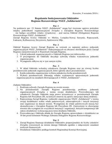 Rzeszów, 9 września 2010 r. Regulamin funkcjonowania Oddziałów Regionu Rzeszowskiego NSZZ „Solidarność”. Par. 1 Na podstawie par. 23 Statutu NSZZ „Solidarność” mogą być tworzone ogniwa pośrednie między jednostkami organizacyjnymi Związku a Zarządem Regionu Rzeszowskiego – nie będące szczeblem władzy związkowej – pod nazwą Oddział (Delegatura) Regionu Rzeszowskiego NSZZ „Solidarność”. Zarząd Regionu tworzy Oddziały w: Mielcu, Leżajsku-Nowej Sarzynie, Ropczycach, Łańcucie, Kolbuszowej, Strzyżowie, Sędziszowie Młp. Par. 2 Oddział Regionu tworzy Zarząd Regionu na wniosek co najmniej połowy jednostek organizacyjnych NSZZ „Solidarność” funkcjonujących na obszarze określonym przez Zarząd Regionu zarejestrowanych w Rejestrach Zarządu Regionu. 1. Udział jednostek organizacyjnych w Oddziale Regionu jest dobrowolny. 2. O przystąpieniu do Oddziału decyduje uchwałą władza wykonawcza jednostki organizacyjnej. 3. Wystąpienie odbywa się w tym samym trybie. Par. 3 1. W skład Oddziału wchodzą członkowie Zarządu Regionu oraz po równej liczbie przedstawiciele jednostek organizacyjnych, które zgłosiły akces przynależności. 2. Każda jednostka organizacyjna wybiera jednakową liczbę przedstawicieli. 3. Wyboru przedstawicieli dokonują władze wykonawcze uprawnionych jednostek organizacyjnych na zasadach obowiązujących w NSZZ „Solidarność”. Par. 4 Zadania Oddziałów: 1. Realizują uchwały Zarządu Regionu na swoim terenie. 2. Na posiedzeniach Zarządu Regionu przedstawiają problemy jednostek organizacyjnych Związku z terenu swojej działalności. Przewodniczący lub członkowie Zarządu Oddziału mają prawo uczestniczyć w posiedzeniach Zarządu Regionu lub Prezydium ZR, na których omawia się sprawy dotyczące danej struktury. 3. Reprezentują Zarząd Regionu i jednostki organizacyjne NSZZ „Solidarność” z terenu swojej działalności wobec władz państwowych, samorządowych i innych instytucji oraz organizacji na danym terenie. Wystąpienia do władz państwowych muszą być skonsultowane z Zarządem Regionu lub Prezydium ZR. Zastrzeżenie to obowiązuje również dla wystąpień do wszystkich instytucji i organizacji, których kompetencje lub zakres działalności wykraczają poza teren działania Oddziału. 4. Przewodniczący Oddziału składa do Zarządu Regionu sprawozdanie z działalności na 30 dni przed terminem Walnego Zebrania Delegatów Regionu Rzeszowskiego. Par. 5 1. Zarząd Regionu finansuje działalność Oddziałów proporcjonalnie do liczby członków Związku zrzeszonych na terenie danego Oddziału zgodnie z załączonymi zasadami rozliczeń finansowych. 2. Działalność Oddziałów podlega kontroli Regionalnej Komisji Rewizyjnej. Par. 6 1. Decyzje Oddziałów podejmowane są na zasadach obowiązujących w NSZZ „Solidarność”. 2. Uprawnionymi do głosowania są przedstawiciele jednostek organizacyjnych. Każda jednostka organizacyjna dysponuje jednym głosem. Par. 7 1. Oddziały powołują ze swojego składu Zarząd, który składa się z nie mniej niż 3 osób: Przewodniczącego Zastępcy Przewodniczącego Sekretarza 2. Zarząd wybierany jest przez Walne Zebranie Przedstawicieli jednostek organizacyjnych na zasadach obowiązujących w NSZZ „Solidarność” w terminie do 30 dni od sprawozdawczo-wyborczego Walnego Zebrania Delegatów Regionu. 3. Członkowie Zarządu Regionu wchodzący w skład Oddziałów są zobowiązani do przekazywania informacji na posiedzeniach ZR o pracach Oddziału i informowania członków Oddziałów o pracach Zarządu Regionu. Par. 8 W razie łamania Statutu NSZZ „Solidarność”, niniejszego Regulaminu, nierealizowania Uchwał Zarządu Regionu lub władz krajowych NSZZ „Solidarność” przez władze Oddziałów, Zarząd Regionu może: 1. Wystąpić z wnioskiem do Walnego Zebrania Oddziału o odwołanie Zarządu Oddziału. 2. Wystąpić do jednostki organizacyjnej o odwołanie jej przedstawiciela w Oddziale. 3. Rozwiązać Oddział. Zarząd Regionu może rozwiązać Oddział również w przypadku gdy zrzesza ona mniej niż połowę wszystkich jednostek organizacyjnych z terenu jego działania lub małej liczby członków Związku zrzeszonych w jednostkach organizacyjnych tworzących Oddział. Od decyzji ZR o rozwiązaniu Oddziału przysługuje odwołanie do WZD Regionu Rzeszowskiego w terminie do 30 dni od daty decyzji ZR jednak nie później niż 30 dni przed terminem WZDR. Par. 9 1. Bieżącą obsługę organizacyjną Oddziałów zapewnia Zarząd Regionu. 2. Działalność Oddziałów nadzoruje Prezydium Zarządu Regionu. 3. Prezydium ZR jest odpowiedzialne za bieżące kontakty z władzami Oddziałów. Par. 10 Sprawy sporne i inne nieobjęte Regulaminem dotyczące funkcjonowania Oddziałów rozstrzyga Zarząd Regionu. Par. 11 Regulamin wchodzi w życie z dniem uchwalenia. Załącznik Zasady Rozliczeń Finansowych Oddziałów Regionu Rzeszowskiego NSZZ „Solidarność” Działalność Oddziałów jest finansowana na zasadach określonych w Regulaminie 1. Wniosek o uregulowanie płatności na cele działalności Oddziału winien być sporządzony przez przewodniczącego lub członka Zarządu Oddziału. Wniosek winien zawierać: Kopię decyzji - wniosku Zarządu Oddziału do ZR Określenie rodzaju i celu zakupu oraz jego wykorzystania Określenie kwoty potrzebnej do dokonania zakupu. Wniosek winien być podpisany przez Przewodniczącego Oddziału oraz skarbnika ZR, a w razie jego nieobecności przez członka Prezydium ZR. Wniosek podlega ocenie pod względem zasadności i gospodarności przez Prezydium ZR. Decyzja Prezydium Zarządu Regionu zatwierdzająca wniosek stanowi podstawę do wypłacenia gotówki w kasie ZR w formie zaliczki na dokonanie zakupu lub dokonania płatności w sposób bezgotówkowy. 2. Zaliczkę pobraną w kasie ZR należy rozliczyć w terminie do 7 dni od dokonania zakupu wypełniając dokument „rozliczenie zaliczki”. Podstaw