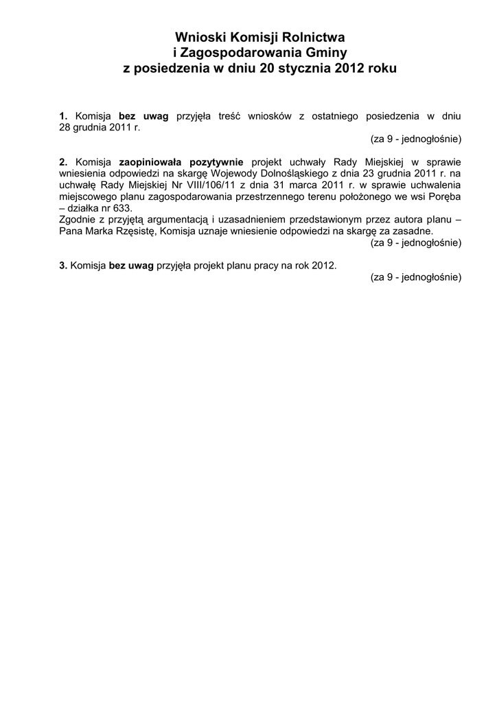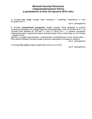 Wnioski Komisji Rolnictwa i Zagospodarowania Gminy z posiedzenia w dniu 20 stycznia 2012 roku 1. Komisja bez uwag przyjęła treść wniosków z ostatniego posiedzenia w dniu 28 grudnia 2011 r. (za 9 - jednogłośnie) 2. Komisja zaopiniowała pozytywnie projekt uchwały Rady Miejskiej w sprawie wniesienia odpowiedzi na skargę Wojewody Dolnośląskiego z dnia 23 grudnia 2011 r. na uchwałę Rady Miejskiej Nr VIII/106/11 z dnia 31 marca 2011 r. w sprawie uchwalenia miejscowego planu zagospodarowania przestrzennego terenu położonego we wsi Poręba – działka nr 633. Zgodnie z przyjętą argumentacją i uzasadnieniem przedstawionym przez autora planu – Pana Marka Rzęsistę, Komisja uznaje wniesienie odpowiedzi na skargę za zasadne. (za 9 - jednogłośnie) 3. Komisja bez uwag przyjęła projekt planu pracy na rok 2012. (za 9 - jednogłośnie) Wnioski Komisji Rolnictwa i Zagospodarowania Gminy z posiedzenia w dniu 27 stycznia 2012 roku 1. Komisja bez uwag przyjęła treść wniosków z ostatniego posiedzenia w dniu 20 stycznia 2012 r. (za 9 - jednogłośnie) 2. Komisja zapoznała się z koncepcją przedstawioną przez Państwo Łuczaj z Międzygórza w sprawie wydzierżawienia działek w miejscowości Spalona i zagospodarowania ich na potrzeby sportów zimowych – tj. powstanie tras biegowych. Po złożeniu konkretnej oferty przez zainteresowanych Komisja dokona dalszej analizy planowanych działań. 3. Komisja zapoznała się ze stanowiskiem Pana Krzysztofa Komornickiego – Prezesa Stowarzyszenia „Powrót do Przyszłości” mówiącym o tym, aby wycofać wniosek dotyczący wyrażenia zgody na odstąpienie od obowiązku przetargowego trybu zawarcie umowy dzierżawy na działki nr 7/1, 7/2, 9/1, 10 w Wójtowicach. Pan Krzysztof Komornicki oświadczył, że wyraża wolę dokonania zamiany działek w Wójtowicach o łącznej pow. ok. 9 ha na działkę będącą prywatną własnością, położoną w Starej Bystrzycy o powierzchni 8 ha (klasa IVA i IVB). Oznajmił, że w przypadku kiedy wycena wartości działki w Starej Bystrzycy będzie wyższa - zrzeknie się różnicy. 4. Komisja przychyla się do wniosku Pana Krzysztofa Wdowiaka (Restauracja „LA SALLE”) z dnia 12.01.2012 r. w sprawie umożliwienia rozstawienia w okresie letnim ogródka piwnego na Placu Wolności. 5. Komisja przyjęła informację z realizacji wniosków Komisji za rok 2011. (za 9 - jednogłośnie) 6. Komisja przyjęła sprawozdanie z pracy Komisji za rok 2011. (za 9 - jednogłośnie) Wnioski Komisji Rolnictwa i Zagospodarowania Gminy z posiedzenia w dniu 6 marca 2012 roku 1. Komisja przeprowadziła wizję lokalną w miejscowości Stara Bystrzyca w sprawie złożonego przez Państwa Dorotę i Krzysztofa Komornickich wniosku dotyczącego wyrażenia zgody na dokonanie zamiany działki nr 332/1 położonej na terenie wsi Stara Bystrzyca stanowiącą ich własność na działki nr 7/1, 7/2, 9/1, 10, 11, 121/1, 122/2 położone na terenie wsi Wójtowice-Huta, stanowiące własność gminy Bystrzyca Kłodzka. Po przeanalizowaniu przedłożonych dokumentów w oparciu o wypisy z rejestru gruntów, Komisja dopatrzyła się niezgodności w podanych przez Państwa Komornickich powierzchniach. Komisja odstąpiła od wydania opinii w przedmiotowej sprawie do czasu wyjaśnienia niezgodności. (9 za, jednogłośnie) 2. Komisja po przeprowadzeniu wizji lokalnej w miejscowości Spalona, opiniuje pozytywnie wniosek Inwestora: Centrum Śnieżnik Genowefa Łuczaj dotyczący utworzenia terminalu do obsługi narciarzy i turystów biegowych na części działki nr 57/20. (9 za, jednogłośnie) Wnioski Komisji Rolnictwa i Zagospodarowania Gminy z posiedzenia w dniu 26 marca 2012 roku 1. 1. Komisja bez uwag przyjęła treść wniosków z ostatniego posiedzenia w dniu 6 marca 2012 r. (8 za - jednogłośnie) 2. Komisja przyjęła informację przedstawioną przez Pana Leszka Bobulę – Przewodniczącego Powiatowej Izby Rolniczej w Kłodzku dotyczącą pracy Izby Rolniczej. (7 za - jednogłośnie) 3. Komisja bez uwag przyjęła informację dotyczącą realizacji funduszu sołeckiego w roku 2011. (8 za - jednogłośnie) 4. Komisja opiniuje pozytywnie projekt uchwały rady w sprawie zarządzenia wyborów uzupełniających do Rady Sołeckiej Długopola Zdroju. (8 za, jednogłośnie) 5. Komisja opiniuje pozytywnie projekt uchwały rady w sprawie przyjęcia programu opieki nad zwierzętami bezdomnymi oraz zapobiegania bezdomności zwierząt na terenie Gminy Bystrzyca Kłodzka. (8 za, jednogłośnie) 6. Komisja opiniuje pozytywnie projekt uchwały rady w sprawie wyrażenia zgody na wyodrębnienie w budżecie Gminy Bystrzyca Kłodzka środków stanowiących fundusz sołecki. (8 za, jednogłośnie) 7. Komisja zaopiniowała pozytywnie wniosek Pani Agnieszki Mokosy w sprawie wydzierżawienia na okres 10 lat części działki nr 59/3 położonej na terenie Międzygórza przy ul. Sanatoryjnej. Komisja wnioskuje o zapoznanie radnych z projektem umowy przed jej podpisaniem. (6 za, przy 2 wstrzymujących się) 8. Komisja wyda opinię w sprawie wniosku Państwa Komornickich dotyczącego zamiany działek, po odbyciu wizji w terenie. (8 za, jednogłośnie) 9. Komisja negatywnie opiniuje wniosek mieszkańców ul. Podzamcze 12c Gorzanów, w sprawie remontu drogi wewnętrznej transportu rolnego dz. nr 442 w Gorzanowie. Komisja podtrzymuje wniosek dotyczący remontów dróg ujętych w planie kadencyjnym dla miejscowości Gorzanów. (8 za, jednogłośnie) , Wnioski Komisji Rolnictwa i Zagospodarowania Gminy z posiedzenia w dniu 11 kwietnia 2012 roku 1. Komisja po przeprowadzeniu wizji lokalnej w miejscowości Stara Bystrzyca w sprawie złożonego przez Państwa Dorotę i Krzysztofa Komornickich wniosku dotyczącego wyrażenia zgody na dokonanie zamiany działek, wydała pozytywną opinię w przedmiotowej sprawie. (5 za, przy 3 wstrzymujących się) 2. Komisja wnioskuje aby przydział tłucznia na drogi gminne pozostał w kompetencji Burmistrza i był kontrolow