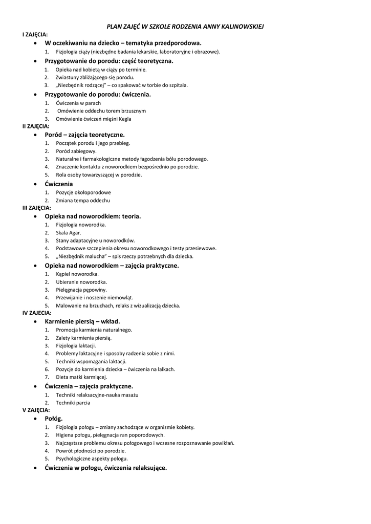 PLAN ZAJĘĆ W SZKOLE RODZENIA ANNY KALINOWSKIEJ I ZAJĘCIA: W oczekiwaniu na dziecko – tematyka przedporodowa. 1. Przygotowanie do porodu: część teoretyczna. 1. 2. 3. Fizjologia ciąży (niezbędne badania lekarskie, laboratoryjne i obrazowe). Opieka nad kobietą w ciąży po terminie. Zwiastuny zbliżającego się porodu. „Niezbędnik rodzącej” – co spakować w torbie do szpitala. Przygotowanie do porodu: ćwiczenia. 1. 2. 3. Ćwiczenia w parach Omówienie oddechu torem brzusznym Omówienie ćwiczeń mięśni Kegla II ZAJĘCIA: Poród – zajęcia teoretyczne. 1. 2. 3. 4. 5. Początek porodu i jego przebieg. Poród zabiegowy. Naturalne i farmakologiczne metody łagodzenia bólu porodowego. Znaczenie kontaktu z noworodkiem bezpośrednio po porodzie. Rola osoby towarzyszącej w porodzie. Ćwiczenia 1. 2. Pozycje okołoporodowe Zmiana tempa oddechu III ZAJĘCIA: Opieka nad noworodkiem: teoria. 1. 2. 3. 4. 5. Fizjologia noworodka. Skala Agar. Stany adaptacyjne u noworodków. Podstawowe szczepienia okresu noworodkowego i testy przesiewowe. „Niezbędnik malucha” – spis rzeczy potrzebnych dla dziecka. Opieka nad noworodkiem – zajęcia praktyczne. 1. 2. 3. 4. 5. Kąpiel noworodka. Ubieranie noworodka. Pielęgnacja pępowiny. Przewijanie i noszenie niemowląt. Malowanie na brzuchach, relaks z wizualizacją dziecka. IV ZAJECIA: Karmienie piersią – wkład. 1. 2. 3. 4. 5. 6. 7. Promocja karmienia naturalnego. Zalety karmienia piersią. Fizjologia laktacji. Problemy laktacyjne i sposoby radzenia sobie z nimi. Techniki wspomagania laktacji. Pozycje do karmienia dziecka – ćwiczenia na lalkach. Dieta matki karmiącej. Ćwiczenia – zajęcia praktyczne. 1. 2. Techniki relaksacyjne-nauka masażu Techniki parcia V ZAJĘCIA: Połóg. 1. 2. 3. 4. 5. Fizjologia połogu – zmiany zachodzące w organizmie kobiety. Higiena połogu, pielęgnacja ran poporodowych. Najczęstsze problemu okresu połogowego i wczesne rozpoznawanie powikłań. Powrót płodności po porodzie. Psychologiczne aspekty połogu. Ćwiczenia w połogu, ćwiczenia relaksujące.