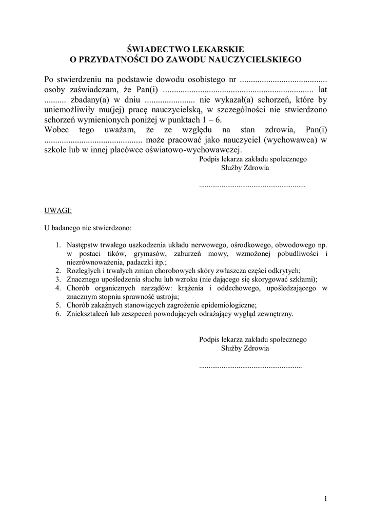ŚWIADECTWO LEKARSKIE O PRZYDATNOŚCI DO ZAWODU NAUCZYCIELSKIEGO Po stwierdzeniu na podstawie dowodu osobistego nr ........................................ osoby zaświadczam, że Pan(i) ..................................................................... lat .......... zbadany(a) w dniu ....................... nie wykazał(a) schorzeń, które by uniemożliwiły mu(jej) pracę nauczycielską, w szczególności nie stwierdzono schorzeń wymienionych poniżej w punktach 1 – 6. Wobec tego uważam, że ze względu na stan zdrowia, Pan(i) ............................................. może pracować jako nauczyciel (wychowawca) w szkole lub w innej placówce oświatowo-wychowawczej. Podpis lekarza zakładu społecznego Służby Zdrowia ......................................................... UWAGI: U badanego nie stwierdzono: 1. Następstw trwałego uszkodzenia układu nerwowego, ośrodkowego, obwodowego np. w postaci tików, grymasów, zaburzeń mowy, wzmożonej pobudliwości i niezrównoważenia, padaczki itp.; 2. Rozległych i trwałych zmian chorobowych skóry zwłaszcza części odkrytych; 3. Znacznego upośledzenia słuchu lub wzroku (nie dającego się skorygować szkłami); 4. Chorób organicznych narządów: krążenia i oddechowego, upośledzającego w znacznym stopniu sprawność ustroju; 5. Chorób zakaźnych stanowiących zagrożenie epidemiologiczne; 6. Zniekształceń lub zeszpeceń powodujących odrażający wygląd zewnętrzny. Podpis lekarza zakładu społecznego Służby Zdrowia ....................................................... 1