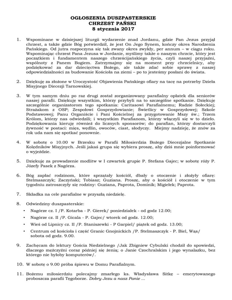 OGŁOSZENIA DUSZPASTERSKIE CHRZEST PAŃSKI 8 stycznia 2017 1. Wspominane w dzisiejszej liturgii wydarzenie znad Jordanu, gdzie Pan Jezus przyjął chrzest, a także gdzie Bóg potwierdził, że jest On Jego Synem, kończy okres Narodzenia Pańskiego. Od jutra rozpoczyna się tak zwany okres zwykły, per annum – w ciągu roku. Wspominając chrzest Pana Jezusa w Jordanie, myślimy także o naszym chrzcie, który jest początkiem i fundamentem naszego chrześcijańskiego życia, czyli naszej przyjaźni, wspólnoty z Panem Bogiem. Zatrzymajmy się na moment przy chrzcielnicy, aby podziękować za dar dziecięctwa Bożego, ale także zdać sobie sprawę z naszej odpowiedzialności za budowanie Kościoła na ziemi – po to jesteśmy posłani do świata. 2. Dziękuję za złożone w Uroczystość Objawienia Pańskiego ofiary na tacę na potrzeby Dzieła Misyjnego Diecezji Tarnowskiej. 3. W tym samym dniu po raz drugi został zorganizowany parafialny opłatek dla seniorów naszej parafii. Dziękuję wszystkim, którzy przybyli na to szczególne spotkanie. Dziękuję szczególnie organizatorom tego spotkania: Caritasowi Parafialnemu; Radzie Sołeckiej; Strażakom z OSP; Zespołowi Gosprzydowianie; Świetlicy w Gosprzydowej; Szkole Podstawowej; Panu Organiście i Pani Kościelnej za przygotowanie Mszy św.; Trzem Królom, którzy nas odwiedzili; i wszystkim Parafianom, którzy włączyli się w to dzieło. Podziękowania kieruję również do licznych sponsorów; do parafian, którzy dostarczyli żywność w postaci: mięs, wędlin, owoców, ciast, słodyczy. Miejmy nadzieję, że znów za rok uda nam się spotkać ponownie. 4. W sobotę o 10.00 w Brzesku w Parafii Miłosierdzia Bożego Diecezjalne Spotkanie Kolędników Misyjnych. Jeśli jakaś grupa się wybiera proszę, aby dziś mnie poinformować o wyjeździe. 5. Dziękuję za prowadzenie modlitw w I czwartek grupie P. Stefana Gajec; w sobotę róży P. Józefy Pasek z Nagórza. 6. Bóg zapłać rodzinom, które sprzątały kościół, dbały o otoczenie i złożyły ofiarę: Stelmaszczyk; Zaczyński; Tobiasz; Guziana. Proszę, aby o kościół i otoczenie w tym tygodniu zatroszczyły się rodziny: Guziana, Paprota, Dominik; Migiełek; Paprota. 7. Składka na cele parafialne w przyszłą niedzielę. 8. Odwiedziny duszpasterskie: 9. • Nagórze cz. I /P. Kotarba - P. Gierek/ poniedziałek - od godz 12.00; • Nagórze cz. II /P. Gicala - P. Gajec/ wtorek od godz. 12.00; • Wieś od Lipnicy cz. II /P. Staniszewki - P Garpiel/ piątek od godz. 13.00; • Centrum od kościoła i część Granic Gnojnickich /P. Stelmaszczyk - P. Biel, Wąs/ sobota od godz. 9.00. Zachęcam do lektury Gościa Niedzielnego /Jak Zbigniew Cybulski chodził do spowiedzi, dlaczego mężczyźni coraz później się żenią; o Janie Czochralskim i jego wynalazku, bez którego nie byłoby komputerów/. 10. W sobotę o 9.00 próba śpiewu w Domu Parafialnym. 11. Bożemu miłosierdziu polecajmy zmarłego ks. Władysława Sitkę – emerytowanego proboszcza parafii Tęgoborze. Dobry Jezu a nasz Panie ... 12. Jeszcze raz życzę wszystkim parafianom i gościom, by nastrój tych pięknych Świąt trwał jak najdłużej w sercach. A Nowy Rok niech będzie obfity w Błogosławieństwo Boże na każdy dzień! INTENCJE MSZY ŚWIĘTYCH 9 I 2017 - 15 I 2017 PONIEDZIAŁEK 9 I 07.00 - Kazimierz Garpiel /11 r. śm.; z int. rodziny/ WTOREK 10 I 07.00 + Kazimiera Lis /z int. sąsiadki Moniki Białasek/ ŚRODA 11 I 17.00 + Anna, Władysław Bakalarz /z int. rodziny/ CZWARTEK 12 I 17.00 + Anna Malaga /30 dzień śm. z int. córki Danuty z rodziną/ PIĄTEK 13 I 07.00 + Janina Gicala /z int. wnuka Mateusza z rodziną/ SOBOTA 14 I 07.00 + Jan Klimas /z int. wnuków/ NIEDZIELA 15 I 08.00 - za parafian 10.30 + Jakub, Katarzyna Koper; Teresa Gnela /z int. Marii Kopeć z Warszawy/