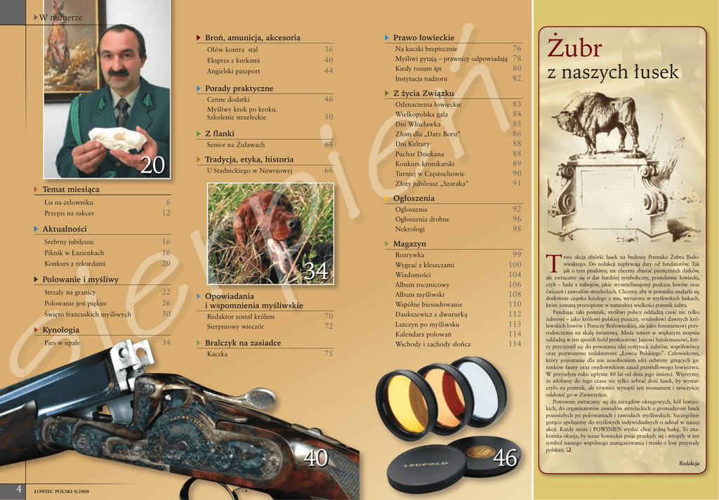 W numerze ń e i Broń, amunicja, akcesoria Prawo łowieckie 36 40 44 Ołów kontra stal Ekspres z kurkami Angielski paszport Porady praktyczne 46 Cenne dodatki Myśliwy krok po kroku. Szkolenie strzeleckie 50 p r e Z flanki 64 Senior na Żuławach 20 Temat miesiąca Lis na celowniku Przepis na sukces i s Aktualności Srebrny jubileusz Piknik w Łazienkach Konkurs z rekordami Polowanie i myśliwy Strzały na granicy Polowanie jest piękne Święto francuskich myśliwych Kynologia Pies w upale 4 ŁOWIEC POLSKI 8/2008 Tradycja, etyka, historia 66 U Stadnickiego w Nawojowej 6 12 16 16 20 34 22 26 30 powiadania O i wspomnienia myśliwskie 34 Bralczyk na zasiadce Redaktor został królem Sierpniowy wieczór Kaczka 70 72 Na kaczki bezpiecznie Myśliwi pytają – prawnicy odpowiadają Kiedy rozum śpi Instytucja nadzoru 76 78 80 82 z naszych łusek Z życia Związku Odznaczenia łowieckie Wielkopolska gala Dni Włocławka Złom dla „Darz Boru” Dni Kultury Puchar Dziekana Konkurs kronikarski Turniej w Częstochowie Złoty jubileusz „Szaraka” 83 84 85 86 88 88 89 90 91 Ogłoszenia Ogłoszenia Ogłoszenia drobne Nekrologi 92 96 98 Magazyn Rozrywka Wygrać z kleszczami Wiadomości Album rocznicowy Album myśliwski Wspólne biesiadowanie Daukszewicz z dwururką Lutczyn po myśliwsku Kalendarz polowań Wschody i zachody słońca 99 100 104 106 108 110 112 113 114 114 75 40 Żubr 46 T rwa akcja zbiórki łusek na budowę Pomnika Żubra Białowieskiego. Do redakcji napływają dary od fundatorów. Tak jak o tym pisaliśmy, nie chcemy zbierać pieniężnych datków, ale zwracamy się o dar bardziej symboliczny, prawdziwie łowiecki, czyli – łuski z nabojów, jakie wystrzeliwujemy podczas łowów oraz ćwiczeń i zawodów strzeleckich. Chcemy, aby w pomniku znalazła się dosłownie cząstka każdego z nas, wyrażona w myśliwskich łuskach, które zostaną przetopione w naturalnej wielkości pomnik żubra. Fundując taki pomnik, myśliwi polscy oddadzą cześć nie tylko żubrowi – jako królowi polskiej puszczy, symbolowi dawnych królewskich łowów i Puszczy Białowieskiej, ale jako fenomenowi przyrodniczemu na skalę światową. Może nawet w większym stopniu oddadzą w ten sposób hołd profesorowi Janowi Sztolcmanowi, który przyczynił się do powstania idei restytucji żubrów, współtwórcy oraz pierwszemu redaktorowi „Łowca Polskiego”. Człowiekowi, który pozostanie dla nas uosobieniem idei ochrony ginących gatunków fauny oraz orędownikiem zasad prawidłowego łowiectwa. W przyszłym roku upłynie 80 lat od dnia jego śmierci. Wierzymy, że zdołamy do tego czasu nie tylko zebrać dość łusek, by wystarczyło na pomnik, ale również wytopić ten monument i uroczyście odsłonić go w Zwierzyńcu. Ponownie zwracamy się do zarządów okręgowych, kół łowieckich, do organizatorów zawodów strzeleckich o gromadzenie łusek pozostałych po polowaniach i zawodach myśliwskich. Szczególnie gorąco apelujemy do myśliwych indywidualnych o udział w naszej akcji. Każdy może i POWINIEN wysłać choć jedną łuskę. To znakomita okazja, by nasze łowieckie pasje przekuły się i wtopiły w ten symbol naszego wspólnego zaangażowania i troski o losy przyrody polskiej. Redakcja