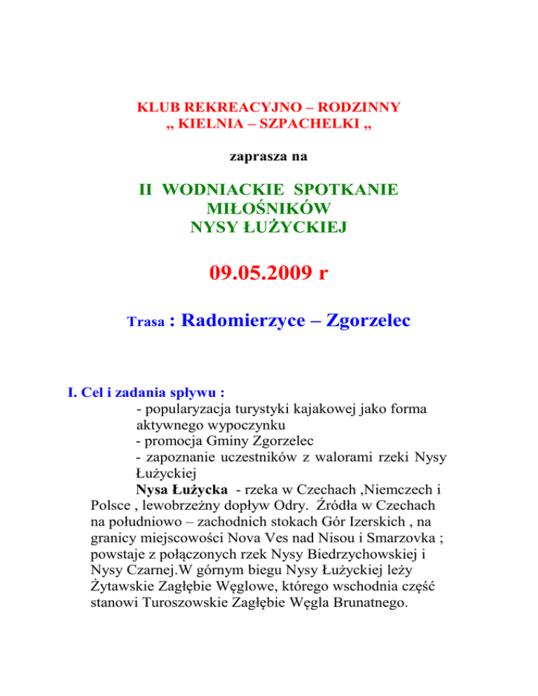 KLUB REKREACYJNO – RODZINNY ,, KIELNIA – SZPACHELKI ,, zaprasza na II WODNIACKIE SPOTKANIE MIŁOŚNIKÓW NYSY ŁUŻYCKIEJ 09.05.2009 r Trasa : Radomierzyce – Zgorzelec I. Cel i zadania spływu : - popularyzacja turystyki kajakowej jako forma aktywnego wypoczynku - promocja Gminy Zgorzelec - zapoznanie uczestników z walorami rzeki Nysy Łużyckiej Nysa Łużycka - rzeka w Czechach ,Niemczech i Polsce , lewobrzeżny dopływ Odry. Źródła w Czechach na południowo – zachodnich stokach Gór Izerskich , na granicy miejscowości Nova Ves nad Nisou i Smarzovka ; powstaje z połączonych rzek Nysy Biedrzychowskiej i Nysy Czarnej.W górnym biegu Nysy Łużyckiej leży Żytawskie Zagłębie Węglowe, którego wschodnia część stanowi Turoszowskie Zagłębie Węgla Brunatnego. Następnie Rzeka przepływa przez obszar Borów Dolnośląskich i tereny wschodnich Łużyc.Wpada do Odry na 542,4 km jej biegu w okolicach wsi Kosarzyn. Długość 251,6 km , przez 197,8 km rzeka wyznacza granicę pomiędzy Polską a Niemcami od 1945 roku /uznaną oficjalnie w latach 1950,1970,1991/.Górny odcinek rzeki o długości 53,8 km znajduje się na terenie Czech. Główne dopływy : Miedzianka, Witka, Czerwona Woda, Jędrzychowicki Potok, Skróda, Lubsza, Mandau, Pliβnitz. Ważniejsze miejscowości od źródeł: Jablonec nad Nisou, Liberec, Hradek nad Nisou, Zittau, Hirschfelde, Zgorzelec, Pieńsk, Forst, Gubin. II. Warunki uczestnictwa : 1. W spotkaniu mogą brać udział wodniacy zrzeszeni i niezrzeszeni , osoby pełnoletnie ,młodzież niepełnoletnia pod opieką osoby dorosłej o dobrym stanie zdrowia, posiadające umiejętności pływania . 2. Uczestnicy zgłaszają się na kartach zgłoszeń . 3. Koszt uczestnictwa w spotkaniu wynosi 20 zł kajak plus 30 zł koszty imprezy. Opłaty proszę wpłacać do skarbnika Kielni. 4. W razie nie przybycia na imprezę lub rezygnację – wpisowe nie podlega zwrotowi 5. Każdy uczestnik spotkania ubezpiecza się we własnym zakresie. III. Sprzęt: Uczestnicy biorą udział w spotkaniu na własnym sprzęcie lub sprzęcie udostępnionym z Klubu z Wolsztyna /kajaki, kamizelki asekuracyjne, wiosła/ za które ponosi pełną odpowiedzialność materialną. IV. Program spływu: 10.00 - 11.00 - weryfikacja uczestników /Most drogowy w Radomierzycach/ 11.15 - otwarcie spływu 15.00 - uroczyste zakończenie spływu /Zgorzelec , ul.Reja 31/ V. Obowiązki uczestnika spływu: - podporządkowanie się zarządzeniom kierownictwa spływu - przestrzeganie regulaminu spływu- zakaz spożywania alkoholu w czasie imprezy - wszyscy uczestnicy spływu płyną obowiązkowo w kamizelce asekuracyjnej Zgłaszający ponosi pełną odpowiedzialność za stan zdrowia i umiejętności pływackie. WODNIAKU - PAMIĘTAJ Warunkiem dobrej zabawy na spływie jest rozwaga i dobry humor. Aby to wszystko spełnić należy pamiętać ,że znajdujemy się na wodzie a woda jest mokra i niebezpieczna i dlatego pływamy w kamizelkach asekuracyjnych i musimy być przygotowani na różne okoliczności. Należy ze sobą zabrać w zależności od pogody : - krótkie spodenki ,koszulka z krótkim rękawkiem - długie spodnie, bluza polarowa - kurtka przeciwdeszczowa - sandały - poduszka do siedzenia - czapeczka z daszkiem - ręcznik - worek wodoszczelny na rzeczy - okulary przeciwsłoneczne, krem - dokumenty ,dowód osobisty, pieniądze - rzeczy na zmianę - inne rzeczy osobiste ,lekarstwa, - jedzenie, picie, w zależności od indywidualnych