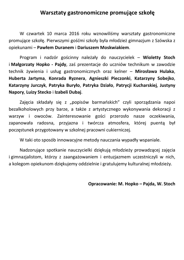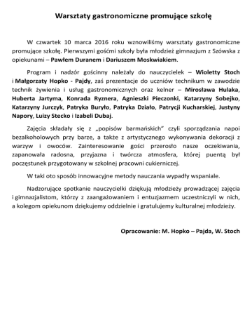 Warsztaty gastronomiczne promujące szkołę W czwartek 10 marca 2016 roku wznowiliśmy warsztaty gastronomiczne promujące szkołę. Pierwszymi gośćmi szkoły była młodzież gimnazjum z Szówska z opiekunami – Pawłem Duranem i Dariuszem Moskwiakiem. Program i nadzór gościnny należały do nauczycielek – Wioletty Stoch i Małgorzaty Hopko - Pajdy, zaś prezentacje do uczniów technikum w zawodzie technik żywienia i usług gastronomicznych oraz kelner – Mirosława Hulaka, Huberta Jartyma, Konrada Ryznera, Agnieszki Pieczonki, Katarzyny Sobejko, Katarzyny Jurczyk, Patryka Buryło, Patryka Działo, Patrycji Kucharskiej, Justyny Napory, Luizy Stecko i Izabeli Dubaj. Zajęcia składały się z „popisów barmańskich” czyli sporządzania napoi bezalkoholowych przy barze, a także z artystycznego wykonywania dekoracji z warzyw i owoców. Zainteresowanie gości przerosło nasze oczekiwania, zapanowała radosna, przyjazna i twórcza atmosfera, której puentą był poczęstunek przygotowany w szkolnej pracowni cukierniczej. W taki oto sposób innowacyjne metody nauczania wypadły wspaniale. Nadzorujące spotkanie nauczycielki dziękują młodzieży prowadzącej zajęcia i gimnazjalistom, którzy z zaangażowaniem i entuzjazmem uczestniczyli w nich, a kolegom opiekunom dziękujemy oddzielnie i gratulujemy kulturalnej młodzieży. Opracowanie: M. Hopko – Pajda, W. Stoch