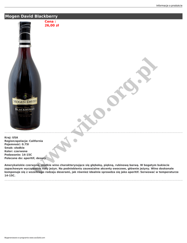 Informacje o produkcie Mogen David Blackberry w .v it o. or g. pl Cena : 26,00 zł w Kraj: USA Region/apelacja: California Pojemność: 0.75l Smak: słodkie Kolor: czerwone Podawanie: 14-15C Polecane do: aperitif, desery w Amerykańskie czerwone, słodkie wino charakteryzujące się głęboką, piękną, rubinową barwą. W bogatym bukiecie zapachowym wyczuwalne nuty jeżyn. Na podniebieniu zauważalne akcenty owocowe, głównie jeżyny. Wino doskonale komponuje się z wszelkiego rodzaju deserami, jak również idealnie sprawdza się jako aperitif. Serwować w temperaturze 14-15C. Wygenerowano w programie www.oscGold.com