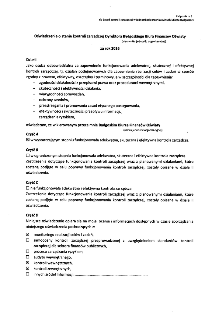 Załącznik nr 1 do Zasad kontroli zarządczej w jednostkach organizacyjnych Miasta Bydgoszczy Oświadczenie o stanie kontroli zarządczej Dyrektora Bydgoskiego Biura Finansów Oświaty (kierownika jednostki organizacyjnej) za rok 2016 Dział I Jako osoba odpowiedzialna za zapewnienie funkcjonowania adekwatnej, skutecznej i efektywnej kontroli zarządczej, tj. działań podejmowanych dla zapewnienia realizacji celów i zadań w sposób zgodny z prawem, efektywny, oszczędny i terminowy, a w szczególności dla zapewnienia: zgodności działalności z przepisami prawa oraz procedurami wewnętrznymi, skuteczności i efektywności działania, wiarygodności sprawozdań, ochrony zasobów, przestrzegania i promowania zasad etycznego postępowania, efektywności i skuteczności przepływu informacji, zarządzania ryzykiem, oświadczam, że w kierowanym przeze mnie Bydgoskim Biurze Finansów Oświaty (nazwa jednostki organizacyjnej) Część A El w wystarczającym stopniu funkcjonowała adekwatna, skuteczna i efektywna kontrola zarządcza. Część B O w ograniczonym stopniu funkcjonowała adekwatna, skuteczna i efektywna kontrola zarządcza. Zastrzeżenia dotyczące funkcjonowania kontroli zarządczej wraz z planowanymi działaniami, które zostaną podjęte w celu poprawy funkcjonowania kontroli zarządczej, zostały opisane w dziale II oświadczenia. Część C nie funkcjonowała adekwatna i efektywna kontrola zarządcza. Zastrzeżenia dotyczące funkcjonowania kontroli zarządczej wraz z planowanymi działaniami, które zostaną podjęte w celu poprawy funkcjonowania kontroli zarządczej, zostały opisane w dziale II oświadczenia. Część D Niniejsze oświadczenie opiera się na mojej ocenie i informacjach dostępnych w czasie sporządzania niniejszego oświadczenia pochodzących z: monitoringu realizacji celów i zadań, samooceny kontroli zarządczej przeprowadzonej z uwzględnieniem standardów kontroli zarządczej dla sektora finansów publicznych, procesu zarządzania ryzykiem, audytu wewnętrznego, kontroli wewnętrznych, kontroli zewnętrznych, innych źródeł informacji: Jednocześnie oświadczam, że nie są mi znane inne fakty lub okoliczności, które mogłyby wpłynąć na treść niniejszego oświadczenia. DYREKTOR Bydgoszcz, dnia 13 stycznia 2017 roku BydgoskieoBiię9 Finansów Oświaty --Mag (miejscowość i data) latyńska... (podpis kierownika jed ostki organizacyjnej) Dział II ł. Zastrzeżenia dotyczące funkcjonowania kontroli zarządczej w roku ubiegłym. Należy opisać przyczyny złożenia zastrzeżeń w zakresie funkcjonowania kontroli zarządczej, np. istotną słabość kontroli zarzqdczej, istotną nieprawidłowość w funkcjonowaniu jednostki, istotny cel lub zadanie, które nie zostało zrealizowane, niewystarczający monitoring kontroli zarzqdczej, wraz z podaniem , jeżeli to możliwe, elementu, którego zastrzeżenia dotyczą, w szczególności zgodności działalności z przepisami prawa oraz procedurami wewnętrznymi, skuteczności i efektywności działania, wiarygodności sprawozdań, ochrony zasobów, przestrzegania i promowania zasad etycznego postępowania, efektywności i skuteczności przepływu informacji lub zarządzania ryzykiem. 2. Planowane działania, które zostaną podjęte w celu poprawy funkcjonowania kontroli zarządczej. Należy opisać kluczowe działania, które zostaną podjęte w celu poprawy funkcjonowania kontroli zarządczej w odniesieniu do złożonych zastrzeżeń, wraz z podaniem terminu ich realizacji. Dział III Działania, które zostały podjęte w ubiegłym roku w celu poprawy funkcjonowania kontroli zarządczej. ł. Działania, które zostały zaplanowane na rok, którego dotyczy oświadczenie: Należy opisać najistotniejsze działania, jakie zostały podjęte w roku, którego dotyczy niniejsze oświadczenie w odniesieniu do planowanych działań wskazanych w dziale U oświadczenia za rok poprzedzający rok którego dotyczy niniejsze oświadczenie. Pozostałe działania: Należy opisać najistotniejsze działania, niezaplanowane w oświadczeniu za rok poprzedzający rok którego dotyczy niniejsze oświadczenie, jeżeli takie działania zostały podjęte. 2