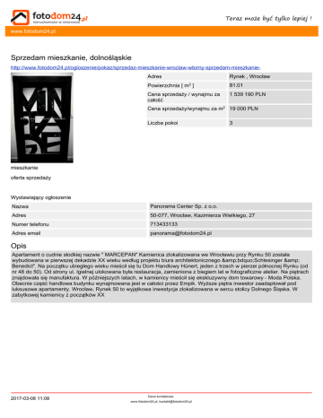 Teraz może być tylko lepiej ! www.fotodom24.pl Sprzedam mieszkanie, dolnośląskie http://www.fotodom24.pl/ogloszenie/pokaz/sprzedaz-mieszkanie-wroclaw-wtorny-sprzedam-mieszkanieAdres Rynek , Wrocław Powierzchnia [ m2 ] 81.01 Cena sprzedaży / wynajmu za całość 1 539 190 PLN Cena sprzedaży/wynajmu za m2 19 000 PLN Liczba pokoi 3 mieszkanie oferta sprzedaży Wystawiający ogłoszenie Nazwa Panorama Center Sp. z o.o. Adres 50-077, Wrocław, Kazimierza Wielkiego, 27 Numer telefonu 713433133 Adres email [email protected] Opis Apartament o cudnie słodkiej nazwie " MARCEPAN" Kamienica zlokalizowana we Wrocławiu przy Rynku 50 została wybudowana w pierwszej dekadzie XX wieku według projektu biura architektonicznego „Schlesinger & Benedict". Na początku ubiegłego wieku mieścił się tu Dom Handlowy Hünert, jeden z trzech w pierzei północnej Rynku (od nr 48 do 50). Od strony ul. Igielnej ulokowana była restauracja, zamieniona z biegiem lat w fotograficzne atelier. Na piętrach znajdowała się manufaktura. W późniejszych latach, w kamienicy mieścił się ekskluzywny dom towarowy - Moda Polska. Obecnie część handlowa budynku wynajmowana jest w całości przez Empik. Wyższe piętra inwestor zaadaptował pod luksusowe apartamenty. Wrocław, Rynek 50 to wyjątkowa inwestycja zlokalizowana w sercu stołicy Dolnego Śląska. W zabytkowej kamienicy z początków XX 2017-03-08 11:08 Dane kontaktowe: www.fotodom24.pl, [email protected]