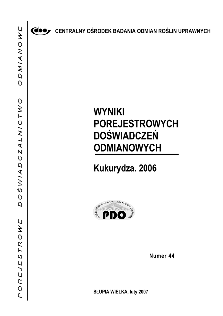 ODMIANOWE DOŚWIADCZALNICTWO POREJESTROWE CENTRALNY OŚRODEK BADANIA ODMIAN ROŚLIN UPRAWNYCH WYNIKI POREJESTROWYCH DOŚWIADCZEŃ ODMIANOWYCH Kukurydza. 2006 Numer 44 SŁUPIA WIELKA, luty 2007 Centralny Ośrodek Badania Odmian Roślin Uprawnych 63-022 Słupia Wielka tel.: 061 285 23 41 do 47 faks: 061 285 35 58 e-mail: [email protected] www.coboru.pl Dyrektor COBORU prof. dr hab. Edward S. Gacek Program Porejestrowego Doświadczalnictwa Odmianowego (PDO) Koordynatorzy: prof. dr hab. Edward S. Gacek mgr inż. Marcin Behnke Pracownia WGO Roślin Okopowych Kierownik dr inż. Jerzy Siódmiak Opracowanie mgr inż. Halina Heimann, mgr inż. Waldemar Janiak, dr inż. Jerzy Siódmiak Redaktor naukowy mgr inż. Józef Zych Rozpowszechnianie danych zawartych w niniejszej publikacji wyłącznie z podaniem COBORU jako źródła informacji COBO 17/2007 n. 480 WSTĘP Opracowanie zawiera wyniki badań wartości gospodarczej odmian kukurydzy ocenianych w doświadczeniach porejestrowych (PDO) w roku 2006 oraz dodatkowo, po raz pierwszy, wyniki odmian z katalogu UE (CCA) badanych w ramach doświadczeń rozpoznawczych w latach 2005-2006*. Celem badań było sprawdzenie aktualnej wartości tych odmian wpisanych do krajowego rejestru, które znajdują się w ofercie handlowej firm nasiennych, bądź będą dostępne w nadchodzących latach. Celem badań rozpoznawczych jest dostarczenie wstępnych informacji o przydatności do uprawy odmian nie zarejestrowanych w naszym kraju, które z racji wpisu do CCA mogą występować na naszym rynku nasiennym. Wyniki doświadczeń mają pomóc użytkownikom (plantatorom kukurydzy) w dokonaniu trafnego wyboru przy zakupie nasion. Przedstawiono je w formie tabelarycznej bez szerszej interpretacji merytorycznej i waloryzacji opisowej poszczególnych odmian. W roku 2006 założono dwie serie standardowe (16 doświadczeń na ziarno, 15 – na kiszonkę) oraz serię pięciu doświadczeń na ziarno w nietypowym dla tego kierunku użytkowania rejonie północnym. W ramach badań rozpoznawczych, do niektórych (co najmniej pięciu) doświadczeń każdej serii dołączono szereg odmian z katalogu unijnego (CCA). Na podstawie pozytywnych wyników w okresie dwóch lat badań rozpoznawczych, niektóre z tych odmian będą mogły uczestniczyć w standardowych doświadczeniach porejestrowych w roku 2007. W Laboratorium Chemiczno-Technologicznym SDOO w Słupi Wielkiej dodatkowo określono gęstość ziarna w stanie zsypnym (masę hektolitra ziarna) oraz zawartość skrobi i cukrów rozpuszczalnych w ziarnie. Materiał do badań nadesłano z trzech standardowych doświadczeń (Kościelna Wieś, Śrem Wójtostwo, Głubczyce). Masa hektolitra ziarna może być jednym z kryteriów przydatności ziarna do przemiału, a zawartość skrobi i cukrów – do przemysłu fermentacyjnego. Fundusze na prowadzenie części doświadczeń (w warunkach prowokacyjnych, siedem doświadczeń ziarnowych, sześć kiszonkowych, badanie odmian z katalogu unijnego) pochodziły spoza budżetu Oceny Odmian; w kosztach badań partycypował Polski Związek Producentów Kukurydzy (PZPK) i firmy nasienne – właściciele lub dystrybutorzy nasion. Pozostałe dziewięć doświadczeń na ziarno i dziewięć na kiszonkę sfinansowane zostały ze środków budżetowych (rys. 1). Do syntezy włączono wyniki tylko dziewięciu doświadczeń na ziarno, ośmiu na kiszonkę i czterech ziarnowych w rejonie północnym, a spośród doświadczeń rozpoznawczych – wyniki czterech doświadczeń ziarnowych, trzech kiszonkowych i czterech ziarnowych w rejonie północnym. Pozostałe doświadczenia zostały zdyskwalifikowane już przed zbiorem lub po zbiorze i obliczeniu wyników (rys. 1). Ocenie przydatności do uprawy na ziarno poddano 33 odmiany w standardowej serii doświadczeń i 16 odmian w rejonie północnym, a na kiszonkę - 23 odmiany. Pięć odmian uczestniczyło w badaniach na oba kierunki użytkowania (tab.1, 7). Spośród ogólnej liczby w roku 2006 rozpoznawczo badanych 64 odmian na ziarno, 28 na kiszonkę i 11 na ziarno w warunkach prowokacyjnych, drugi rok w tych doświadczeniach uczestniczyło odpowiednio: 26, 8 i 1 odmiana (tab. 18). Doświadczenia zakładano w czterech powtórzeniach. Zestawy odmian (z wyjątkiem ziarnowej serii w rejonie północnym) podzielono na trzy grupy wczesności: wczesną, średniowczesną i średniopóźną. Przy podziale na grupy kierowano się wynikami odmian w poprzednich latach badań. Poszczególne grupy zbierano w różnych terminach, po osiągnięciu dojrzałości technologicznej przez około połowę odmian odpowiednich grup. WARUNKI WEGETACJI I WYNIKI DOŚWIADCZEŃ Sezon wegetacyjny roku 2006 był skrajnie niesprzyjający dla prawidłowego wzrostu i rozwoju kukurydzy. Po siewach i w początkowej fazie wzrostu, do końca drugiej dekady czerwca, charakteryzował się niedoborem ciepła. Później, aż do końca lipca, na większej części obszaru kraju utrzymywał się silny deficyt opadów i bardzo wysokie temperatury (rys. 2). To spowodowało, że wiele roślin wcale nie wytworzyło kolb lub zaziarnienie kolb było niepełne. Ponadto osłabione rośliny, zwłaszcza na słabszych glebach, uległy bardzo silnemu porażeniu przez głownię kukurydzy (różnice odmianowe porażenia głownią były mniejsze niż różnice w miejscowościach). Korzystniejsze warunki wilgotnościowe notowano w południowej i południowo-wschodniej oraz północnej części kraju. Natomiast w sierpniu występowały częste deszcze, wszędzie przekraczające normy wieloletnie dla tego miesiąca. Rośliny, które jeszcze nie zaschły, ponownie zaczęły tworzyć nie zaziarnione kolby i nowe łodygi, zwiększając masę wegetatywną. W tych doświadczeniach na ziarno, gdzie najbardziej brakowało wody, znaczna część roślin nie tylko nie wydała kolb produkcyjnych, ale nawet nie wytworzyła wiech. Wyniki trzech doświadczeń zdyskwalifikowano po zbiorze plonu, gdyż jego wielkość nie prezentowała