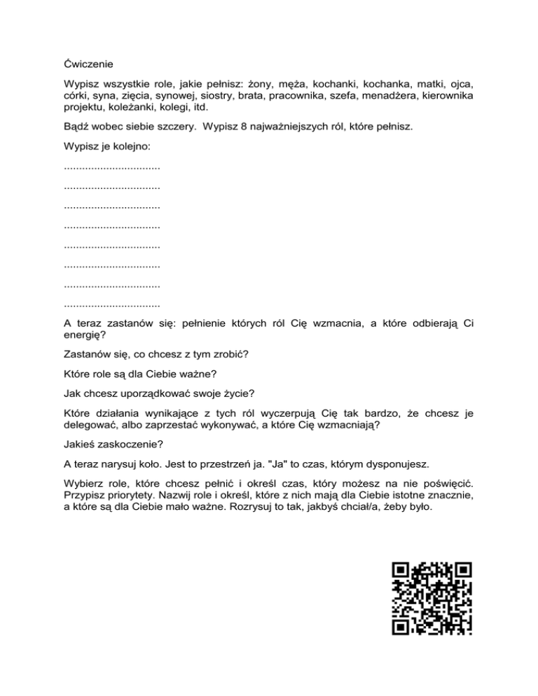 Ćwiczenie Wypisz wszystkie role, jakie pełnisz: żony, męża, kochanki, kochanka, matki, ojca, córki, syna, zięcia, synowej, siostry, brata, pracownika, szefa, menadżera, kierownika projektu, koleżanki, kolegi, itd. Bądź wobec siebie szczery. Wypisz 8 najważniejszych ról, które pełnisz. Wypisz je kolejno: ................................ ................................ ................................ ................................ ................................ ................................ ................................ ................................ A teraz zastanów się: pełnienie których ról Cię wzmacnia, a które odbierają Ci energię? Zastanów się, co chcesz z tym zrobić? Które role są dla Ciebie ważne? Jak chcesz uporządkować swoje życie? Które działania wynikające z tych ról wyczerpują Cię tak bardzo, że chcesz je delegować, albo zaprzestać wykonywać, a które Cię wzmacniają? Jakieś zaskoczenie? A teraz narysuj koło. Jest to przestrzeń ja. "Ja" to czas, którym dysponujesz. Wybierz role, które chcesz pełnić i określ czas, który możesz na nie poświęcić. Przypisz priorytety. Nazwij role i określ, które z nich mają dla Ciebie istotne znacznie, a które są dla Ciebie mało ważne. Rozrysuj to tak, jakbyś chciał/a, żeby było. Przykładowe koło klientki (praca nie zakończona). Kolor niebieski - moja przestrzeń, przestrzeń "ja" (tydzień = 168 godzin) Kolor czerwony - bycie żoną Kolor żółty - bycie matką Kolor fioletowy - pracownikiem /Jeżeli pracę wykonujesz wraz z małżonkiem, możesz połączyć koła./ Co teraz myślisz? Czy teraz jesteś zadowolony/a? Jaki pierwszy krok chcesz teraz podjąć? Jaki będzie miało to wpływa na Ciebie i osoby z Twojego otoczenia? Co chcesz zatem z tym zrobić?