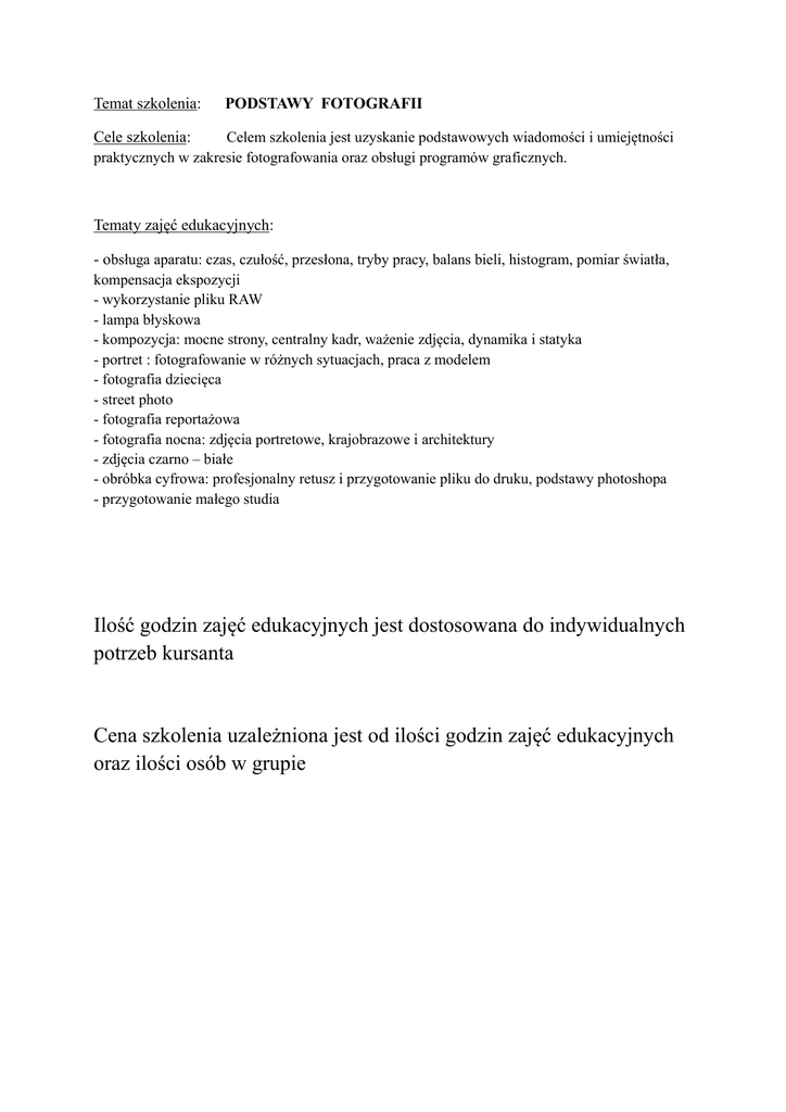 Temat szkolenia: PODSTAWY FOTOGRAFII Cele szkolenia: Celem szkolenia jest uzyskanie podstawowych wiadomości i umiejętności praktycznych w zakresie fotografowania oraz obsługi programów graficznych. Tematy zajęć edukacyjnych: - obsługa aparatu: czas, czułość, przesłona, tryby pracy, balans bieli, histogram, pomiar światła, kompensacja ekspozycji - wykorzystanie pliku RAW - lampa błyskowa - kompozycja: mocne strony, centralny kadr, ważenie zdjęcia, dynamika i statyka - portret : fotografowanie w różnych sytuacjach, praca z modelem - fotografia dziecięca - street photo - fotografia reportażowa - fotografia nocna: zdjęcia portretowe, krajobrazowe i architektury - zdjęcia czarno – białe - obróbka cyfrowa: profesjonalny retusz i przygotowanie pliku do druku, podstawy photoshopa - przygotowanie małego studia Ilość godzin zajęć edukacyjnych jest dostosowana do indywidualnych potrzeb kursanta Cena szkolenia uzależniona jest od ilości godzin zajęć edukacyjnych oraz ilości osób w grupie