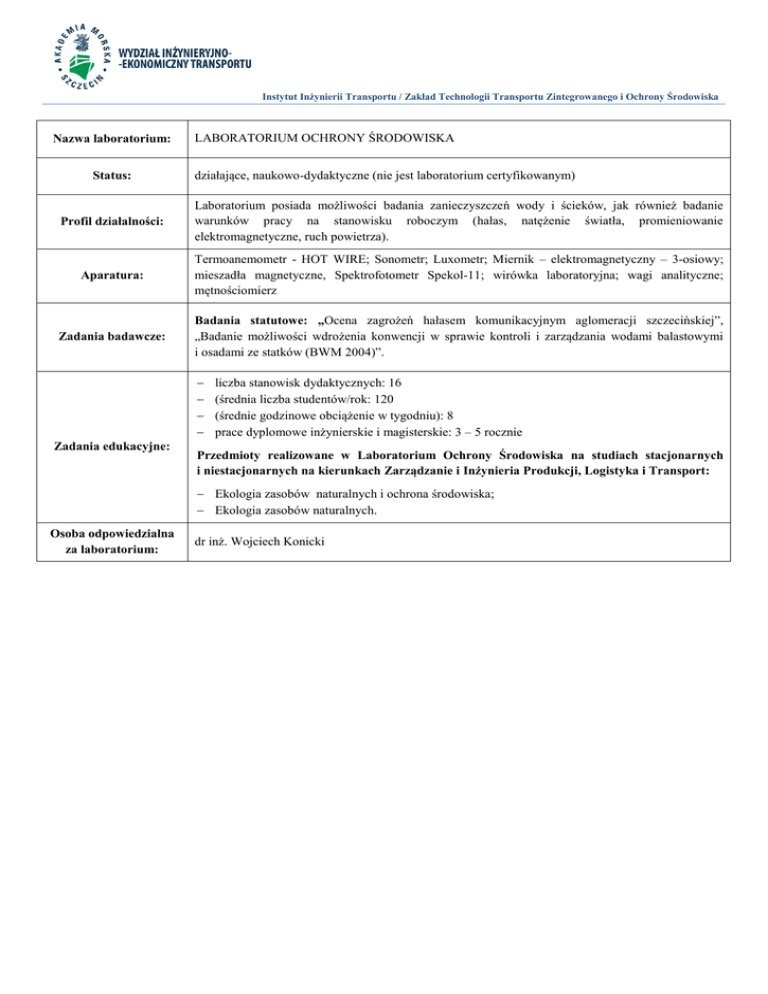 Instytut Inżynierii Transportu / Zakład Technologii Transportu Zintegrowanego i Ochrony Środowiska Nazwa laboratorium: Status: LABORATORIUM OCHRONY ŚRODOWISKA działające, naukowo-dydaktyczne (nie jest laboratorium certyfikowanym) Profil działalności: Laboratorium posiada możliwości badania zanieczyszczeń wody i ścieków, jak również badanie warunków pracy na stanowisku roboczym (hałas, natężenie światła, promieniowanie elektromagnetyczne, ruch powietrza). Aparatura: Termoanemometr - HOT WIRE; Sonometr; Luxometr; Miernik – elektromagnetyczny – 3-osiowy; mieszadła magnetyczne, Spektrofotometr Spekol-11; wirówka laboratoryjna; wagi analityczne; mętnościomierz Zadania badawcze: Badania statutowe: „Ocena zagrożeń hałasem komunikacyjnym aglomeracji szczecińskiej”, „Badanie możliwości wdrożenia konwencji w sprawie kontroli i zarządzania wodami balastowymi i osadami ze statków (BWM 2004)”. Zadania edukacyjne: liczba stanowisk dydaktycznych: 16 (średnia liczba studentów/rok: 120 (średnie godzinowe obciążenie w tygodniu): 8 prace dyplomowe inżynierskie i magisterskie: 3 – 5 rocznie Przedmioty realizowane w Laboratorium Ochrony Środowiska na studiach stacjonarnych i niestacjonarnych na kierunkach Zarządzanie i Inżynieria Produkcji, Logistyka i Transport: Ekologia zasobów naturalnych i ochrona środowiska; Ekologia zasobów naturalnych. Osoba odpowiedzialna za laboratorium: dr inż. Wojciech Konicki