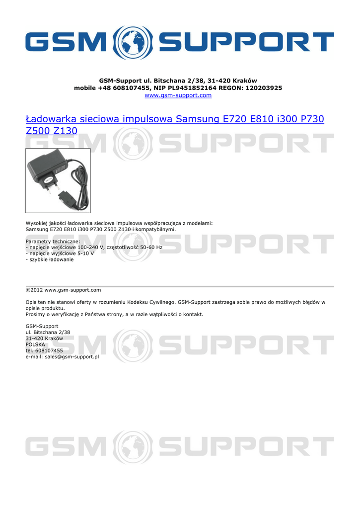 GSM-Support ul. Bitschana 2/38, 31-420 Kraków mobile +48 608107455, NIP PL9451852164 REGON: 120203925 www.gsm-support.com Ładowarka sieciowa impulsowa Samsung E720 E810 i300 P730 Z500 Z130 Wysokiej jakości ładowarka sieciowa impulsowa współpracująca z modelami: Samsung E720 E810 i300 P730 Z500 Z130 i kompatybilnymi. Parametry techniczne: - napięcie wejściowe 100-240 V, częstotliwość 50-60 Hz - napięcie wyjściowe 5-10 V - szybkie ładowanie ©2012 www.gsm-support.com Opis ten nie stanowi oferty w rozumieniu Kodeksu Cywilnego. GSM-Support zastrzega sobie prawo do możliwych błędów w opisie produktu. Prosimy o weryfikację z Państwa strony, a w razie wątpliwości o kontakt. GSM-Support ul. Bitschana 2/38 31-420 Kraków POLSKA tel. 608107455 e-mail: [email protected] Powered by TCPDF (www.tcpdf.org)