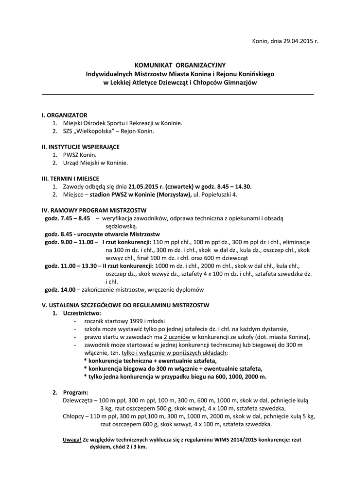 Konin, dnia 29.04.2015 r. KOMUNIKAT ORGANIZACYJNY Indywidualnych Mistrzostw Miasta Konina i Rejonu Konińskiego w Lekkiej Atletyce Dziewcząt i Chłopców Gimnazjów I. ORGANIZATOR 1. Miejski Ośrodek Sportu i Rekreacji w Koninie. 2. SZS „Wielkopolska” – Rejon Konin. II. INSTYTUCJE WSPIERAJĄCE 1. PWSZ Konin. 2. Urząd Miejski w Koninie. III. TERMIN I MIEJSCE 1. Zawody odbędą się dnia 21.05.2015 r. (czwartek) w godz. 8.45 – 14.30. 2. Miejsce – stadion PWSZ w Koninie (Morzysław), ul. Popiełuszki 4. IV. RAMOWY PROGRAM MISTRZOSTW godz. 7.45 – 8.45 – weryfikacja zawodników, odprawa techniczna z opiekunami i obsadą sędziowską. godz. 8.45 - uroczyste otwarcie Mistrzostw godz. 9.00 – 11.00 – I rzut konkurencji: 110 m ppł chł., 100 m ppł dz., 300 m ppł dz i chł., eliminacje na 100 m dz. i chł., 300 m dz. i chł., skok w dal dz., kula dz., oszczep chł., skok wzwyż chł., finał 100 m dz. i chł. oraz 600 m dziewcząt godz. 11.00 – 13.30 – II rzut konkurencji: 1000 m dz. i chł., 2000 m chł., skok w dal chł., kula chł., oszczep dz., skok wzwyż dz., sztafety 4 x 100 m dz. i chł., sztafeta szwedzka dz. i chł. godz. 14.00 – zakończenie mistrzostw, wręczenie dyplomów V. USTALENIA SZCZEGÓŁOWE DO REGULAMINU MISTRZOSTW 1. Uczestnictwo: - rocznik startowy 1999 i młodsi - szkoła może wystawić tylko po jednej sztafecie dz. i chł. na każdym dystansie, - prawo startu w zawodach ma 2 uczniów w konkurencji ze szkoły (dot. miasta Konina), - zawodnik może startować w jednej konkurencji technicznej lub biegowej do 300 m włącznie, tzn. tylko i wyłącznie w poniższych układach: * konkurencja techniczna + ewentualnie sztafeta, * konkurencja biegowa do 300 m włącznie + ewentualnie sztafeta, * tylko jedna konkurencja w przypadku biegu na 600, 1000, 2000 m. 2. Program: Dziewczęta – 100 m ppł, 300 m ppł, 100 m, 300 m, 600 m, 1000 m, skok w dal, pchnięcie kulą 3 kg, rzut oszczepem 500 g, skok wzwyż, 4 x 100 m, sztafeta szwedzka, Chłopcy – 110 m ppł, 300 m ppł,100 m, 300 m, 1000 m, 2000 m, skok w dal, pchnięcie kulą 5 kg, rzut oszczepem 600 g, skok wzwyż, 4 x 100 m, sztafeta szwedzka. Uwaga! Ze względów technicznych wyklucza się z regulaminu WIMS 2014/2015 konkurencje: rzut dyskiem, chód 2 i 3 km. 2 3. Sposób przeprowadzenia mistrzostw: 100, 110, 300 m ppł - start zawodników w seriach z rozstawieniem zawodników z jednej szkoły (2 tory), - kolejność miejsc wg uzyskanych czasów, - przy jednakowym czasie o miejscu decyduje wyższe miejsce zajęte w serii, 100 m - eliminacje – w seriach z rozstawieniem zawodników z jednej szkoły, - finał – 6 zawodników w serii z najlepszymi czasami, przy jednakowym czasie o awansie do finału decyduje wyższe miejsce zajęte w eliminacjach (do finału wchodzi max 3 zawodników z miasta Konina), 300 m - start zawodników w seriach z rozstawieniem zawodników z jednej szkoły, - kolejność miejsc wg uzyskanych czasów, - przy jednakowym czasie o miejscu decyduje wyższe miejsce zajęte w serii, 600, 1000, 2000 m - start zawodników w seriach , - kolejność miejsc wg uzyskanych czasów, - przy jednakowym czasie o miejscu decyduje wyższe miejsce zajęte w serii, Skok w dal, kula, oszczep - 3 próby eliminacyjne, dla 8 najlepszych zawodników z eliminacji – 3 próby finałowe (do finału wchodzi max 3 zawodników z miasta Konina) Skok wzwyż – wysokość początkowa dziewczęta: 125 cm, chłopcy: 135 cm (może ulec zmianie) Sztafety - start odbywa się po zakończeniu wszystkich konkurencji, kolejność miejsc wg uzyskanych czasów Uwaga! 1. Ze względu na pokrycie bieżni tartanem – maksymalna dopuszczalna długość kolców to 6 mm. 2. Ze względów bezpieczeństwa skok wzwyż może odbywać się wyłącznie w obuwiu płaskim (bez kolców!). 3. Podczas rozgrywania konkurencji na płycie stadionu mogą przebywać wyłącznie startujący zawodnicy. VI. FINAŁ WOJEWÓDZKI 1. Do zawodów wojewódzkich awansuje 3 najlepszych zawodników/-czek z konkurencji indywidualnych i 2 sztafety. 2. Termin zawodów wojewódzkich zostanie ogłoszony przez SZS Wielkopolska. Organizator