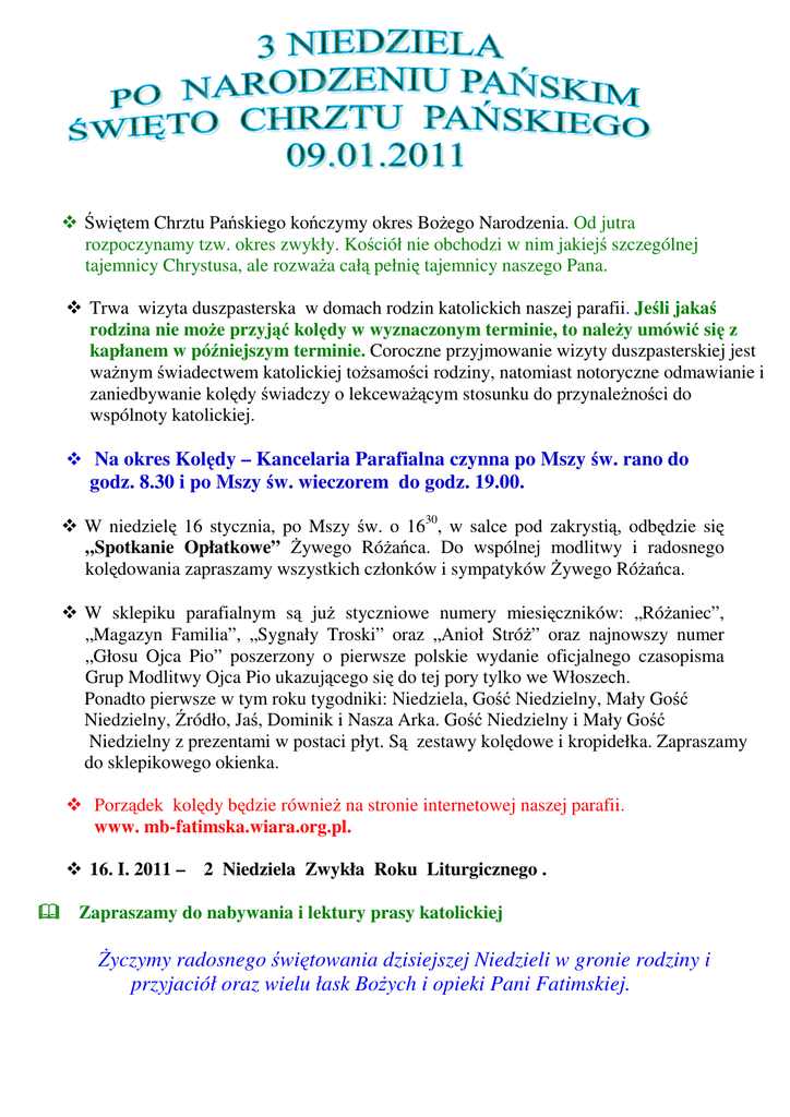 Świętem Chrztu Pańskiego kończymy okres Bożego Narodzenia. Od jutra rozpoczynamy tzw. okres zwykły. Kościół nie obchodzi w nim jakiejś szczególnej tajemnicy Chrystusa, ale rozważa całą pełnię tajemnicy naszego Pana. Trwa wizyta duszpasterska w domach rodzin katolickich naszej parafii. Jeśli jakaś rodzina nie może przyjąć kolędy w wyznaczonym terminie, to należy umówić się z kapłanem w późniejszym terminie. Coroczne przyjmowanie wizyty duszpasterskiej jest ważnym świadectwem katolickiej tożsamości rodziny, natomiast notoryczne odmawianie i zaniedbywanie kolędy świadczy o lekceważącym stosunku do przynależności do wspólnoty katolickiej. Na okres Kolędy – Kancelaria Parafialna czynna po Mszy św. rano do godz. 8.30 i po Mszy św. wieczorem do godz. 19.00. W niedzielę 16 stycznia, po Mszy św. o 1630, w salce pod zakrystią, odbędzie się „Spotkanie Opłatkowe” Żywego Różańca. Do wspólnej modlitwy i radosnego kolędowania zapraszamy wszystkich członków i sympatyków Żywego Różańca. W sklepiku parafialnym są już styczniowe numery miesięczników: „Różaniec”, „Magazyn Familia”, „Sygnały Troski” oraz „Anioł Stróż” oraz najnowszy numer „Głosu Ojca Pio” poszerzony o pierwsze polskie wydanie oficjalnego czasopisma Grup Modlitwy Ojca Pio ukazującego się do tej pory tylko we Włoszech. Ponadto pierwsze w tym roku tygodniki: Niedziela, Gość Niedzielny, Mały Gość Niedzielny, Źródło, Jaś, Dominik i Nasza Arka. Gość Niedzielny i Mały Gość Niedzielny z prezentami w postaci płyt. Są zestawy kolędowe i kropidełka. Zapraszamy do sklepikowego okienka. Porządek kolędy będzie również na stronie internetowej naszej parafii. www. mb-fatimska.wiara.org.pl. 16. I. 2011 – 2 Niedziela Zwykła Roku Liturgicznego . Zapraszamy do nabywania i lektury prasy katolickiej Życzymy radosnego świętowania dzisiejszej Niedzieli w gronie rodziny i przyjaciół oraz wielu łask Bożych i opieki Pani Fatimskiej.