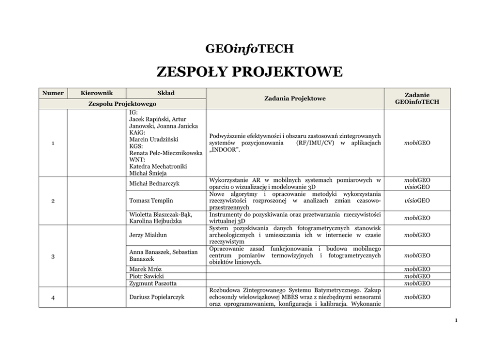GEOinfoTECH ZESPOŁY PROJEKTOWE Numer 1 Kierownik Skład Zespołu Projektowego IG: Jacek Rapiński, Artur Janowski, Joanna Janicka KAiG: Marcin Uradziński KGS: Renata Pelc-Miecznikowska WNT: Katedra Mechatroniki Michał Śmieja Michał Bednarczyk 2 Tomasz Templin Wioletta Błaszczak-Bąk, Karolina Hejbudzka Jerzy Miałdun 3 Anna Banaszek, Sebastian Banaszek Zadania Projektowe Zadanie GEOinfoTECH Podwyższenie efektywności i obszaru zastosowań zintegrowanych systemów pozycjonowania (RF/IMU/CV) w aplikacjach „INDOOR”. mobiGEO Wykorzystanie AR w mobilnych systemach pomiarowych w oparciu o wizualizację i modelowanie 3D Nowe algorytmy i opracowanie metodyki wykorzystania rzeczywistości rozproszonej w analizach zmian czasowoprzestrzennych Instrumenty do pozyskiwania oraz przetwarzania rzeczywistości wirtualnej 3D System pozyskiwania danych fotogrametrycznych stanowisk archeologicznych i umieszczania ich w internecie w czasie rzeczywistym Opracowanie zasad funkcjonowania i budowa mobilnego centrum pomiarów termowizyjnych i fotogrametrycznych obiektów liniowych. Marek Mróz Piotr Sawicki Zygmunt Paszotta 4 Dariusz Popielarczyk mobiGEO visioGEO visioGEO mobiGEO mobiGEO mobiGEO mobiGEO mobiGEO mobiGEO Rozbudowa Zintegrowanego Systemu Batymetrycznego. Zakup echosondy wielowiązkowej MBES wraz z niezbędnymi sensorami oraz oprogramowaniem, konfiguracja i kalibracja. Wykonanie mobiGEO 1 testów. 5 Monika Biryło, Wojciech Jarmołowski Zakup grawimetru względnego CG-5 Autograv mobiGEO Paweł Wielgosz Laboratorium nowych metod pozyskiwania gadanych/geoinformacji technikami GNSS (GPS, GLONASS, Galileo, BDS) mobiGEO Kamil Kowalczyk Laboratorium monitoringu strukturalnego i analiz transportu mobiGEO visioGEO Adam Doskocz Budowa Mobilnego Wielopłaszczyznowego/Wielowątkowego Centrum Pozyskiwania Geoinformacji mobiGEO Opracowanie zasad projektowania i kształtowanie bezpiecznej przestrzeni planistycznej infoGEO visioGEO Kształtowanie przestrzeni wiejskiej z uwzględnieniem zmian klimatu Budowa centrum geoinformacji związanej z ochrona terenów o dużym potencjale ekologicznym, krajoznawczym, turystycznym Ochrona dziedzictwa kulturowego oraz wyznaczanie obszarów zdegradowanych na potrzeby rewitalizacji miast infoGEO visioGEO Andrzej Boboić Andrzej Biłozor Małgorzata RenigierBiłozor Katarzyna Kocur-Bera 6 Elżbieta Lewandowicz Anna Banaszek Sabina Źróbek Radosław Cellmer Mirosław Bełej Marek Walacik Tomasz Bajerowski, Marek Ogryzek, Anna Kowalczyk, Karol Szuniewicz Anna Banaszek 7 8 Elżbieta Lewandowicz Ryszard Cymerman, Marek Ogryzek, Monika Wasilewicz infoGEO infoGEO Laboratorium dynamicznego wartościowania przestrzeni infoGEO visioGEO „Bezpieczne Kortowo” Przestrzenią infoGEO – Portal Internetowy Zarządzania "SmartCampus UWM" - realizacja koncepcji Smart City w celu tworzenia usług i aplikacji ICT dla społeczeństwa, podmiotów gospodarczych i organów administracji publicznej, stanowiących elementy systemu miasta Budowa Centrum Geoinformacji o Kortowie infoGEO visioGEO infoGEO GIS-Portal Inżynierii Przestrzennej infoGEO Elżbieta Lewandowicz Pomiar, prezentacja i wizualizacja 3D wybranych przestrzeni WM w aspekcie promocji regionu visioGEO Rafał Kazimierczak Opracowanie zasad funkcjonowania analizatora obciążenia infoGEO 2 Cezary Kowalczyk 9 Tomasz Bajerowski, Anna Kowalczyk Marta Gross 10 11 12 13 Andrzej Muczyński Agnieszka Dawidowicz Lech Kotlewski Jan Kuryj Janusz Jasiński Zintegrowany System Informacji o Nieruchomościach Krystyna Kurowska OZE Dariusz Konieczny Kształtowanie systemu dróg rowerowych Katarzyna Pawlewicz Partycypacja społeczna Dariusz Gościewski Modelowanie dużych zbiorów danych Małgorzata GerusGościewska Beata Wieczorek Renata Pelc-Mieczkowska Agnieszka ZwirowiczRutkowska Agnieszka Trystuła Grzegorz Czech 14 środowiska przez podmioty i rzeczy ruchome Zintegrowane Centrum Geoinformacji: 1. Studium Geoinformatyczne 2. Studium Modelowania i Analiz Przestrzennych 3. Laboratorium Geowizualizacji 4. Poligon geoinformacyjny wraz z Mobilnym Laboratorium Geoinformacyjnym Stworzenie platformy ułatwiającej gospodarowanie mieniem publicznym Jadwiga Konieczna Sebastian Goraj Modelowanie dużych zbiorów danych GIS 3D GIS 3D GIS 3D, inżynieria systemów wiedzy GIS 3D Transformacja zasobów informacyjnych katastru w kierunku katastru 4D Transformacja zasobów informacyjnych katastru w kierunku katastru 4D Transformacja zasobów informacyjnych katastru w kierunku katastru 4D mobiGEO infoGEO visioGEO infoGEO infoGEO infoGEO infoGEO infoGEO infoGEO infoGEO visioGEO infoGEO visioGEO infoGEO visioGEO infoGEO visioGEO infoGEO visioGEO visioGEO visioGEO infoGEO visioGEO infoGEO visioGEO infoGEO visioGEO infoGEO visioGEO infoGEO visioGEO 3 4 ODRĘBNE PROJEKTY Numer Kierownik Skład Zespołu Projektowego 1 Numer 2 Numer 3 Elżbieta Lewandowicz Kierownik Elżbieta Lewandowicz Skład Zespołu Projektowego Anna Celmer Anna Celmer Kierownik Skład Zespołu Projektowego Zbigniew Sujkowski Zbigniew Sujkowski Zadania Projektowe Zadanie GEOinfoTECH Budowa systemu certyfikacji jakości produktów i usług w gospodarce Warmii i Mazur i ich REKOMENDACJI UNIWERSYTECKIEJ ODRĘBNY PROJEKT Zadania Projektowe Zadanie GEOinfoTECH Atrakcyjność i kreatywność miast Zadania Projektowe Symulatory kosztów, ujęcie procesowe zarządzania ODRĘBNY PROJEKT Zadanie GEOinfoTECH ODRĘBNY PROJEKT 5