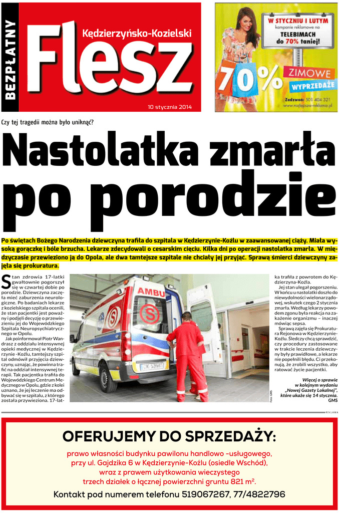 BE Z PŁATNY Kędzierzyńsko-Kozielski 10 stycznia 2014 Czy tej tragedii można było uniknąć? Nastolatka zmarła po porodzie Po świętach Bożego Narodzenia dziewczyna trafiła do szpitala w Kędzierzynie-Koźlu w zaawansowanej ciąży. Miała wysoką gorączkę i bóle brzucha. Lekarze zdecydowali o cesarskim cięciu. Kilka dni po operacji nastolatka zmarła. W międzyczasie przewieziono ją do Opola, ale dwa tamtejsze szpitale nie chciały jej przyjąć. Sprawą śmierci dziewczyny zajęła się prokuratura. S ka trafiła z powrotem do Kędzierzyna-Koźla. Jej stan ulegał pogorszeniu. W końcu u nastolatki doszło do niewydolności wielonarządowej, wskutek czego 2 stycznia zmarła. Według lekarzy powodem zgonu była reakcja na zakażenie organizmu – inaczej mówiąc sepsa. Sprawą zajęła się Prokuratura Rejonowa w KędzierzynieKoźlu. Śledczy chcą sprawdzić, czy procedury zastosowane w trakcie leczenia dziewczyny były prawidłowe, a lekarze nie popełnili błędu. Ci przekonują, że zrobili wszystko, aby ratować życie pacjentki. tan zdrowia 17-latki gwałtownie pogorszył się w czwartej dobie po porodzie. Dziewczyna zaczęła mieć zaburzenia neurologiczne. Po badaniach lekarze z kozielskiego szpitala ocenili, że stan pacjentki jest poważny i podjęli decyzję o przewiezieniu jej do Wojewódzkiego Szpitala Neuropsychiatrycznego w Opolu. Jak poinformował Piotr Wandrasz z oddziału intensywnej opieki medycznej w Kędzierzynie -Koźlu, tamtejszy szpital odmówił przyjęcia dziewczyny, uznając, że powinna trafić na oddział intensywnej terapii. Tak pacjentka trafiła do Wojewódzkiego Centrum Medycznego w Opolu, gdzie z kolei uznano, że jej leczenie ma odbywać się w szpitalu, z którego została przywieziona. 17-lat- Więcej o sprawie w kolejnym wydaniu „Nowej Gazety Lokalnej”, które ukaże się 14 stycznia. GMS OFERUJEMY DO SPRZEDAŻY: prawo własności budynku pawilonu handlowo -usługowego, przy ul. Gajdzika 6 w Kędzierzynie-Koźlu (osiedle Wschód), wraz z prawem użytkowania wieczystego trzech działek o łącznej powierzchni gruntu 821 m2. Kontakt pod numerem telefonu 519067267, 77/4822796 2 10 stycznia 2014 Sukces młodych sportowców z PSP nr 11 Trzeci tytuł dla Jedenastki Foto: Justyna Łabuś W Kędzierzynie-Koźlu odbyły się finały wojewódzkie rozgrywek w dwa ognie dziewcząt i chłopców. Barw naszego miasta bronili uczniowie dwóch szkół: PSP nr 9 oraz PSP nr 11. Fotografie Justyny Łabuś wykorzystane w nowej linii kreatywnej galerii Odrzańskie Ogrody Nowa linia kreatywna galerii Odrzańskie Ogrody Odkryj własny styl Barwne, eleganckie postacie kobiet na tle czarujących, znanych i lubianych miejsc Kędzierzyna-Koźla i okolic przemówią z reklamą galerii Odrzańskie Ogrody w 2014 roku. N owa linia kreatywna galerii Odrzańskie Ogrody na rok 2014 powstała w myśl hasła „Wyraź siebie na tle swoich miejsc”. Pierwsza odsłona obowiązującej w tym roku linii kreatywnej, komunikująca targi ślubne, pojawiła się już na nośnikach outdoorowych. Ten projekt to powiązanie nowoczesności i stylu, wyrażonych poprzez dynamizm kobiecych postaci, z pięknem lokalnych miejsc Kędzierzyna-Koźla i okolic. Zdjęcia wykorzystane do projektu pochodzą z portfolio Justyny Łabuś – fotografa z Kędzierzyna-Koźla. - Moim zdaniem wykorzystanie zdjęć przedstawiających najbardziej urokliwe miejsca naszego miasta i regionu w linii kreatywnej galerii Odrzańskie Ogrody to ciekawy pomysł. Cieszę się, że zostałam zaproszona do współpracy przy tym projekcie. Mam nadzieję, że prezentacja bardziej i mniej znanych kędzierzyńsko-kozielskich obiektów i miejsc sprawi, iż mieszkańcy zwrócą większą uwagę na nie- „Flesz” – ukazuje się w Kędzierzynie-Koźlu i Powiecie Kędzierzyńsko-Kozielskim Adres redakcji: al. Jana Pawła II 36, 47-220 Kędzierzyn-Koźle Tel./fax (77) 483-40-49 E-mail: [email protected] Redaktor naczelny: Grzegorz Łabaj Sekretarz redakcji: Grzegorz Stępień Projekt graficzny i skład: greatio.com, tel. 601-422-132; Reklama: tel. 501 404 321, (77) 481-99-76 Nakład: 10 000 egz. Wydawca: Lokalna Sp. z o.o. e-mail: [email protected] Adres: al. Jana Pawła II 36, 47-220 Kędzierzyn-Koźle Tel.: (77) 483-46-59 Redakcja nie zwraca materiałów niezamówionych oraz zastrzega sobie prawo do redagowania i skracania nadesłanych tekstów. Za treść reklam i ogłoszeń redakcja nie odpowiada. docenione dotąd walory kulturowe, krajobrazowe i rekreacyjne przestrzeni miejskiej. Myślę, że dzięki powiązaniu kampanii reklamowej z obrazami miejscowych atrakcji odczują oni integralność galerii z lokalnym środowiskiem. Natomiast w klientach spoza miasta kampania wzbudzi zainteresowanie i zachęci do bliższego poznania okolicy – mówi Justyna Łabuś. - Chcemy, aby marka galerii Odrzańskie Ogrody postrzegana była jako miejsce inspirujące do odkrywania własnego stylu, tworzenia własnych modowych kreacji. Równocześnie pragniemy pokreślić, że jest to przestrzeń społeczna otwarta na lokalne inicjatywy, dbająca o kulturę, rozwój i promocję miasta. Decydując się na wykorzystanie w linii kreatywnej motywów i zdjęć z Kędzierzyna-Koźla, chcieliśmy przyczynić się do dodatkowej promocji miasta i regionu – mówi Jadwiga Klejdysz, marketing manager Odrzańskich Ogrodów. WN D o ścisłego finału, drogą wcześniejszych eliminacji, awansowały dziewczęta i chłopcy z PSP nr 11 oraz chłopcy z PSP nr 9. Pierwsze do boju ruszyły dziewczęta, które wygrały z Dobrodzieniem 27:16. Niestety, pozostałe finalistki okazały się zbyt mocne i Jedenastka uległa PSP 29 z Opola 14:26 oraz ZSP z Kórnicy 9:16. Dwa zwycięstwa dały jednak podopiecznym Barbary Bednarczyk brązowy medal. Drużyna wystąpiła w składzie: Julia Prochera, Aleksandra Niemiec, Aleksandra Stańczyk, Julia Dzialuk, Wiktoria Jewtuch, Wiktoria Gwóźdź, Dominika Basa, Oliwia Kuchta, Oliwia Mordak, Martyna Krupowies. Późnie