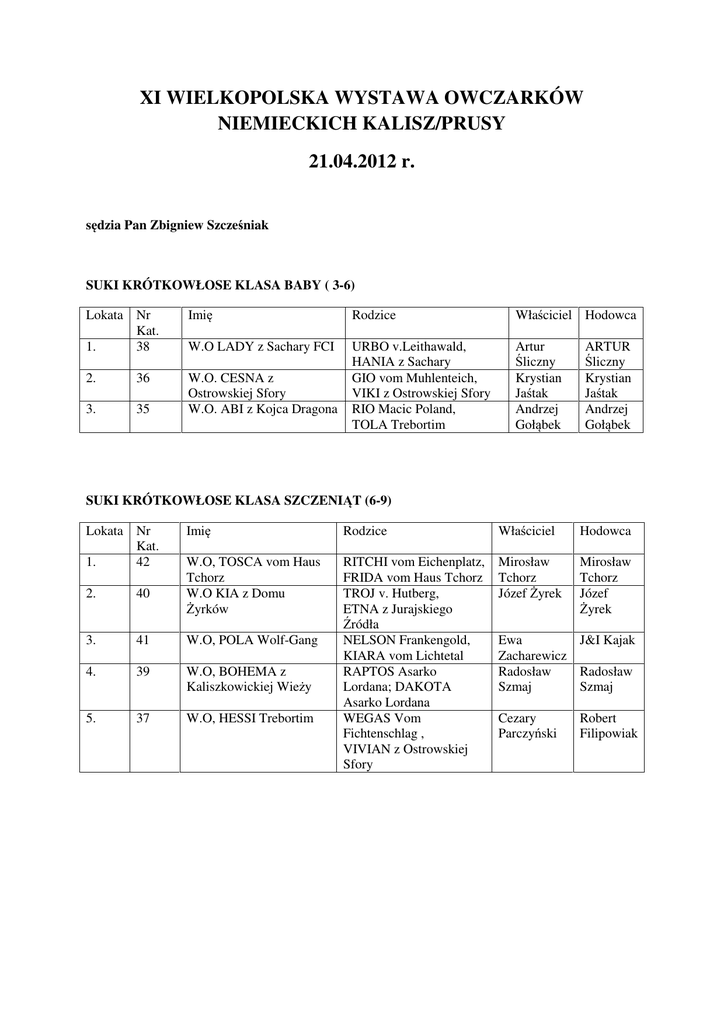 XI WIELKOPOLSKA WYSTAWA OWCZARKÓW NIEMIECKICH KALISZ/PRUSY 21.04.2012 r. sędzia Pan Zbigniew Szcześniak SUKI KRÓTKOWŁOSE KLASA BABY ( 3-6) Lokata Nr Kat. 1. 38 2. 36 3. 35 Imię Rodzice Właściciel Hodowca W.O LADY z Sachary FCI URBO v.Leithawald, HANIA z Sachary GIO vom Muhlenteich, VIKI z Ostrowskiej Sfory RIO Macic Poland, TOLA Trebortim Artur Śliczny Krystian Jaśtak Andrzej Gołąbek W.O. CESNA z Ostrowskiej Sfory W.O. ABI z Kojca Dragona ARTUR Śliczny Krystian Jaśtak Andrzej Gołąbek SUKI KRÓTKOWŁOSE KLASA SZCZENIĄT (6-9) Lokata Nr Kat. 1. 42 Imię Rodzice Właściciel Hodowca W.O, TOSCA vom Haus Tchorz W.O KIA z Domu Żyrków RITCHI vom Eichenplatz, FRIDA vom Haus Tchorz TROJ v. Hutberg, ETNA z Jurajskiego Źródła NELSON Frankengold, KIARA vom Lichtetal RAPTOS Asarko Lordana; DAKOTA Asarko Lordana WEGAS Vom Fichtenschlag , VIVIAN z Ostrowskiej Sfory Mirosław Tchorz Józef Żyrek Mirosław Tchorz Józef Żyrek 2. 40 3. 41 W.O, POLA Wolf-Gang 4. 39 W.O, BOHEMA z Kaliszkowickiej Wieży 5. 37 W.O, HESSI Trebortim Ewa J&I Kajak Zacharewicz Radosław Radosław Szmaj Szmaj Cezary Parczyński Robert Filipowiak SUKI KRÓTKOWŁOSE KLASA MŁODZIKÓW ( 9-12) Lokata Nr Kat. 1. 44 2. 43 3. 46 4. 45 Imię Rodzice Właściciel Hodowca B.DB BEETY z Ostrowskiej Sfory B.DB ANA Pamida FCI RITCHI vom Eichenplatz, VIKI z Ostrowskiej Sfory BAX z Leśnego Justynowa; JOKO z Tuszyńskiego Lasu TYSON v. Kottersbusch, WIRGO Asarko Lordana ZIBU von der Freihelt Westerholt, DINA von Haus Yu Krystian Jaśtak Daniel Słowianek Krystian Jaśtak Daniel Słowianek Michał Wojtkowiak Krzysztof Walocha Okrasa , Paradziński Kornel Dybul B.DB HOLI Asarko Lordana B.DB HANCA Team V-Max SUKI DŁUGOWŁOSE KLASA MŁODZIKÓW (9-12) Lokata Nr Kat. 1. 47 Imię Rodzice Właściciel Hodowca B.DB TEQUILA Dei Precision FULZ di Zenevredo, EKIA Dei Precision Grzegorz Philip Sobierajski Eram SUKI KRÓTKOWŁOSE KLASA MŁODZIEŻY ( 12-18) Lokata Nr Kat. 1. 53 Imię Rodzice Właściciel DOSK, PRIMA Wolf Jar Antoni Marek Wawrzyniak Zgorzelisk 2. 51 DOSK, IRA Rodiaz 3. 49 DOSK, BACARA Trebortim 4. 48 DOSK, ALI z Ostrowskiej Sfory 5. 50 DOSK, IGA Rodiaz 6. 55 DOSK, UNA Wan-Hen AREX von der Wilhelmswarte, HANKA vom Osterberger –Land TEAM Malboro Tiger, TOGA Rodiaz BANDERAS Du Domiane Du Parc, ZYTA Leśna Opatowska BOOMER vom Polarsten, SHARON z Ostrowskiej Sfory TEAM Malboro Tiger, TOGA Rodiaz WEGAS z Kamiennej Twierdzy, DAGGI vom Wiessenring Poza konkurencją : DOSK, SOFI ze Słomkowa nr kat 54 Hodowca Zygmunt Gorzycki Robert Filipowiak Piotr Szklarski Robert Filipowiak Waldemar Kosiński Krystian Jaśtak Piotr Szklarski Edgar Molęcki Piotr Szklarski Henryk Tabaczyński SUKI DŁUGOWŁOSE KLASA MŁODZIEŻY ( 12-18) Lokata Nr Kat. 1. 58 Imię Rodzice Właściciel Hodowca ORBIT Rodiaz, KAMA Zacisze TEAM Malboro Tiger, TOGA Rodiaz ORBIT Rodiaz, KAMA Zacisze Mariusz Wietrzykowski Mateusz Frątczak Mariusz Wietrzykowski Mariusz Piątkowski Piotr Szkalski Mariusz Piątkowski Hodowca 2. 56 DOSK, MARINA Zacisze DOSK, IRMA Rodiaz 3. 57 DOSK, MAJKA Zacisze SUKI KRÓTKOWŁOSE KLASA JUNIORÓW (18-24) Lokata Nr Kat. 1. 66 2. 67 3. 60 4. 62 5. 61 6. 63 Imię Rodzice Właściciel DOSK, YASMINA z Ostrowskiej Sfory DOSK, YOKO z Ostrowskiej Sfory DOSK , ESPERANZA vom Nordteich DOSK, MINNI Asarko Lordana DOSK, HEVY vom Haus Tchorz DOSK, OSZI z Słomkowa JOKER vom Eichenplatz, MEGI z Ostrowskiej Sfory JOKER vom Eichenplatz, MEGI z Ostrowskiej Sfory REMO v. Fichtenschlag; TOSCA vom Nordteich OBER Della Valcuvia ; WIRGO Asarko Lordana JOKER vom Eichen platz, HEXI vom Bad Waldle BILBO vom HAUS Rosenberg; SALOME aus Westsachsen Mateusz Mencel Marcin Nadobny Mirosław Tchorz Grzegorz Okrasa Jacek Góraj Krystian Jaśtak Krystian Jaśtak Julia Schmidt Grzegorz Okrasa Mirosław Tchorz Adam Maria Daniszewski Galus Poza konkurencja DOSK, AMIGA Kamienna Twierdza DOSK, SIERRA MADERA Wan Hen SUKI DŁUGOWŁOSE KLASA JUNIORÓW ( 18-24) Lokata Nr Kat. 1. 68 2. 80 Imię Rodzice Właściciel Hodowca DOSK, ZAJA AsarkoLordana DOSK KATI Texa Nino von Tronje, MILI Masarko Lordana GAMBO Texa, ANNE Texa Tomasz Borowski Adrian Michalak Grzegorz Okrasa Jerzy Falisz SUKI KRÓTKOWŁOSE KLASA OTWARTA Lokata Nr Kat. 1. 73 Imię Rodzice Właściciel Hodowca DOSK, LUNA vom Frankengold INGODDS Agassi, DAGGI vom Frankengold BANDERAS Du Domaine Du Perc ROYAL Asarko Lordana, TRINITY Asarko Lordana QUENN vom LoherWeg, TRACY vom Frankengold ( BILBO vom Haus Rosenbarg; MAJA vom Holtkamper Tor PRINC z Ostrowskiej Sfory, LILKA Linabero ENZO Wilczy Klan, ERA Wilczy Klan Patryk Giele Frank Goldlust Macin Pawłowski Paweł Smug Krystian Jaśtak Grzegorz Okrasa Roman Szambor Sebastian Zajączkowski Dariusz Piekarski Dariusz Piekarski 2. 78 DOSK, XARA z Ostrowskiej Sfory DOSK, OYAMA Asarko Lordana 3. 76 4. 74 DOSK, MEGAN Kenola 5. 69 DOSK, CHILLA Darmando 6. 72 B.DB KLARA Linabero 7. 77 B.DB WANTA Wilczy Klan M.Makowiecki Jan Szmaja Andrzej Gołąbek Mieczysław Kowalczuk Poza konkurencją : DOSK. FANYA Team V-Max nr kat.70 DOSK. Reszka Spes Henkom nr kat. 87 DOSK. ODA Wam Hen FCI nr kat.75 SUKI DŁUGOWŁOSE KLASA OTWARTA Lokata Nr Kat. 1. 79 2. 81 Imię Rodzice Właściciel Hodowca DOSK, IVA z Żędowic DRUG vom Zellwaldrand, MAXI ze Skalnego Wzgórza ZAMP vom Thermodos, LILLY vom Thermodos Krzysztof Żak Andrzej Szlapa Henryk Włodara Frank Goldlust DOSK, QIRLY vom Frankengold SUKI KRÓTKOWŁOSE KLASA WETERANÓW Lokata Nr Kat. 1. 82 Imię Rodzice Właściciel Hodowca DOSK , CWC FARINA Equus ATHOS vom Haus Arnemann; ANSCHY Equus Aneta Bilińska Aneta Bilińska SUKI KRÓTKOWŁOSE KLASA UŻYTKOWA Lokata Nr Kat. 1. 91 2. 84 3. 85 Imię Rodzice Właściciel Hodowca DOSK, ZYTA Leśna Opatowska DOSK, KSANDINAEquus ROYAL Asarko Lordana, AFRA Leśna Opatowska MARKUS vom Status Quo, FARINA Equus BOB von der Grafenburg(Ost), YEAR vom Niemberger Eck Robert Filipowiak Aneta Bilińska Leszek Pawłowski Ryszard Marczak Aneta Bilińska Corinna Bahr DOSK. OSCHA von der Grafenburg (Ost) SUKI DŁUGOW