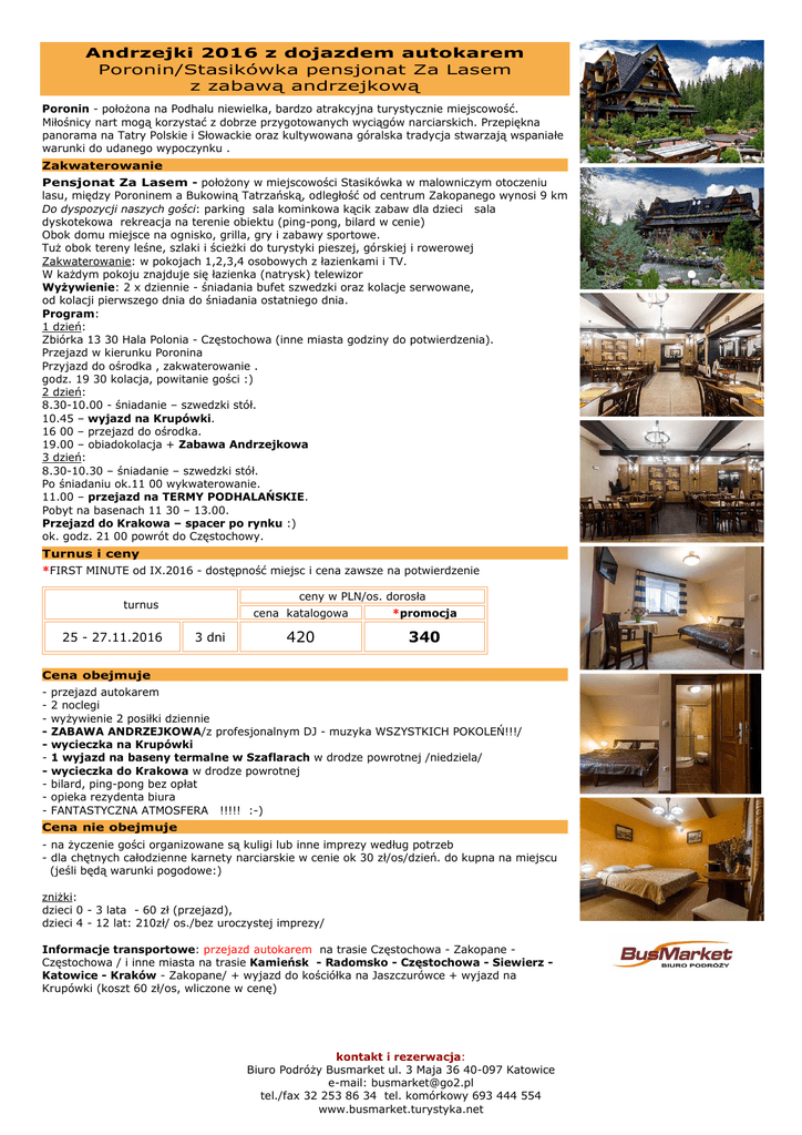 Andrzejki 2016 z dojazdem autokarem Poronin/Stasikówka pensjonat Za Lasem z zabawą andrzejkową Poronin - położona na Podhalu niewielka, bardzo atrakcyjna turystycznie miejscowość. Miłośnicy nart mogą korzystać z dobrze przygotowanych wyciągów narciarskich. Przepiękna panorama na Tatry Polskie i Słowackie oraz kultywowana góralska tradycja stwarzają wspaniałe warunki do udanego wypoczynku . Zakwaterowanie Pensjonat Za Lasem - położony w miejscowości Stasikówka w malowniczym otoczeniu lasu, między Poroninem a Bukowiną Tatrzańską, odległość od centrum Zakopanego wynosi 9 km Do dyspozycji naszych gości: parking sala kominkowa kącik zabaw dla dzieci sala dyskotekowa rekreacja na terenie obiektu (ping-pong, bilard w cenie) Obok domu miejsce na ognisko, grilla, gry i zabawy sportowe. Tuż obok tereny leśne, szlaki i ścieżki do turystyki pieszej, górskiej i rowerowej Zakwaterowanie: w pokojach 1,2,3,4 osobowych z łazienkami i TV. W każdym pokoju znajduje się łazienka (natrysk) telewizor Wyżywienie: 2 x dziennie - śniadania bufet szwedzki oraz kolacje serwowane, od kolacji pierwszego dnia do śniadania ostatniego dnia. Program: 1 dzień: Zbiórka 13 30 Hala Polonia - Częstochowa (inne miasta godziny do potwierdzenia). Przejazd w kierunku Poronina Przyjazd do ośrodka , zakwaterowanie . godz. 19 30 kolacja, powitanie gości :) 2 dzień: 8.30-10.00 - śniadanie – szwedzki stół. 10.45 – wyjazd na Krupówki. 16 00 – przejazd do ośrodka. 19.00 – obiadokolacja + Zabawa Andrzejkowa 3 dzień: 8.30-10.30 – śniadanie – szwedzki stół. Po śniadaniu ok.11 00 wykwaterowanie. 11.00 – przejazd na TERMY PODHALAŃSKIE. Pobyt na basenach 11 30 – 13.00. Przejazd do Krakowa – spacer po rynku :) ok. godz. 21 00 powrót do Częstochowy. Turnus i ceny *FIRST MINUTE od IX.2016 - dostępność miejsc i cena zawsze na potwierdzenie ceny w PLN/os. dorosła turnus 25 - 27.11.2016 3 dni cena katalogowa *promocja 420 340 a Cena obejmuje - przejazd autokarem 2 noclegi wyżywienie 2 posiłki dziennie ZABAWA ANDRZEJKOWA/z profesjonalnym DJ - muzyka WSZYSTKICH POKOLEŃ!!!/ wycieczka na Krupówki 1 wyjazd na baseny termalne w Szaflarach w drodze powrotnej /niedziela/ wycieczka do Krakowa w drodze powrotnej bilard, ping-pong bez opłat opieka rezydenta biura FANTASTYCZNA ATMOSFERA !!!!! :-) Cena nie obejmuje - na życzenie gości organizowane są kuligi lub inne imprezy według potrzeb - dla chętnych całodzienne karnety narciarskie w cenie ok 30 zł/os/dzień. do kupna na miejscu (jeśli będą warunki pogodowe:) zniżki: dzieci 0 - 3 lata - 60 zł (przejazd), dzieci 4 - 12 lat: 210zł/ os./bez uroczystej imprezy/ Informacje transportowe: przejazd autokarem na trasie Częstochowa - Zakopane Częstochowa / i inne miasta na trasie Kamieńsk - Radomsko - Częstochowa - Siewierz Katowice - Kraków - Zakopane/ + wyjazd do kościółka na Jaszczurówce + wyjazd na Krupówki (koszt 60 zł/os, wliczone w cenę) kontakt i rezerwacja: Biuro Podróży Busmarket ul. 3 Maja 36 40-097 Katowice e-mail: [email protected] tel./fax 32 253 86 34 tel. komórkowy 693 444 554 www.busmarket.turystyka.net