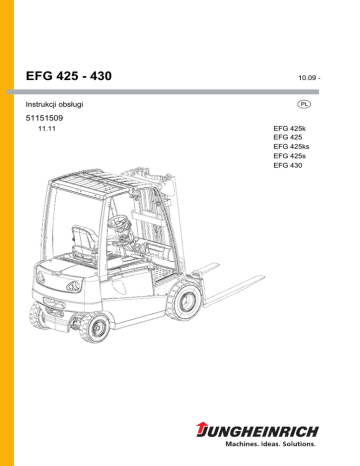 EFG 425 - 430 10.09 - Instrukcji obsáugi p 51151509 11.11 EFG 425k EFG 425 EFG 425ks EFG 425s EFG 430 Deklaracja zgodnoĞci Jungheinrich AG, Am Stadtrand 35, D-22047 Hamburg Producent albo jego przedstawiciel na terenie Wspólnoty Typ EFG 425k EFG 425 EFG 425ks EFG 425s EFG 430 Opcja Nr seryjny Rok produkcji Informacje dodatkowe Z upowaĪnienia Data p Deklaracja zgodnoĞci WE 11.11 PL NiĪej podpisani potwierdzają niniejszym, Īe opisany tutaj napĊdzany wózek jezdniowy speánia wymagania okreĞlone w dyrektywach Europejskich 2006/42/WE (Maszyny) i 2004/108/EWG (KompatybilnoĞü elektromagnetyczna - EMC) wraz z ich póĨniejszymi zmianami oraz odpowiednimi rozporządzeniami mającymi na celu przeksztaácenie tych dyrektyw w prawo krajów czáonkowskich. KaĪdy z sygnatariuszy jest upowaĪniony do samodzielnego zestawienia dokumentacji technicznej. 3 4 11.11 PL WstĊp Wskazówki dotyczące instrukcji eksploatacji Bezpieczna eksploatacja pojazdu wymaga dokáadnego zapoznania siĊ z informacjami podanymi w niniejszej ORYGINALNEJ INSTRUKCJI EKSPLOATACJI. Informacje te przedstawiono w zwiĊzáej i przejrzystej formie. Poszczególne rozdziaáy są oznaczone literami, a strony są ponumerowane. W instrukcji obsáugi są opisane róĪne wersje wózków. Przy wykonywaniu prac konserwacyjnych oraz w trakcie eksploatacji naleĪy stosowaü siĊ do instrukcji odnoszących siĊ do odpowiedniego typu wózka. Nasze urządzenia podlegają ciągáemu rozwojowi. Dlatego zastrzegamy sobie prawo do zmian ksztaátu, wyposaĪenia i techniki. Dlatego teĪ treĞü niniejszej instrukcji obsáugi nie moĪe stanowiü podstawy do roszczeĔ w stosunku do okreĞlonych wáaĞciwoĞci urządzenia. Wskazówki bezpieczeĔstwa i oznaczenia Wskazówki odnoszące siĊ do bezpieczeĔstwa pracy i waĪniejsze objaĞnienia oznaczono poniĪszymi symbolami: NIEBEZPIECZEēSTWO! Oznacza szczególnie powaĪne zagroĪenie. Nieprzestrzeganie tej wskazówki skutkuje powaĪnymi i nieodwracalnymi obraĪeniami lub Ğmiercią. OSTRZEĩENIE! Oznacza szczególnie powaĪne zagroĪenie. Nieprzestrzeganie tej wskazówki moĪe skutkowaü powaĪnymi i nieodwracalnymi lub Ğmiertelnymi obraĪeniami. OSTROĩNIE! Oznacza zagroĪenie. Nieprzestrzeganie tej wskazówki moĪe skutkowaü lekkimi lub Ğrednio ciĊĪkimi obraĪeniami. WSKAZÓWKA Oznacza zagroĪenie dla Ğrodków trwaáych. Nieprzestrzeganie tej wskazówki moĪe skutkowaü szkodami rzeczowymi. Z WystĊpuje przed zaleceniami i objaĞnieniami. t o Oznacza wyposaĪenie standardowe Oznacza wyposaĪenie dodatkowe 11.11 PL Prawa autorskie Prawa autorskie do niniejszej instrukcji eksploatacji naleĪą do firmy JUNGHEINRICH AG. 5 Jungheinrich Aktiengesellschaft Am Stadtrand 35 22047 Hamburg - Niemcy Telefon: +49 (0) 40/6948-0 11.11 PL www.jungheinrich.com 6 Spis treĞci Eksploatacja zgodna z przeznaczeniem ................................. 11 1 2 3 4 5 Informacje ogólne .................................................................................... Eksploatacja zgodna z przeznaczeniem ................................................. Dopuszczalne warunki eksploatacji ......................................................... Obowiązki uĪytkownika ........................................................................... MontaĪ urządzeĔ doczepianych i/lub wyposaĪenia dodatkowego .......... 11 11 12 13 13 B Opis pojazdu ........................................................................... 15 1 1.1 2 2.1 2.2 3 3.1 3.2 3.3 3.4 3.5 3.6 3.7 3.8 3.9 4 4.1 4.2 4.3 4.4 5 Opis zastosowania .................................................................................. Typy pojazdów i udĨwig znamionowy...................................................... Opis podzespoáów i funkcji ...................................................................... Przegląd podzespoáów ............................................................................ Opis dziaáania .......................................................................................... Dane techniczne...................................................................................... Parametry ................................................................................................ Wymiary................................................................................................... Masy ........................................................................................................ Rodzaje masztów .................................................................................... Ogumienie ............................................................................................... Dane silnika ............................................................................................. Normy EN ................................................................................................ Warunki eksploatacji................................................................................ Wymagania elektryczne .......................................................................... Miejsca oznakowania i tabliczki znamionowe.......................................... Miejsca oznakowania .............................................................................. Tabliczka znamionowa ............................................................................ Wykres obciąĪeĔ wózka jezdniowego ..................................................... Tabliczka udĨwigu oprzyrządowania doczepianego................................ StatecznoĞü ............................................................................................. 15 15 16 16 17 19 19 21 23 25 26 26 27 28 28 29 29 31 32 33 33 C Transport i pierwsze uruchomienie ......................................... 35 1 2 2.1 2.2 2.3 3 4 Transport ................................................................................................. Zaáadunek wózka....................................................................