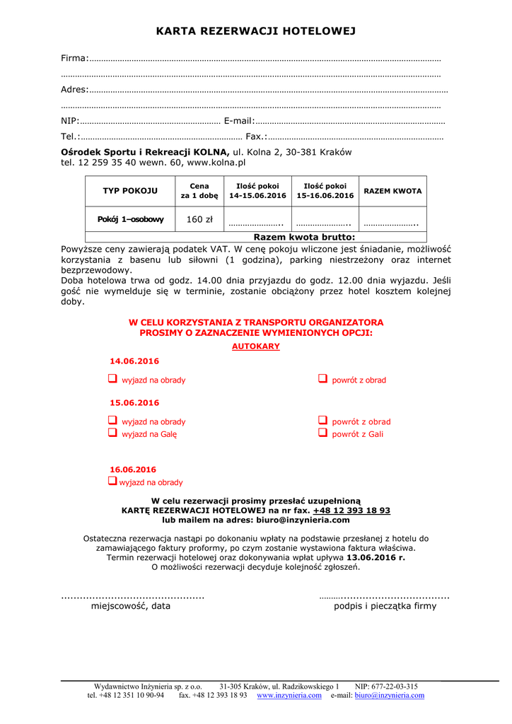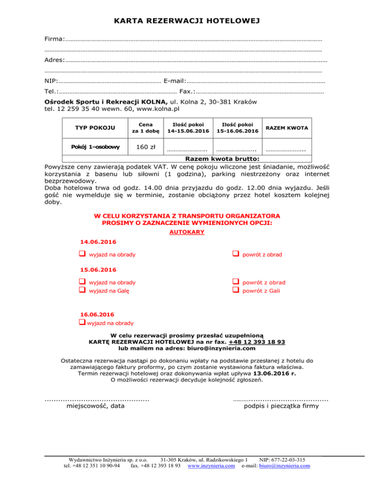 KARTA REZERWACJI HOTELOWEJ Firma:…………………………………………………………………………………………………………………………………… ……………………………………………………………………………………………………………………………………………… Adres:……………………………………………………………………………………………………………………………………… ……………………………………………………………………………………………………………………………………………… NIP:…………………………………………………… E-mail:……………………………………………………………………… Tel.:…………………………………………………………… Fax.:………………………………………………………………… Ośrodek Sportu i Rekreacji KOLNA, ul. Kolna 2, 30-381 Kraków tel. 12 259 35 40 wewn. 60, www.kolna.pl TYP POKOJU Cena za 1 dobę Pokój 1–osobowy 160 zł Ilość pokoi 14-15.06.2016 Ilość pokoi 15-16.06.2016 RAZEM KWOTA ………………….. ………………….. ………………….. Razem kwota brutto: Powyższe ceny zawierają podatek VAT. W cenę pokoju wliczone jest śniadanie, możliwość korzystania z basenu lub siłowni (1 godzina), parking niestrzeżony oraz internet bezprzewodowy. Doba hotelowa trwa od godz. 14.00 dnia przyjazdu do godz. 12.00 dnia wyjazdu. Jeśli gość nie wymelduje się w terminie, zostanie obciążony przez hotel kosztem kolejnej doby. W CELU KORZYSTANIA Z TRANSPORTU ORGANIZATORA PROSIMY O ZAZNACZENIE WYMIENIONYCH OPCJI: AUTOKARY 14.06.2016 wyjazd na obrady powrót z obrad 15.06.2016 wyjazd na obrady powrót z obrad wyjazd na Galę powrót z Gali 16.06.2016 wyjazd na obrady W celu rezerwacji prosimy przesłać uzupełnioną KARTĘ REZERWACJI HOTELOWEJ na nr fax. +48 12 393 18 93 lub mailem na adres: [email protected] Ostateczna rezerwacja nastąpi po dokonaniu wpłaty na podstawie przesłanej z hotelu do zamawiającego faktury proformy, po czym zostanie wystawiona faktura właściwa. Termin rezerwacji hotelowej oraz dokonywania wpłat upływa 13.06.2016 r. O możliwości rezerwacji decyduje kolejność zgłoszeń. .............................................. miejscowość, data ………................................... podpis i pieczątka firmy Wydawnictwo Inżynieria sp. z o.o. 31-305 Kraków, ul. Radzikowskiego 1 NIP: 677-22-03-315 tel. +48 12 351 10 90-94 fax. +48 12 393 18 93 www.inzynieria.com e-mail: [email protected]