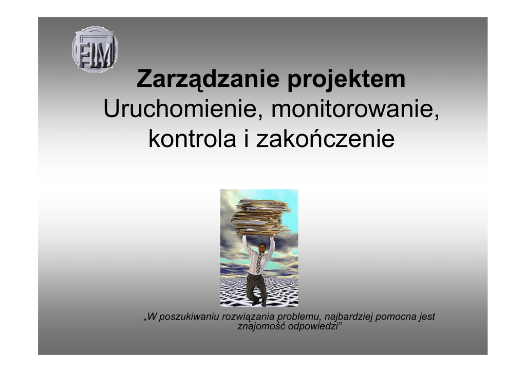 Zarządzanie projektem Uruchomienie, monitorowanie, kontrola i zakończenie „W poszukiwaniu rozwiązania problemu, najbardziej pomocna jest znajomość odpowiedzi” FAZA III URUCHOMIENIE PROJEKTU I MONITOROWANIE URUCHOMIENIE PROJEKTU • przewidywanie zagrożeń w projekcie - analiza SWOT (Strength, Weakness, Opportunity, Threats) • elastyczność projektu i możliwości adaptacji • gwarancje realizacji poszczególnych zadań (umowy, kontrakty zobowiązania…) • gwarancja dotrzymania budżetu – brak jego redukcji • zabezpieczenie przed nieobecnościami FAZA III URUCHOMIENIE PROJEKTU I MONITOROWANIE MONITOROWANIE I KONTROLA PROJEKTU • badanie i weryfikacja zestawu celów przez cały czas trwania projektu • zgodność prowadzonych prac z planem • budowanie przeświadczenia iż to co jest realizowane jest potrzebne • weryfikacja zgodności projektu z oczekiwaniami • kontrola zasobów i ograniczeń • ciągła weryfikacja planu na podstawie raportów z prac • gwarantowanie komfortu pracy zespołowi projektowemu. ELEMENTY MONITOROWANE • koszty w odniesieniu do budżetu i przepływu kosztów • zmiany w konspekcie projektu i ich wpływ na projekt i organizację • jakość pracy, postęp prac • możliwość dotrzymania terminów • dostępność zasobów FAZA III MONITOROWANIE Kontrola kosztów • oszacowanie kosztów na początku projektu, uściślenie kosztorysu w fazie planowania szczegółowego • szacunek przerasta możliwości – konieczność przeglądu opcji koszt-efektywność (inżynieria wartości decyzje: jakość-koszt) • rezerwa finansowa 5-10% - nieprzewidziane wpadki • rozbicie kosztów na główne zadania – prognoza przepływu środków • identyfikacja ewentualnych oszczędności Koszt Przewidywane koszty Fazy projektu Plan Rozwój Wykres kontroli kosztów Implementacja FAZA III MONITOROWANIE Kontrola projektu • PROCEDURA NADAWANIA SPRAWOM WŁAŚCIWEGO BIEGU • opracuj plan i harmonogram prac • organizuj spotkania • zbieraj i twórz raporty o postępie prac • dbaj o przepływ informacji • regularnie aktualizuj plan •SPOTKANIA - CEL • monitorowanie postępów prac w zestawieniu z konspektem i raportami • analiza podejścia do kolejnych etapów prac • aprobata i zatwierdzenie ewentualnych zmian ze strony zwierzchników proj. • informacja zespołu i wysłuchiwanie rad • koordynowanie wymagań z innymi obszarami pracy FAZA III MONITOROWANIE Kontrola projektu •SPOTKANIA - ORGANIZACJA • przygotowanie i rozesłanie porządku spotkani – uzupełnienie przez zespół • niezbędne dokumenty na spotkanie rozesłane wcześniej • ustalony czas rozpoczęcia i zakończenia spotkania • ustalenie przewodniczącego i protokolanta • SPRAWOZDANIA – MATERIAŁY GENEROWANE W PROCESIE MONITORINGU I KONTROLI WYBÓR STRATEGII KOMUNIKOWANIA (wg strategii pięciu C: clear, concise, complete, correct, courteous) • sposoby komunikacji: raporty, listy, notatki, biuletyny, kwestionariusze, prezentacje video, spotkania, prezentacja overhead, skrzynka kontaktowa. • osoba odpowiedzialna za rozprzestrzenianie się informacji w poszczególnych obszarach • procedura potwierdzeń odbioru informacji • ustalenie zasad dostępu do informacji • „gorąca linia” „czerwony alarm” FAZA IV ZAKOŃCZENIE PROJEKTU Raport końcowy • RAPORT KOŃCOWY – konieczne stwierdzenia: • projekt został ukończony – zrealizowano zadania przewidziane w planie • zakończono realizację budżetu projektu • pozostałe wydatki będą pokrywane z wyodrębnionego funduszu • zakończono rozliczenia z działem finansowym • wszyscy zainteresowani znają datę zakończenia projektu FAZA IV ZAKOŃCZENIE PROJEKTU Przegląd powykonawczy – obejmuje cały zakres przedsięwzięci NIE Porównaj udokumentowane informacje po zakończeniu projektu z planem początkowym. Rozważ: • zakres projektu • terminy • zasoby • wzajemne oddziaływanie wewnątrz organizacji i na zewnątrz Czy uzyskane wyniki odpowiadają oczekiwaniom? TAK Procedura przeglądu powykonawczego Określ gdzie są różnice i dlaczego. Dokonaj podsumowania przyczyn: • rezultaty projektu są porównywalne z planowanymi • różnice w terminach • różnice w zasobach • inne istotne czynniki Dokonaj posumowania wyników projektu, zasobów i terminowości NEGOCJACJE; KONSULTANCI • Podstawowy środek uzyskania od innych tego, czego od nich potrzebujesz. Komunikacja dwustronna, tak zorganizowana, aby doprowadzić do uzgodnień w sytuacji, gdy obie strony mają pewne interesy wspólne, a inne rozbieżne • • • • Negocjowanie budżetu i harmonogramu Negocjowanie personelu Negocjowanie i kontraktowanie usług Negocjowanie a planowanie i świadomość celu (wyżej mierząc wyżej spadniesz) personel zatrudniany dorywczo personel kontraktowy stały personel Nadzór nad praca konsultantów – stały pracownik Korzystanie z doświadczeń innych – zakup ekspertyz Ustalenie zakresu pracy konsultanta (To jest tekst, proszę go umieścić na podstawie ornamentu ?? niby wszystko jasne?? Rola konsultanta w podejmowaniu decyzji i identyfikacji zagrożeń (unikaj konsultantów którzy we wszystkim widzą skomplikowane zadanie i pole dla swojego popisu) Angaż konsultanta – ze słyszenia? konsultant jest na tyle dobry na ile jest wartościowe jego ostatnie miejsce pracy CAPM – Komputerowo wspomagane zarządzanie projektem • Elementy konieczne do uwzględnienia przy wyborze odpowiednich narzędzi informatycznych: • łatwe wprowadzanie danych •akceptowalny interfejs graficzny •szeroki wybór wykresów i formatów raportów •łatwość nauczenia się obsługi i użytkowania •możliwość szkolenia •harmonogramowanie zadań; kalendarze •obsługa połączeń z podprojektami •monitorowanie budżetu/ przepływu funduszy •manipulowanie zasobami, liczenie kosztów •eksport danych do innych aplikacji wspierających •ścieżki krytyczne i straty czasu •o