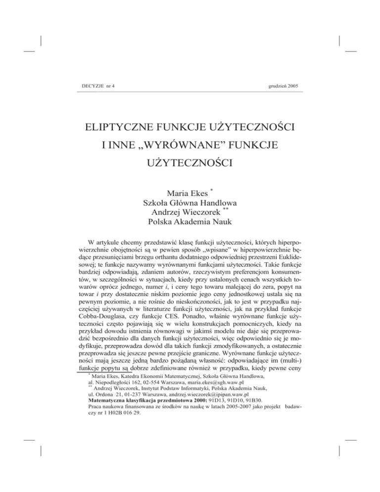 DECYZJE nr 4 grudzień 2005 ELIPTYCZNE FUNKCJE UŻYTECZNOŚCI I INNE „WYRÓWNANE” FUNKCJE UŻYTECZNOŚCI Maria Ekes * Szkoła Główna Handlowa Andrzej Wieczorek ** Polska Akademia Nauk W artykule chcemy przedstawić klasę funkcji użyteczności, których hiperpowierzchnie obojętności są w pewien sposób „wpisane” w hiperpowierzchnie będące przesunięciami brzegu orthantu dodatniego odpowiedniej przestrzeni Euklidesowej; te funkcje nazywamy wyrównanymi funkcjami użyteczności. Takie funkcje bardziej odpowiadają, zdaniem autorów, rzeczywistym preferencjom konsumentów, w szczególności w sytuacjach, kiedy przy ustalonych cenach wszystkich towarów oprócz jednego, numer i, i ceny tego towaru malejącej do zera, popyt na towar i przy dostatecznie niskim poziomie jego ceny jednostkowej ustala się na pewnym poziomie, a nie rośnie do nieskończoności, jak to jest w przypadku najczęściej używanych w literaturze funkcji użyteczności, jak na przykład funkcje Cobba-Douglasa, czy funkcje CES. Ponadto, właśnie wyrównane funkcje użyteczności często pojawiają się w wielu konstrukcjach pomocniczych, kiedy na przykład dowodu istnienia równowagi w jakimś modelu nie daje się przeprowadzić bezpośrednio dla danych funkcji użyteczności, więc odpowiednio się je modyfikuje, przeprowadza dowód dla takich funkcji zmodyfikowanych, a ostatecznie przeprowadza się jeszcze pewne przejście graniczne. Wyrównane funkcje użyteczności mają jeszcze jedną bardzo pożądaną własność: odpowiadające im (multi-) funkcje popytu są dobrze zdefiniowane również w przypadku, kiedy pewne ceny * Maria Ekes, Katedra Ekonomii Matematycznej, Szkoła Główna Handlowa, al. Niepodległości 162, 02-554 Warszawa, [email protected] ** Andrzej Wieczorek, Instytut Podstaw Informatyki, Polska Akademia Nauk, ul. Ordona 21, 01-237 Warszawa, [email protected] Matematyczna klasyfikacja przedmiotowa 2000: 91D13, 91D10, 91B30. Praca naukowa finansowana ze środków na naukę w latach 2005-2007 jako projekt badawczy nr 1 H02B 016 29. 52 ELIPTYCZNE FUNKCJE UŻYTECZNOŚCI (jednak nie wszystkie) są równe 0, co jest bardzo ważne przy wykonywaniu obliczeń numerycznych. Przy dodatkowych założeniach, dotyczących wypukłości funkcji użyteczności, każdy zbiór popytowy zawiera element minimalny ze względu na częściowy porządek w Rn. Uzasadnieniem potrzeby zdefiniowania funkcji wyrównanych może być następujący cytat z klasycznej monografii Scarfa i Hansena [3], str. 20: It is difficult to imagine that this technical problem has much economic content: consumers would not be expected to demand arbitrarily large quantities of any particular commodity even if its price were quite small. In the study of the existence of equilibrium prices this difficulty has been successfully overcome, but at the cost of somewhat more elaborate analysis than I would care to present here. Given our primary concern with computational techniques, we shall find it convenient to require that the demand functions be continuous on the entire unit simplex and not only in the interior. We shall make this assumption in our discussion of computational procedures even though many of our numerical examples will employ utility functions − such as the Cobb-Douglas function ... − for which the assumption is not valid. The reader should have no difficulty in adjusting to this slight ambiguity. W artykule opisujemy, w jaki sposób zwykle stosowane funkcje użyteczności można, przez operację „obcięcia”, doprowadzić do funkcji wyrównanej. Konkretny przykład dotyczy funkcji Cobba-Douglasa. Wprowadzamy też, jak się wydaje, nową klasę funkcji, nazwanych przez nas funkcjami eliptycznymi, które z definicji są funkcjami wyrównanymi. Intuicji co do natury tych funkcji dostarcza kształt odpowiadających im krzywych i powierzchni obojętności przedstawionych na rysunkach 2 i 3. Wprowadzenie do tematyki poruszanej w tej pracy mogą stanowić pozycje bibliografii [1-7]. Słowa kluczowe: funkcja (multifunkcja) popytu, funkcja użyteczności, funkcje Cobba-Douglasa, eliptyczne funkcje użyteczności, krzywe (powierzchnie) obojętności. Definicje Jeżeli x,y∈R n , to piszemy x ≤ y gdy x i ≤ y i dla i = 1, 2,...,n; piszemy x < y gdy x i < y i dla i = 1, 2,..., n. Przez funkcję użyteczności rozumiemy funkcję u: Rn+ → R, ograniczymy się przy tym do funkcji ciągłych i monotonicznych w tym sensie, że spełniają warunki: 53 Maria Ekes, Andrzej Wieczorek n a. jeżeli dla wektorów x,y∈R+ zachodzi x < y, to u(x) < u(y); oraz n b. jeżeli dla wektorów x,y∈R+ zachodzi x ≤ y, to u(x) ≤ u(y). Dla funkcji użyteczności u i nieujemnej liczby a, hiperpowierzchnia obojętności odpowiadająca poziomowi a jest zdefiniowana jako zbiór n Ind(u, a) = {x ∈ R+ | u(x)=a}. Powiemy, że monotoniczna (spełniająca warunki (a) i (b)) funkcja użyteczności u jest wyrównana, gdy ma następującą własność: dla dowolnej nieujemnej liczby a istnieje zbiór domknięty i ograniczony Ca ⊂ R n+ taki, że Ind (u, a) jest brzegiem (topologicznym) zbioru + C a = {x ∈ R n+ | istnieje y ∈ C a takie, że y ≤ x }. + Zauważmy, że również Ca = {x ∈ R n+ | u(x) ≥ a }, a więc + + Ind(u, a) = Ca \ U b > a C b . Dla funkcji użyteczności u określamy, jak zwykle, odpowiadającą n jej multifunkcję popytu D : R+ × (Rn+ \ {0}) R+ wzorem (przez multifunkcję rozumiemy tu funkcję, która każdej wielkości argumentu przyporządkowuje nie pojedynczą wartość, ale zbiór możliwych wartości): D (I , π ) := {x ∈ R+n π , x ≤ I oraz jeśli dla innego z∈R+ jest π , z ≤ I , to u(z) ≤ u(x )} n (przy dochodzie I i układzie cen π , D ( I , π ) jest to zbiór finansowo dostępnych i najbardziej pożądanych wiązek towarowych, we wzorze pojawia się iloczyn skalarny π , x = π 1 x1 + ... + π n x n ). Uwaga. Jeżeli funkcja użyteczności u jest wyrównana to wszystkie wartości odpowiadającej j