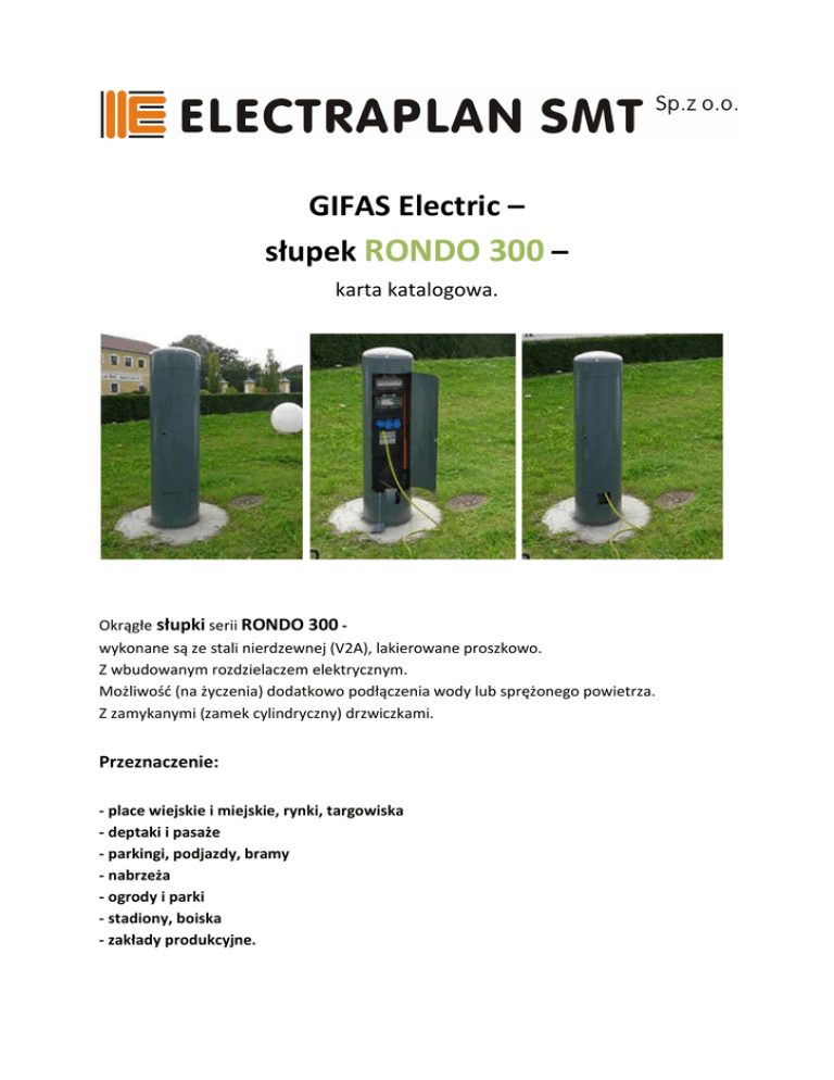 GIFAS Electric – słupek RONDO 300 – karta katalogowa. Okrągłe słupki serii RONDO 300 wykonane są ze stali nierdzewnej (V2A), lakierowane proszkowo. Z wbudowanym rozdzielaczem elektrycznym. Możliwość (na życzenia) dodatkowo podłączenia wody lub sprężonego powietrza. Z zamykanymi (zamek cylindryczny) drzwiczkami. Przeznaczenie: - place wiejskie i miejskie, rynki, targowiska - deptaki i pasaże - parkingi, podjazdy, bramy - nabrzeża - ogrody i parki - stadiony, boiska - zakłady produkcyjne. Podstawowe dane techniczne. - wymiary zewn.: średnica Ø304 mm, wysokość: H= 1200 mm waga: ok. 45 kg materiał: stal nierdzewna V2A wykonanie słupka: lakier proszkowy (struktura) w 3 podstawowych kolorach: aluminium jasne, zieleń sosnowa, mat jedwabisty inne kolory (RAL) – na zamówienie słupki zamykane (zamek półcylinder + 2 kluczyki). Wymiarowanie słupka RONDO 300. Przyłącze wody. Jako opcja – możliwość na budowie podłączenia od dołu słupka wody (zawór czerpalny kulowy oraz końcówka do podłączenia węża oraz końcówka do odprowadzenia wody brudnej). Możliwość instalacji wodnej w wersji odpornej na zamarzanie (taśma izolacyjna). Rozdzielacz elektryczny. - obudowa rozdzielacza z kauczuku butylowego (prod. GIFAS) wysokie właściwości izolacyjne (przeciw kondensacji wody) dobre parametry mechaniczne wysoka odporność na warunki klimatyczne wszystkie aparaty w wyk. bryzgoszczelnym. Przykładowa konfiguracja słupka RONDO 300. - rozdzielacz prod. GIFAS serii 3020 (wymiary: 600 x 200 x 110 mm) - zasilanie słupka: 2 x dławik M40 (pod kable EYYJ 5 x 25 mm², podłączane na budowie) gniazda: - 6 gniazd 16A/230V - 1 x przedłużacz z gniazdem 32A/400V - 1 x przedłużacz z gniazdem 16A/400V - zabezpieczenia: 1 x Fi, 1 x Fi, 3 x LS, 1 x LS, 1 x LS, 4 – pol. 40/0,03A, G 4 – pol. 63/0,03A, G 1 – pol. 16A, C 3 – pol. 32A, C 3 – pol. 16A, C.