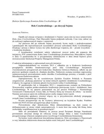 Paweł Tomaszewski INTiBS PAN Wrocław, 15 grudnia 2012 r. Biuletyn Społecznego Komitetu Roku Czochralskiego - H Rok Czochralskiego – po decyzji Sejmu Szanowni Państwo, Opadły już emocje związane z działaniami w Sejmie i poza nim na rzecz ustanowienia Roku Jana Czochralskiego. Pani Marszałek Sejmu podpisała uchwałę. Czas więc zabrać się do realizacji zaplanowanych imprez i zamierzeń. Już pierwsze dni po uchwale Sejmu przyniosły liczne mejle z podziękowaniami i gratulacjami dla najważniejszych uczestników procesu uchwalania Roku Czochralskiego. Dziękuję i proszę o dalsze wyrazy nie tylko duchowego wsparcia, ale – przede wszystkim – o konkretne działania. Z kronikarskiej rzetelności należy odnotować jeszcze jeden akt poparcia dla inicjatywy PTF ustanowienia Roku Jana Czochralskiego przedstawiony Marszałkowi Sejmu w dniu 12 października br. (i przypomniany elektronicznie w dniu obrad Sejmu!) przez stowarzyszenie Intelectual Property Management Polska. Z radością informujemy o zgłoszeniach nowych inicjatyw. Najprawdopodobniej we wrześniu 2013 r. odbędzie się w Krakowie konferencja przeglądowa dorobku metaloznawczego prof. Jana Czochralskiego. Inicjatorem i koordynatorem przygotowań jest krakowska Akademia Górniczo-Hutnicza; odbyło się już pierwsze spotkanie zespołu ds. zbadania dorobku. Niebawem zostaną rozesłane zaproszenia; zainteresowanych prowadzeniem analiz dorobku Czochralskiego prosimy o kontakt z prof. Mirosławem Karbowniczakiem. Zaproponowano, by na wrześniowym Zjeździe Fizyków Polskich w Poznaniu zorganizować „dyskusję panelową” na temat różnych aspektów działalności Czochralskiego. Ciekawe, bo sugeruje to istnienie głosów krytycznych wobec Czochralskiego. W październiku lub w listopadzie 2013 r. zorganizowana zostanie na Politechnice Warszawskiej wspólna polsko-niemiecka konferencja poświęcona życiu i działalności Jana Czochralskiego. W tej sprawie porozumieli się już prezesi Polskiego i Niemieckiego Towarzystw Chemicznych. Cieszy fakt, że Niemcy biorą się wreszcie do roboty – na terenie Niemiec jest jeszcze sporo do zrobienia przez osoby znające teren i język. Środowisko aptekarzy również włączy się w przyszłoroczne obchody propagując związki Jana Czochralskiego z farmacją. Kcynia przygotowuje się do wystawy plenerowej na kcyńskim Rynku. Podobno Archiwum PAN również przygotowuje jakąś wystawę. Potwierdzono chęć dokończenia filmu dokumentalnego; są duże szanse na dofinansowanie ze strony władz samorządowych. A może ktoś zna osobę lub firmę, która zechciałaby współfinansować to przedsięwzięcie? Miło mi powiadomić Państwa, że jeszcze przed Świętami Bożego Narodzenia powinienem otrzymać dostęp do roboczej wersji innego filmu o Janie Czochralskim przygotowanego własnym sumptem przez życzliwego Czochralskiemu biznesmena. Na koniec warto odnotować niecodzienną inicjatywę. Otóż, powstająca w Panowicach w woj. lubuskim elektrownia słoneczna będzie nosić imię prof. Jana Czochralskiego! 1 Zrządzeniem losu zwycięzcą konkursu na tzw. witacze w Kcyni został prawnuk Profesora, pan Adam Zieliński, znany wielu osobom z panoramy Kcyni opublikowanej na okładce książki „Jan Czochralski i jego metoda” wydanej w 2003 r. Gratulujemy! Konkurs ogłosiły władze Kcyni. Warto wspomnieć, że ustanowienie Roku daje dostęp do określonych funduszy rządowych. Niestety, nie wiem jak ta sprawa wygląda od strony formalnej. Być może tylko łatwiej je uzyskać z innych źródeł powołując się na dany Rok. Powtórzę mój apel z poprzedniego numeru Biuletynu: Będę wdzięczny Państwu za rejestrowanie wszelkich materiałów prasowych i internetowych dotyczących Roku Jana Czochralskiego – to będzie ważna dokumentacja naszych działań, zainteresowania sprawą Czochralskiego w Polsce oraz cennym uzupełnieniem wrocławskiego archiwum „czochralskianów”. Niestety, pierwsze informacje prasowe o decyzji Sejmu bazowały na uzasadnieniu uchwały i komunikacie Polskiej Agencji Prasowej. Zawierały porażającą ilość błędów. Weźmy komunikat PAP zatytułowany „Jan Czochralski jednym z patronów roku 2013” i opublikowany w serwisie PAP ”Nauka w Polsce” w dniu 10 grudnia 2012 r. Zgodnie z zamieszczoną w tekście relacją z obrad Sejmu posłanka-sprawozdawca prezentując zgłoszoną przez Komisję Kultury i Środków Przekazu uchwałę mówi o Czochralskim: "na apel prezydenta Ignacego Mościckiego porzucił..." co nie jest to prawdą, bo żadnego apelu nie było. Dalej czytamy: "sąd oczyścił Czochralskiego z zarzutów…” co też nie jest prawdą, bo nie było rozprawy sądowej ani wyroku, a tylko prokurator umorzył prowadzone śledztwo. W swojej książce „Powrót. Rzecz o Janie Czochralskim” wyjaśniam też, że nie zmarł "po rewizji UB w jego willi". Bzdurą jest również stwierdzenie, że "Senat Politechniki przywrócił mu tytuły profesorskie". Jakie tytuły w liczbie mnogiej? Nic nie przywracano poza czcią. I jeszcze jeden błąd: w notatce napisano: "jego opracowania technologiczne krzemowych układów scalonych". To science fiction! Czochralski nie pracował z krzemem, a tym bardziej nie opracował układów scalonych wymyślonych wiele lat po jego śmierci. I jeszcze jedna nieścisłość: „Czochralski jest trzecim polskim naukowcem naprawdę rozpoznawalnym na świecie". Toż to totalna bzdura! Owszem, nazwisko jest znane, ale osoba nie! I właśnie zależy nam na tym, by zagranica wiedziała kto "kryje się" pod tym nazwiskiem znanym z nazwy metody otrzymywania monokryształów. Wszystko to zmieszczono w notatce PAP o długości zaledwie 19 linijek tekstu. Przypomnę, że do zadań Polskiej Agencji Prasowej SA, zgodnie z jej statutem, należy uzyskiwanie i przekazywanie odbiorcom rzetelnych, obiektywnych i wszechstronnych informacji z kraju i z zagranicy. Agencja jest także zobowiązana do upowszechniania stanowiska S