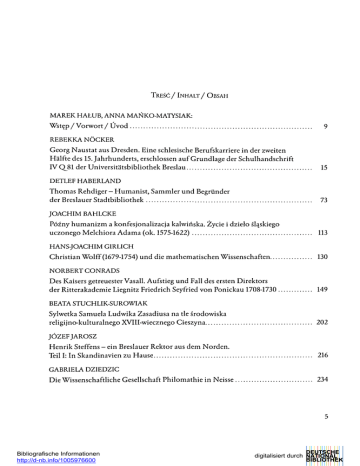 TRESC/ INHALT/ OBSAH MAREK HALUB, ANNA MAÑKO-MATYSIAK: Wstçp/ Vorwort/ Úvod 9 REBEKKA NÖCKER Georg Naustat aus Dresden. Eine schlesische Berufskarriere in der zweiten Hälfte des 15. Jahrhunderts, erschlossen auf Grundlage der Schulhandschrift IV Q81 der Universitätsbibliothek Breslau 15 DETLEF HABERLAND Thomas Rehdiger - Humanist, Sammler und Begründer der Breslauer Stadtbibliothek 73 JOACHIM BAHLCKE Pózny humanizm a konfesjonalizacja kalwiñska. Zycie i dzielo sl^skiego uczonego Melchiora Adama (ok. 1575-1622) 113 HANS-JOACHIM GIRLICH Christian Wolff (1679-1754) und die mathematischen Wissenschaften 130 NORBERT CONRADS Des Kaisers getreuester Vasall. Aufstieg und Fall des ersten Direktors der Ritterakademie Liegnitz Friedrich Seyfried von Ponickau 1708-1730 149 BEATA STUCHLIK-SUROWIAK Sylwetka Samuela Ludwika Zasadiusa na tie srodowiska religijno-kulturalnego XVIII-wiecznego Cieszyna 202 JÓZEFJAROSZ Henrik Steffens - ein Breslauer Rektor aus dem Norden. Teil I: In Skandinavien zu Hause 216 GABRIELA DZIEDZIC Die Wissenschaftliche Gesellschaft Philomathie in Neisse Bibliografische Informationen http://d-nb.info/1005976600 234 digitalisiert durch HANS SEIDEL Oberkantor Moritz Deutsch in Breslau (1842-1892) 251 LECH KOLAGO Aus der künstlerisch-wissenschaftlichen Tätigkeit Eugen Guras in Breslau 273 JÜRGEN JOACHIMSTHALER Lesen in Oberschlesien. Teil III: Sozial differenzierte Lektürepolitik(en) für unterschiedliche gesellschaftliche Schichten 284 PAWEL BERGMAN Zarys historii antropologii (biologicznej) we Wroclawiu w XIX w. (do koñca I wojny swiatowej) 306 ZOFIA TARAJLO-LIPOWSKA Vratislavská bohemistika - tradice, prítomnost a budoucnost 335 JOZEF KOREDCZUK Uniwersytecki Instytut Medycyny S^dowej i Kryminalistyki we Wroclawiu 346 ILONA GWÓZDZ -SZEWCZENKO Hostinská z povolání - etnografka z poslání. Skica k portrétu hlucínské spisovatelky Ludmily Hoïké 364 ARNO HERZIG Joseph Wittig und die Geschichte des Glatzer Landes 379 TOBIAS WEGER Bolko Freiherr von Richthofen: Frühgeschichtsforscher - völkischer Ideologe -Vertriebenenpolitiker 398 WOLFGANG KREFT Schlesische Städte im Spiegel topographischer Karten. Ein multimediales Atlasprojekt zur Siedlungsentwicklung vom 19. bis zum 21. Jahrhundert 419 ELZBIETA OPILOWSKA Fundacja Krzyzowa dia Porozumienia Europejskiego jako centrum edukacji 435 MIROSLAW MILLER Wroclawski program EIT+, czyli budowa Gospodarki Opartej na Wiedzy we Wrockwiu i na Dolnym Sl^sku 452 ANNA MAÑKO-MATYSIAK, EUGENIUSZ TOMICZEK Vom Spiritus movens der Schlesisdm Gekìjrtenrepitblik. Dokumentation zur Verleihung der Ehrendoktorwürde an Prof. Dr. Norbert Heisig 471 IfADEUSZ BRZEZINSKIj ALEKSANDRA KUBICZ, ZDZISLAW LATAJKA, BOGDAN LAZARKIEWICZ, HELFRIED WALECZEK Waldemar Kozuschek. Niecodzienne losy lekarza - humanisty, chirurga, uczonego 491 MAREKHALUB Die Breslauer Germanistik und KDSTV Winfridia Breslau zu Münster. Zu einem Begegnungsprojekt 514 Adresy autorów/ Anschriften der Autoren / Adresy autorü 531