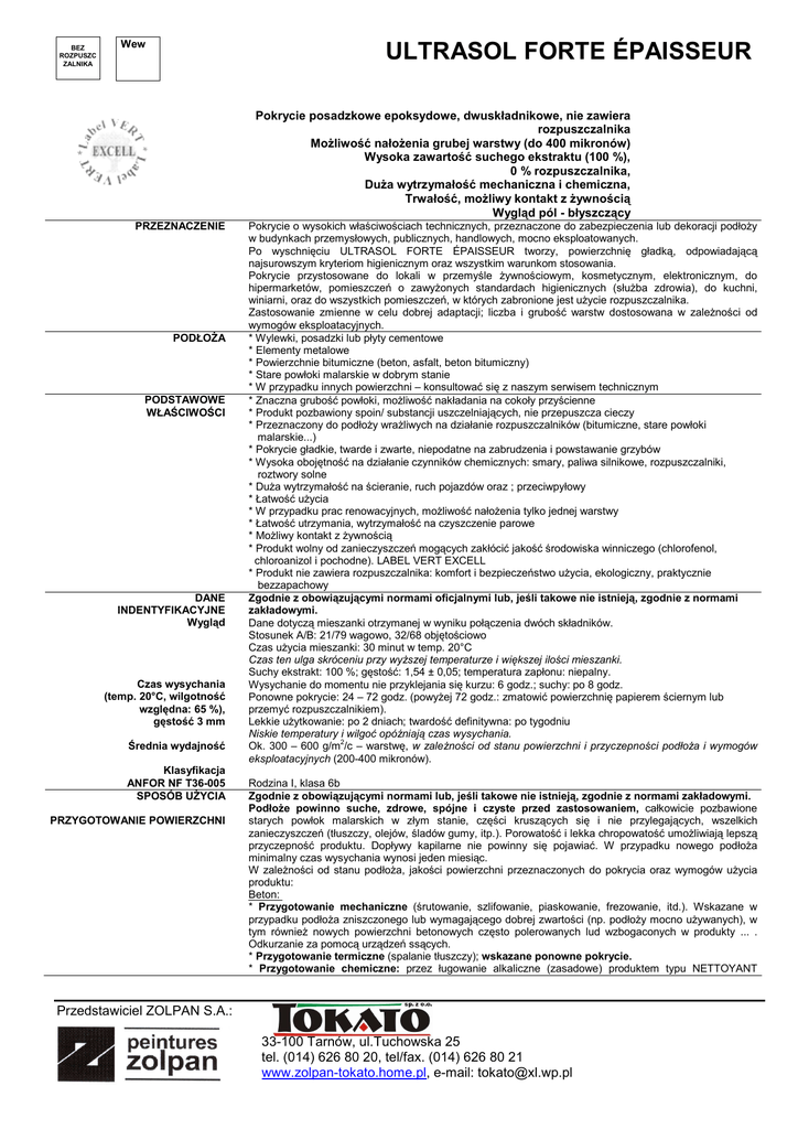 BEZ ROZPUSZC ZALNIKA Wew ULTRASOL FORTE ÉPAISSEUR Pokrycie posadzkowe epoksydowe, dwuskładnikowe, nie zawiera rozpuszczalnika MoŜliwość nałoŜenia grubej warstwy (do 400 mikronów) Wysoka zawartość suchego ekstraktu (100 %), 0 % rozpuszczalnika, DuŜa wytrzymałość mechaniczna i chemiczna, Trwałość, moŜliwy kontakt z Ŝywnością Wygląd pól - błyszczący PRZEZNACZENIE PODŁOśA PODSTAWOWE WŁAŚCIWOŚCI DANE INDENTYFIKACYJNE Wygląd Czas wysychania (temp. 20°C, wilgotność względna: 65 %), gęstość 3 mm Średnia wydajność Klasyfikacja ANFOR NF T36-005 SPOSÓB UśYCIA PRZYGOTOWANIE POWIERZCHNI Pokrycie o wysokich właściwościach technicznych, przeznaczone do zabezpieczenia lub dekoracji podłoŜy w budynkach przemysłowych, publicznych, handlowych, mocno eksploatowanych. Po wyschnięciu ULTRASOL FORTE ÉPAISSEUR tworzy, powierzchnię gładką, odpowiadającą najsurowszym kryteriom higienicznym oraz wszystkim warunkom stosowania. Pokrycie przystosowane do lokali w przemyśle Ŝywnościowym, kosmetycznym, elektronicznym, do hipermarketów, pomieszczeń o zawyŜonych standardach higienicznych (słuŜba zdrowia), do kuchni, winiarni, oraz do wszystkich pomieszczeń, w których zabronione jest uŜycie rozpuszczalnika. Zastosowanie zmienne w celu dobrej adaptacji; liczba i grubość warstw dostosowana w zaleŜności od wymogów eksploatacyjnych. * Wylewki, posadzki lub płyty cementowe * Elementy metalowe * Powierzchnie bitumiczne (beton, asfalt, beton bitumiczny) * Stare powłoki malarskie w dobrym stanie * W przypadku innych powierzchni – konsultować się z naszym serwisem technicznym * Znaczna grubość powłoki, moŜliwość nakładania na cokoły przyścienne * Produkt pozbawiony spoin/ substancji uszczelniających, nie przepuszcza cieczy * Przeznaczony do podłoŜy wraŜliwych na działanie rozpuszczalników (bitumiczne, stare powłoki malarskie...) * Pokrycie gładkie, twarde i zwarte, niepodatne na zabrudzenia i powstawanie grzybów * Wysoka obojętność na działanie czynników chemicznych: smary, paliwa silnikowe, rozpuszczalniki, roztwory solne * DuŜa wytrzymałość na ścieranie, ruch pojazdów oraz ; przeciwpyłowy * Łatwość uŜycia * W przypadku prac renowacyjnych, moŜliwość nałoŜenia tylko jednej warstwy * Łatwość utrzymania, wytrzymałość na czyszczenie parowe * MoŜliwy kontakt z Ŝywnością * Produkt wolny od zanieczyszczeń mogących zakłócić jakość środowiska winniczego (chlorofenol, chloroanizol i pochodne). LABEL VERT EXCELL * Produkt nie zawiera rozpuszczalnika: komfort i bezpieczeństwo uŜycia, ekologiczny, praktycznie bezzapachowy Zgodnie z obowiązującymi normami oficjalnymi lub, jeśli takowe nie istnieją, zgodnie z normami zakładowymi. Dane dotyczą mieszanki otrzymanej w wyniku połączenia dwóch składników. Stosunek A/B: 21/79 wagowo, 32/68 objętościowo Czas uŜycia mieszanki: 30 minut w temp. 20°C Czas ten ulga skróceniu przy wyŜszej temperaturze i większej ilości mieszanki. Suchy ekstrakt: 100 %; gęstość: 1,54 ± 0,05; temperatura zapłonu: niepalny. Wysychanie do momentu nie przyklejania się kurzu: 6 godz.; suchy: po 8 godz. Ponowne pokrycie: 24 – 72 godz. (powyŜej 72 godz.: zmatowić powierzchnię papierem ściernym lub przemyć rozpuszczalnikiem). Lekkie uŜytkowanie: po 2 dniach; twardość definitywna: po tygodniu Niskie temperatury i wilgoć opóźniają czas wysychania. Ok. 300 – 600 g/m2/c – warstwę, w zaleŜności od stanu powierzchni i przyczepności podłoŜa i wymogów eksploatacyjnych (200-400 mikronów). Rodzina I, klasa 6b Zgodnie z obowiązującymi normami lub, jeśli takowe nie istnieją, zgodnie z normami zakładowymi. PodłoŜe powinno suche, zdrowe, spójne i czyste przed zastosowaniem, całkowicie pozbawione starych powłok malarskich w złym stanie, części kruszących się i nie przylegających, wszelkich zanieczyszczeń (tłuszczy, olejów, śladów gumy, itp.). Porowatość i lekka chropowatość umoŜliwiają lepszą przyczepność produktu. Dopływy kapilarne nie powinny się pojawiać. W przypadku nowego podłoŜa minimalny czas wysychania wynosi jeden miesiąc. W zaleŜności od stanu podłoŜa, jakości powierzchni przeznaczonych do pokrycia oraz wymogów uŜycia produktu: Beton: * Przygotowanie mechaniczne (śrutowanie, szlifowanie, piaskowanie, frezowanie, itd.). Wskazane w przypadku podłoŜa zniszczonego lub wymagającego dobrej zwartości (np. podłoŜy mocno uŜywanych), w tym równieŜ nowych powierzchni betonowych często polerowanych lud wzbogaconych w produkty ... . Odkurzanie za pomocą urządzeń ssących. * Przygotowanie termiczne (spalanie tłuszczy); wskazane ponowne pokrycie. * Przygotowanie chemiczne: przez ługowanie alkaliczne (zasadowe) produktem typu NETTOYANT Przedstawiciel ZOLPAN S.A.: 33-100 Tarnów, ul.Tuchowska 25 tel. (014) 626 80 20, tel/fax. (014) 626 80 21 www.zolpan-tokato.home.pl, e-mail: [email protected] MULTIUSAGES (podłoŜa tłuste lub zanieczyszczone), czyszczenie środkiem typu DÉTERGENT DÉROCHANT (gładki beton lub mleczko cementowe), lub trawienie kwasami podłoŜa nieprzyczepnego lub nieprzystosowanego; płukanie aŜ do uzyskania jego neutralności. Wysuszenie powierzchni przed zastosowaniem produktu. Dodatkowe przygotowanie mechaniczne moŜe okazać się niezbędne na podłoŜu odtłuszczonym chemicznie. * Wady w strukturze podłoŜa, płaskość: naprawa lub pokrycie zaprawą epoksydową SOL 300 (wysychanie: 24 godz.) Stare pokrycia malarskie w dobrym stanie: matowienie, odkurzanie. Elementy metalowe: odtłuszczanie rozpuszczalnikiem lub produktem NETTOYANT MULTIUSAGE, wysychanie. Usuwanie rdzy i wszelkich zanieczyszczeń poprzez piaskowanie, szczotkowanie, szlifowanie i zdrapywanie. NAKŁADANIE PRODUKTU Wykonanie System zmienny w zaleŜności od rodzaju prac, generalnie: * goły beton: 2 warstwy nakładane bezpośrednio. ZuŜycie w zaleŜności od wymogów eksploatacyjnych (300-600 g/m2/c) UWAGA: podkład PRI