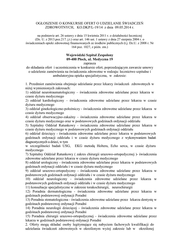 OGŁOSZENIE O KONKURSIE OFERT O UDZIELANIE ŚWIADCZEŃ ZDROWOTNYCH, KO.DKP/L-19/14 z dnia 09.05.2014 r. na podstawie art. 26 ustawy z dnia 15 kwietnia 2011 r. o działalności leczniczej (Dz. U. z 2013.poz.217. j.t.) oraz art. 146 ust. 1 ustawy z dnia 27 sierpnia 2004 r. o świadczeniach opieki zdrowotnej finansowanych ze środków publicznych (t.j. Dz.U. z 2008 r. Nr 164 poz. 1027, z późn. zm.) Wojewódzki Szpital Zespolony 09-400 Płock, ul. Medyczna 19 zaprasza do składania ofert i uczestniczenia w konkursie ofert, poprzedzającym zawarcie umowy o udzielenie zamówienia na świadczenia zdrowotne w rodzaju: lecznictwo szpitalne i ambulatoryjna opieka specjalistyczna, w zakresie: 1. Przedmiot zamówienia obejmuje udzielanie przez lekarzy świadczeń zdrowotnych w niżej wymienionych zakresach: 1) oddział neurotraumatologiczny – świadczenia zdrowotne udzielane przez lekarza w czasie dyżuru medycznego 2) oddział kardiologiczny – świadczenia zdrowotne udzielane przez lekarza w czasie dyżuru medycznego 3) oddział ginekologiczno-położniczy - świadczenia zdrowotne udzielane przez lekarza w czasie dyżuru medycznego 4) oddział obserwacyjno-zakaźny - świadczenia zdrowotne udzielane przez lekarza w czasie dyżuru medycznego oraz w podstawowych godzinach ordynacji oddziału 5) Szpitalny Oddział Ratunkowy - świadczenia zdrowotne udzielane przez lekarza w czasie dyżuru medycznego w podstawowych godzinach ordynacji oddziału 6) oddział dziecięcy - świadczenia zdrowotne udzielane przez lekarza w podstawowych godzinach ordynacji oddziału i w czasie dyżuru medycznego z wykonywaniem badań diagnostycznych u dzieci, w tym w szczególności badań USG, EKG metodą Holtera, Echo serca, w czasie dyżuru medycznego 7) Szpitalny Oddział Ratunkowy ( zakres chirurgii urazowo-ortopedycznej )- świadczenia zdrowotne udzielane przez lekarza w czasie dyżuru medycznego 8) oddział urologiczny - świadczenia zdrowotne udzielane przez lekarza w podstawowych godzinach ordynacji oddziału i w czasie dyżuru medycznego 9) oddział urazowo-ortopedyczny - świadczenia zdrowotne udzielane przez lekarza w podstawowych godzinach ordynacji oddziału i w czasie dyżuru medycznego 10) oddział neurologiczny - świadczenia zdrowotne udzielane przez lekarza w podstawowych godzinach ordynacji oddziału i w czasie dyżuru medycznego 11) konsultacje specjalistyczne w zakresie torakochirurgii, neurochirurgii 12) Poradnia dermatologiczna - świadczenia zdrowotne udzielane przez lekarza w godzinach podstawowej ordynacji Poradni 13) Poradnia stomatologiczna - świadczenia zdrowotne udzielane przez lekarza dentystę w godzinach podstawowej ordynacji Poradni 14) Poradnia neurologii dziecięcej - świadczenia zdrowotne udzielane przez lekarza w godzinach podstawowej ordynacji Poradni 15) Poradnia chirurgii urazowo-ortopedycznej - świadczenia zdrowotne udzielane przez lekarza w godzinach podstawowej ordynacji Poradni 2. Oferty mogą składać osoby legitymujące się nabyciem fachowych kwalifikacji do udzielania świadczeń zdrowotnych w określonym wyżej zakresie lub w określonej wyżej dziedzinie medycyny oraz spełniające warunki art. 18 ust. 1 pkt 1,2,4,5 i ust.2 pkt 2 ustawy z dnia 15 kwietnia 2011 r. o działalności leczniczej (Dz.U. z 2013 r., poz.217 j.t). 3. Warunki udziału w postępowaniu, formularz oferty oraz sposób przeprowadzenia konkursu określone są w Szczegółowych warunkach konkursu ofert na udzielanie świadczeń zdrowotnych, Regulaminie konkursu, Regulaminie pracy Komisji konkursowej, dostępnych na stronie internetowej Zamawiającego (www. wszplock.pl) w zakładce Konkursy ofert. Wyżej wymienione materiały zainteresowani mogą pobrać lub się z nimi zapoznać w siedzibie Zamawiającego, w Dziale Kadr i Płac - pok. 19 ( część Administracja – Budynek główny), w godzinach 8:00 - 14:30. 4. Osoby upoważnione do kontaktów – mgr Krystyna Ekonomiuk-Kieliszek i mgr Bożena Majkowska, tel. 24 36 46 859 5. Oferty należy składać pod rygorem odrzucenia, w formie pisemnej, w zamkniętych kopertach i oznaczonych zgodnie z wzorem wskazanym w Szczegółowych warunkach konkursu ofert na udzielanie świadczeń zdrowotnych, określonych przez WSzZ w Płocku. “Konkurs na udzielanie świadczeń zdrowotnych w Oddziale/Poradni ..........................." 6. Termin składania ofert upływa z dn. 23.05.2014 r. o godz.12:00. Oferta przesłana pocztą będzie potraktowana jako złożona w terminie, jeżeli data stempla pocztowego( data nadania) nie jest późniejsza niż termin składania ofert i wpłynie do siedziby WSzZ w Płocku najpóźniej przed wyznaczonym terminem otwarcia ofert. 7. Otwarcie ofert nastąpi w dniu 23.05.2014 r. o godz. 13:00 w siedzibie Zamawiającego ( p. 19 - Dział Kadr i Płac ). 8. Kryteria oceny ofert stanowią: • cena za jednostkę udzielania świadczeń zdrowotnych (np.godzina, dyżur, procedura, konsultacja, ) • kwalifikacje zawodowe 9. Termin związania ofertą wynosi 30 dni od daty wskazanej jako termin składania ofert. 10. Z wybranymi Wykonawcami zostanie podpisana umowa zgodna w treści ze wzorem załączonym do Szczegółowych warunkach konkursu ofert na udzielanie świadczeń zdrowotnych 11. Planowany termin rozpoczęcia udzielania świadczeń zdrowotnych w siedzibie WSzZ w Płocku przypada na dzień 1 czerwca 2014 r. Okres obowiązywania umowy – 31.05.2015 r. 12. Ogłoszenie rozstrzygnięcia konkursu ofert zostanie umieszczone na stronie internetowej WSzZ w Płocku www.wszplock.pl oraz na Tablicy ogłoszeń w siedzibie WSzZ w Płocku do dnia 26 maja 2014 r. 13. WSzZ w Płocku zastrzega sobie prawo do odwołania konkursu ofert w całości lub części oraz przedłużenia terminu składania ofert i terminu ogłoszenia o rozstrzygnięciu konkursu ofert bez podania przyczyny. 14. Oferentom przysługują środki ochrony prawnej przewidziane w Regulaminie konkursu.