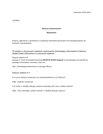 Lubaczów, 29.05.2014 1/Z/2014 Wszyscy zainteresowani Wyjaśnienia Dotyczy: ogłoszenia o zamówieniu na dostawę materiałów biurowych oraz eksploatacyjnych do drukarek i kserokopiarek W związku z otrzymanymi pytaniami wykonawców Zamawiający Samodzielny Publiczny Zakład Opieki Zdrowotnej w Lubaczowie wyjaśnia: Dotyczy zadania nr2, pozycja 11 Toner do drukarki laserowej RICOH SP 3510sf oryginał czy Zamawiający nie pomylił się wpisując w formularzu cenowym ilości szt. Odp.: Zamawiający potwierdza, że wymaga 100 szt. Dotyczy zadania nr 4 Czy są to etykiety termiczne czy termotransferowe czy foliowe? Odp.: Etykiety termiczne Czy kody w obrębie danego zestawu narastają cały czas o jedną wartość? Odp.: Tak, narastają o jedna wartość w obrębie danego zestawu