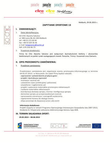 Malbork, 29.05.2015 r. ZAPYTANIE OFERTOWE 13 I. ZAMAWIAJĄCY: 1. Dane identyfikacyjne: SO CHIC Alyosha Sakutov ul. 500-Lecia 98, 82-200 Malbork tel: +48 55 272 60 40 fax: +48 55 620 36 36 e-mail: [email protected] NIP: 579-216-96-73 2. Przedmiot działalności: Firma So Chic Alyosha Sakutov jest wyłącznym dystrybutorem bielizny i akcesoriów bieliźnianych na polski rynek następujących marek: Panache, Trinny i Susannah oraz Damaris. II. OPIS PRZEDMIOTU ZAMÓWIENIA: 1. Przedmiot zamówienia: Przedmiotem zamówienia jest organizacja eventu promocyjno-informacyjnego w terminie 04-05.07.2015r. w Warszawie. Do zadań firmy będzie należało: - zaproszenie i potwierdzenie przybycia gości - projekt i dystrybucja zaproszeń - aranżacja i wystrój sali - ustawienie części prelekcyjnej i pokazowej - oświetlenie i nagłośnienie sali - projekt i wykonanie materiałów promocyjno-reklamowych - rozdanie materiałów reklamowych - koordynacja dostawy sprzętu, montaż i konfiguracja sprzętu - demontaż sprzętu po przeprowadzonym evencie - opracowanie scenariusza i scenografii wydarzenia - zapewnienie hostess do obsługi eventu - ekipa pozostaje do dyspozycji przez cały event Informacje dodatkowe: Projekt wsparty w ramach Programu Operacyjnego Innowacyjna Gospodarka lata 2007-2013, Działanie 8.2 Wspieranie wdrażania elektronicznego biznesu typu B2B. III. TERMIN SKŁADANIA OFERT: 29.05.2015 – 08.06.2015 str. 1 IV. OPIS SPOSOBU SKŁADANIA OFERT: Oferta powinna zwierać: Datę i miejsce sporządzenia Nazwę, adres, numer telefonu i numer NIP oferenta Cenę usługi Datę ważności oferty Podpis osoby upoważnionej do sporządzenia oferty. Lata funkcjonowania na rynku Oferta powinna być przesłana za pośrednictwem: poczty elektronicznej na adres: [email protected], poczty tradycyjnej lub dostarczona osobiście na adres: SO CHIC Alyosha Sakutov, ul. ul. 500-lecia 98, 82-200 Malbork. V. PROCEDURA WYBORU OFERT: Kryteria wyboru ofert: Cena - 60 % Doświadczenie (lata funkcjonowania na rynku) – 10% Kompleksowość oferty – 30% Ocena ofert nastąpi do dnia 09.06.2014r. str. 2