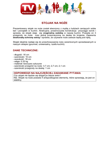 STOJAK NA NOŻE Prezentowany stojak na noże został stworzony z myślą o ludziach ceniących sobie ład i porządek w kuchni. Atrakcyjna, przeźroczysta konstrukcja przyciąga wzrok i sprawia, że stojak staje się oryginalną ozdobą w naszej kuchni. Posiada on 3 przegrody na noże oraz jedną przeznaczoną na deskę do krojenia. Zapewnia doskonałą ochronę ostrzy i sprawia, że używane noże zawsze będą pod ręką. Stojak idealnie nadaje się do przechowywania noży ceramicznych sprzedawanych w naszym sklepie (gourmet, uniwersalny, szefa kuchni). DANE TECHNICZNE: - długość: 16 cm - szerokość: 10 cm - wysokość: 18 cm - waga: 0.32 kg - materiał: tworzywo sztuczne - szerokość przegród na noże: 3,7 cm; 2,7 cm; 2,1 cm - szerokość przegrody na deskę: 1 cm ODPOWIEDZI NA NAJCZĘŚCIEJ ZADAWANE PYTANIA Czy stojak nie będzie się ślizgał po blacie stołu? Nie. Stojak na noże posiada 4 antypoślizgowe elementy, które sprawiają, że jest on stabilny.