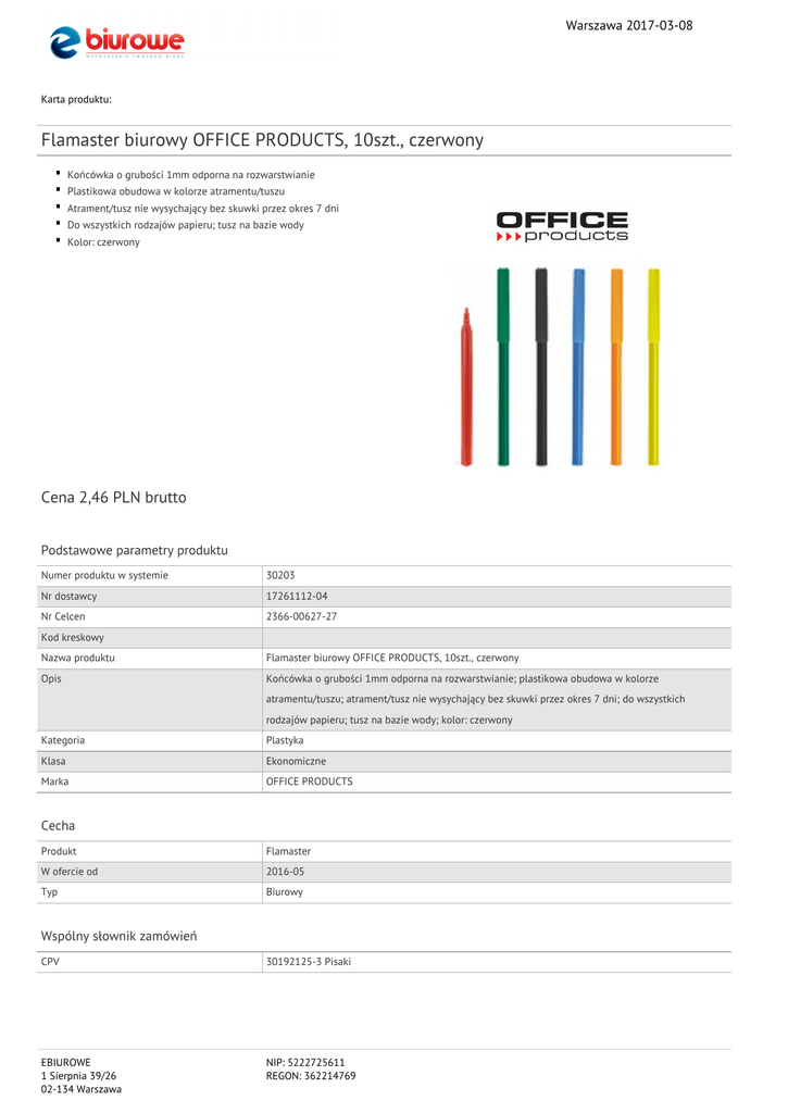 Warszawa 2017-03-08 Karta produktu: Flamaster biurowy OFFICE PRODUCTS, 10szt., czerwony Końcówka o grubości 1mm odporna na rozwarstwianie Plastikowa obudowa w kolorze atramentu/tuszu Atrament/tusz nie wysychający bez skuwki przez okres 7 dni Do wszystkich rodzajów papieru; tusz na bazie wody Kolor: czerwony Cena 2,46 PLN brutto Podstawowe parametry produktu Numer produktu w systemie 30203 Nr dostawcy 17261112-04 Nr Celcen 2366-00627-27 Kod kreskowy Nazwa produktu Flamaster biurowy OFFICE PRODUCTS, 10szt., czerwony Opis Końcówka o grubości 1mm odporna na rozwarstwianie; plastikowa obudowa w kolorze atramentu/tuszu; atrament/tusz nie wysychający bez skuwki przez okres 7 dni; do wszystkich rodzajów papieru; tusz na bazie wody; kolor: czerwony Kategoria Plastyka Klasa Ekonomiczne Marka OFFICE PRODUCTS Cecha Produkt Flamaster W ofercie od 2016-05 Typ Biurowy Wspólny słownik zamówień CPV 30192125-3 Pisaki EBIUROWE 1 Sierpnia 39/26 02-134 Warszawa NIP: 5222725611 REGON: 362214769 Warszawa 2017-03-08 Karta katalogowa produktu cd. Flamaster biurowy OFFICE PRODUCTS, 10szt., czerwony Certyfikaty Nowy produkt w ofercie Standard Hit Standard Kolor Kolor Czerwony Serdecznie zapraszamy do współpracy EBIUROWE zespół. EBIUROWE 1 Sierpnia 39/26 02-134 Warszawa NIP: 5222725611 REGON: 362214769