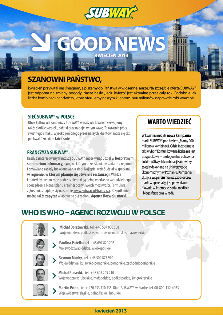 GOOD NEWS KWIECIEŃ 2013 SZANOWNI PAŃSTWO, kwiecień przywitał nas śniegiem, a piszemy do Państwa w wiosennej aurze. Na szczęście oferta SUBWAY® jest odporna na zmiany pogody. Nasze hasło „Jedź świeżo” jest aktualne przez cały rok. Podobnie jak liczba kombinacji sandwiczy, które oferujemy naszym klientom. 900 milionów naprawdę robi wrażenie! SIEĆ SUBWAY® w POLSCE Obok kultowych sandwiczy SUBWAY® w naszych lokalach serwujemy także słodkie wypieki, sałatki oraz napoje, w tym kawę. Ta ostatnia prócz świetnego smaku, wysoko cenionego przez naszych klientów, może się też pochwalić znakiem fair trade. FRANCZYZA SUBWAY® Każdy zainteresowany franczyzą SUBWAY® może wziąć udział w bezpłatnym seminarium informacyjnym, na którym przedstawiane są dane z regionu i omawiane zasady funkcjonowania sieci. Najlepiej wziąć udział w spotkaniu w regionie, w którym planuje się otwarcie restauracji. Wiedza i materiały dostarczone podczas niego dają pełną wiedzę do samodzielnego sporządzenia biznes planu i realnej oceny swoich możliwości. Formularz zgłoszenia znajduje się na stronie www.subway.pl/franczyza. O spotkanie można także zapytać właściwego dla regionu Agenta Rozwoju marki. WARTO WIEDZIEĆ W kwietniu ruszyła nowa kampania marki SUBWAY® pod hasłem„Mamy 900 milionów kombinacji. Gdzie indziej masz taki wybór” Komunikowana liczba nie jest przypadkowa – profesjonalne obliczenia ilości możliwych kombinacji sandwiczy zostały dokonane na Uniwersytecie Ekonomicznym w Poznaniu. Kampania, służąca wsparciu franczyzobiorców marki w sprzedaży, jest prowadzona głownie w Internecie, social mediach i blogosferze oraz w radiu. WHO IS WHO – AGENCI ROZWOJU W POLSCE Michał Dorszewski, tel. +48 507 000 508 Województwa: podlaskie, warmińsko-mazurskie, mazowieckie Paulina Patelka, tel. +48 697 829 296 Województwa: łódzkie, wielkopolskie Szymon Mudry, tel. +48 509 877 970 Województwa: kujawsko-pomorskie, pomorskie, zachodniopomorskie Michał Piasecki, tel. +48 608 205 210 Województwa: lubelskie, małopolskie, podkarpackie, świętokrzyskie Martin Princ, tel.+ 420 233 310 135, Biuro SUBWAY® w Pradze, tel. 00-800-112-4063 Województwa: śląskie, dolnośląskie, lubuskie kwiecień 2013 PISZĄ O NAS www.wirtualnemedia.pl kwiecień 2013